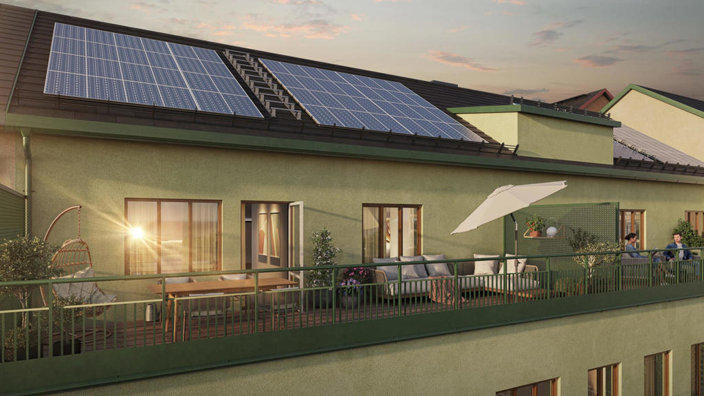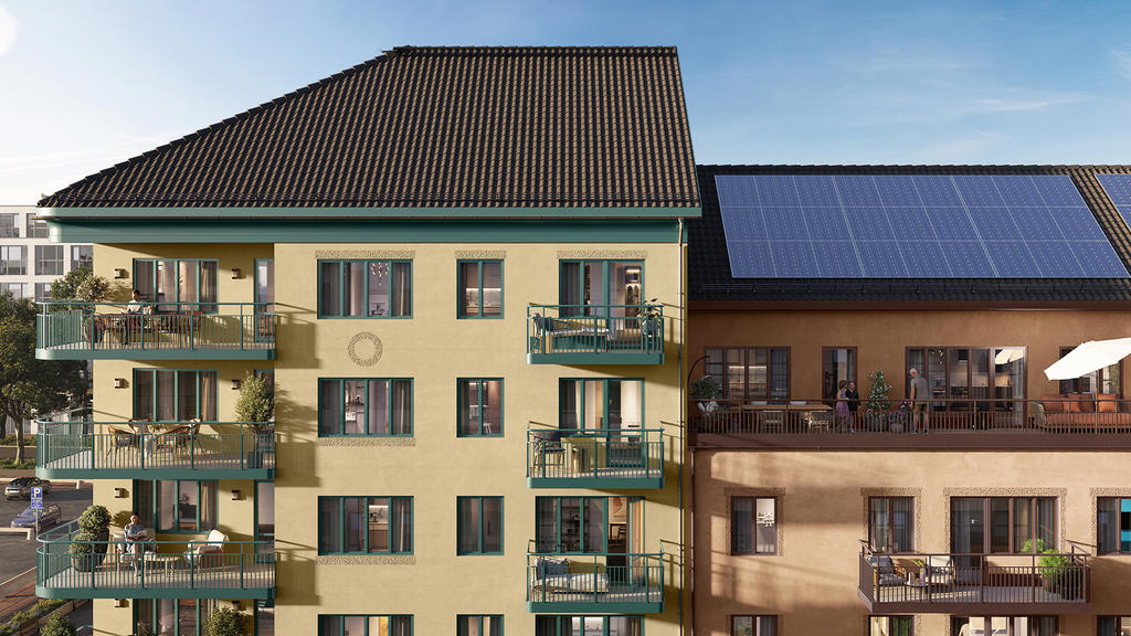 Ljus social gavelfyra med dubbla balkonger, köksö och vinkyl. Här får livet guldkant.