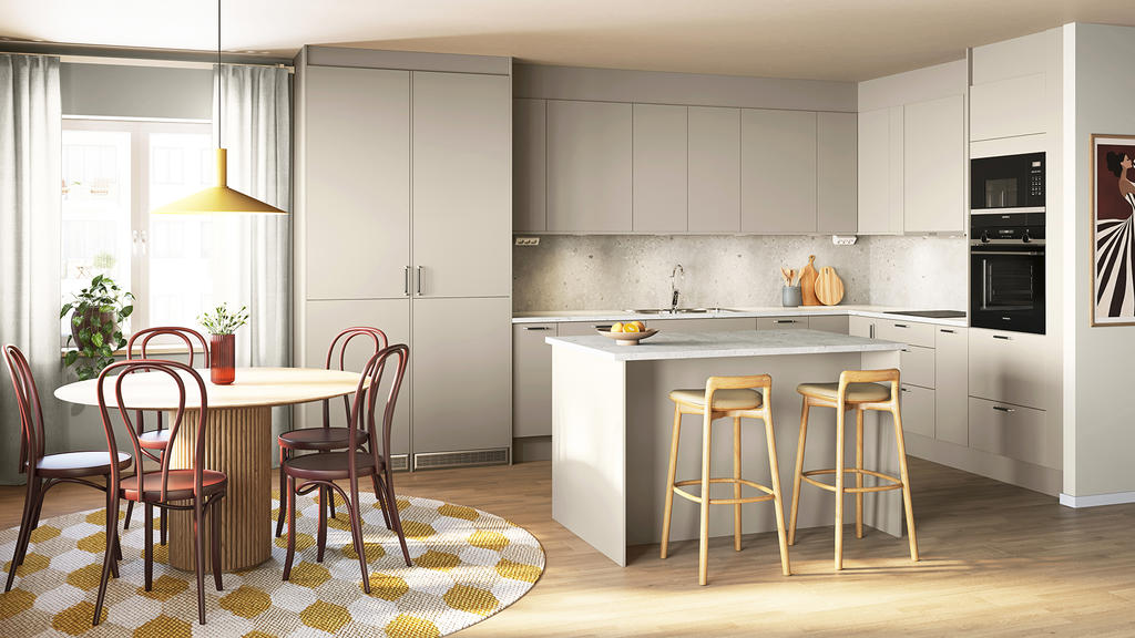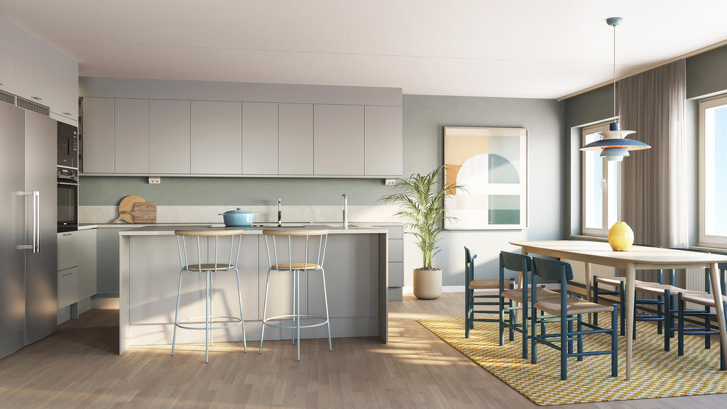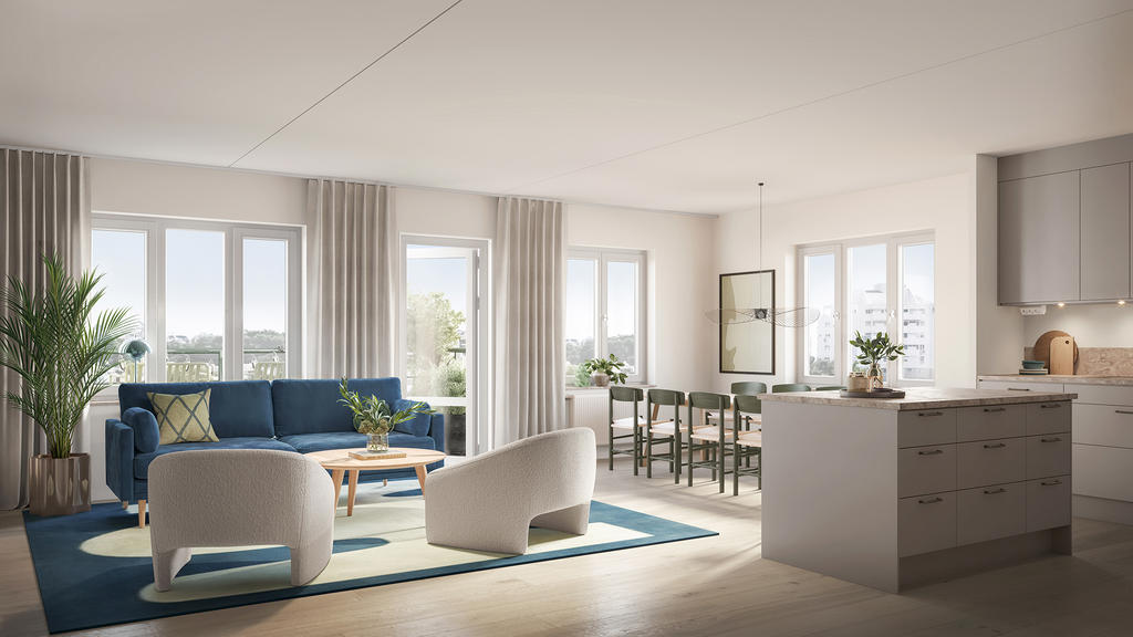 Det gemensamma köket och vardagsrummet går i vinkel och är ett inbjudande rum, som gjort för att ha stora härliga middagar med många gäster och att låta hela familjen få ta plats i vardagen. Den öppna planlösningen ger rummet en social trevlig karaktär och låter ljuset flöda in i varje vrå från de generösa fönstren mot söder respektive väster. Det stora vinkelköket har fönster över diskbänken, och är utrustat med vinkyl, och köksön har spishäll med bänkintegrerad köksfläkt. Det är detaljer som verkligen gör skillnad. Utanför rummet breder den stora balkongen ut sig mot söder. Här kan du inreda med en matplats, sköna stolar och krukor för att njuta av utsikten och solen under sommaren.