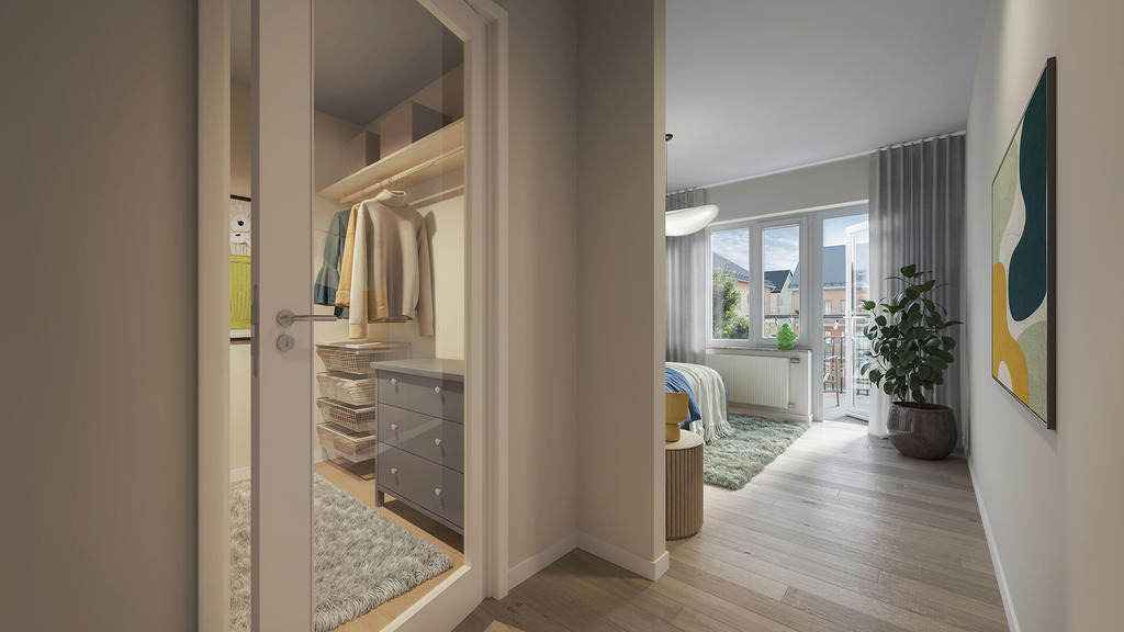 Bostadsrättens större sovrum har en fin rymd och två fönster mot väster. Här har du utsikt över den äldre delen av bebyggelsen i omgivningen, och under sommarhalvåret får rummet ljuvlig kvällssol. Här finns gott om förvaring i en stor skjutdörrsgarderob med linneskåp. De två mindre sovrummen har fina ljusa lägen, och här kan du självklart inreda med skrivbord för att få ett trevligt hemmakontor. Det ena rummet har utgång till hemmets andra balkong i soligt söderläge – en perfekt plats att starta helgen med en kopp kaffe och morgonnyheterna.