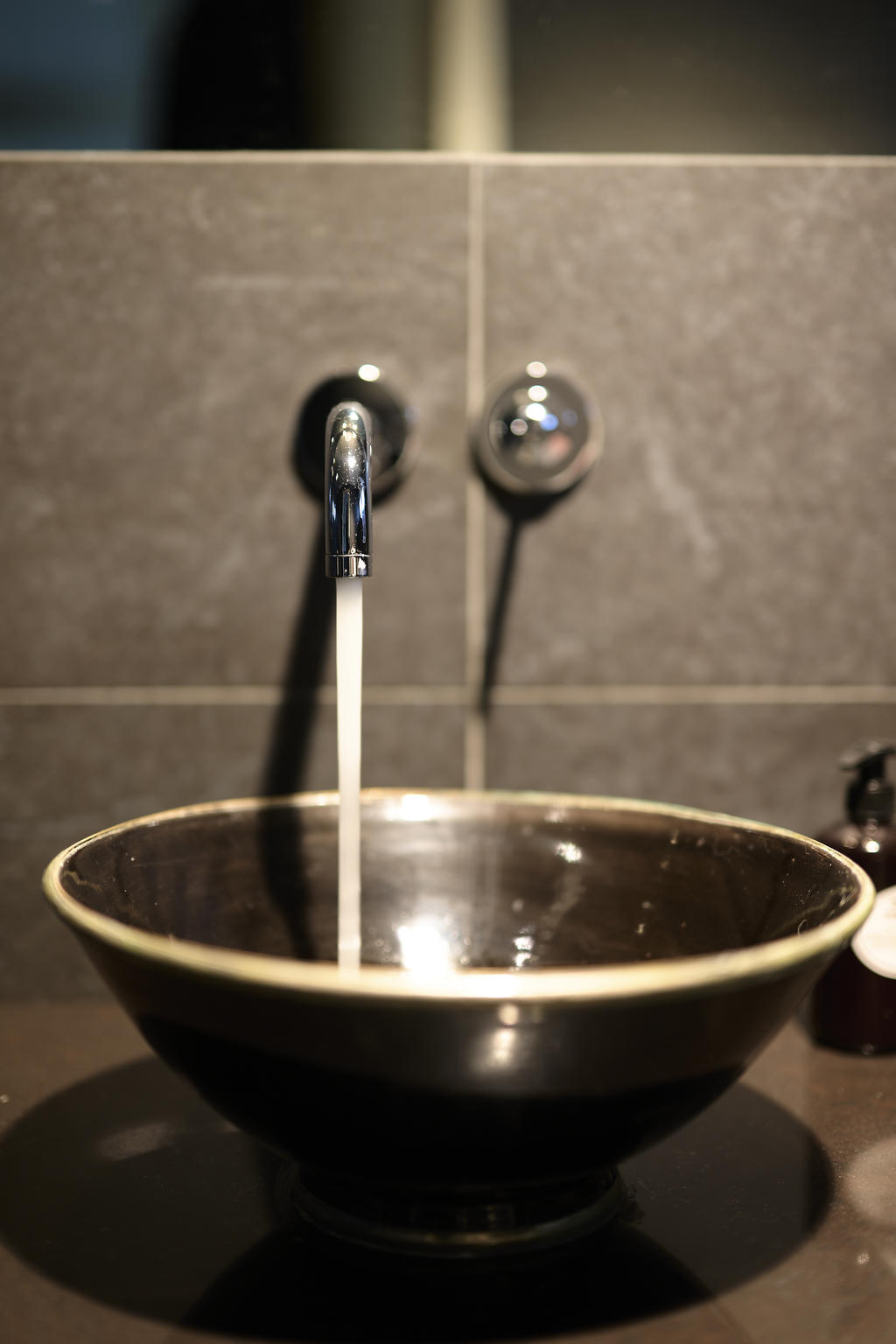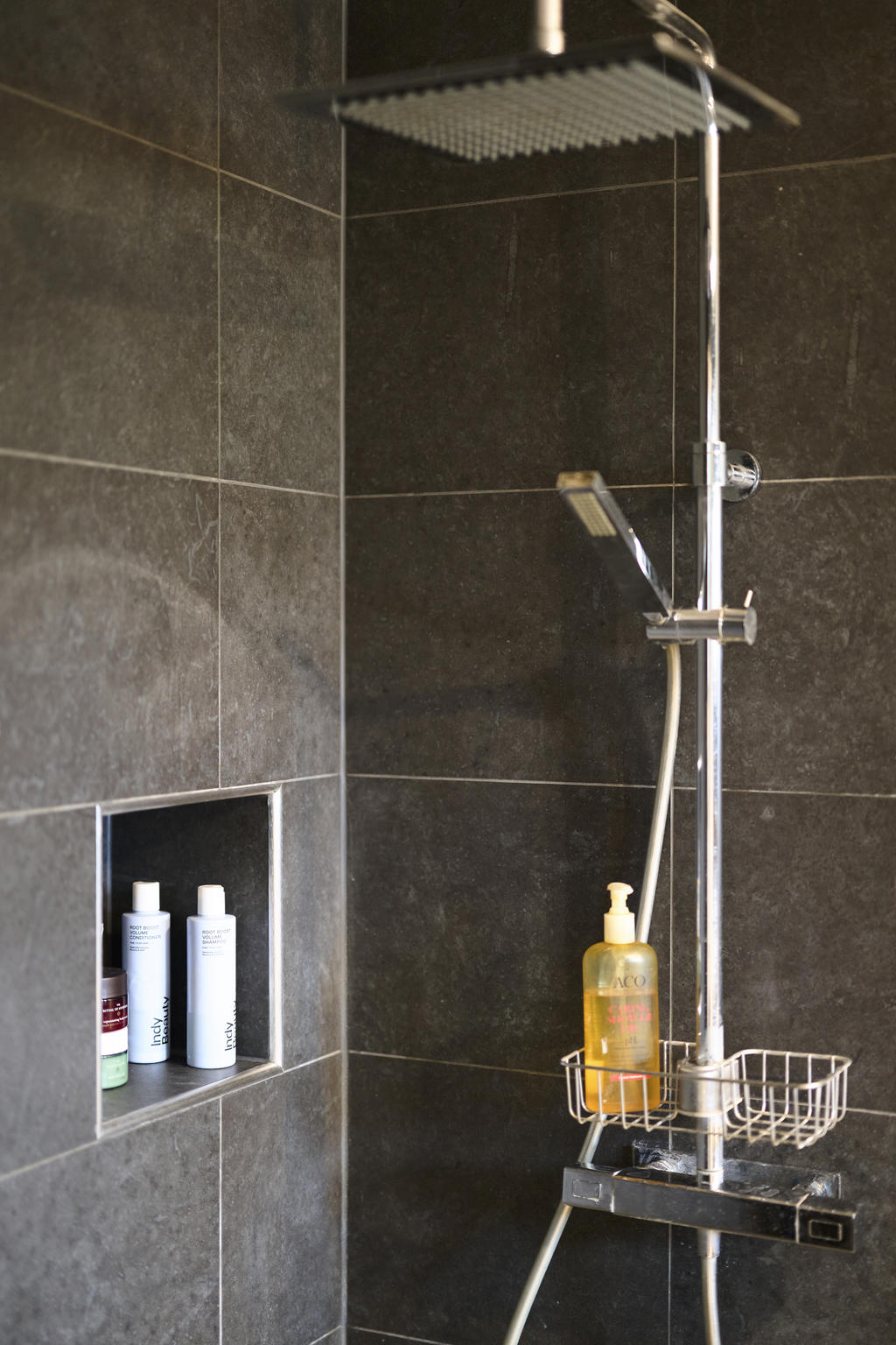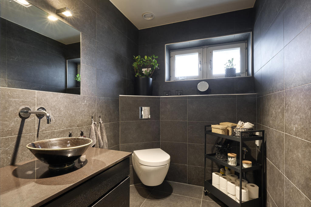 Badrummet är stilfullt renoverat i mörkbruna toner som skapar en varm och exklusiv känsla. Här får du en lyxig spa-atmosfär med noggrant utvalda material – en plats att koppla av och ladda om i vardagen.