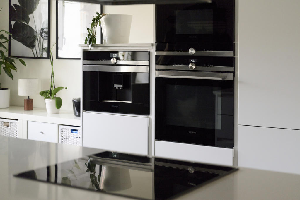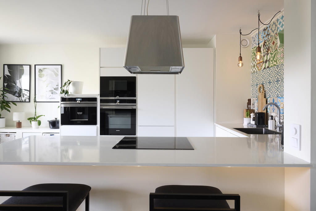 Det stilrena köket är smakfullt renoverat med fokus på både design och funktion. Den centralt placerade köksön blir en självklar samlingsplats för både vardag och sociala tillställningar. Här finns induktionshäll med en elegant frihängande fläkt ovanför, vilket förstärker den moderna känslan. Köket är dessutom utrustat med inbyggd espressomaskin, generösa arbetsytor och gott om förvaring – perfekt för den matlagningsintresserade.