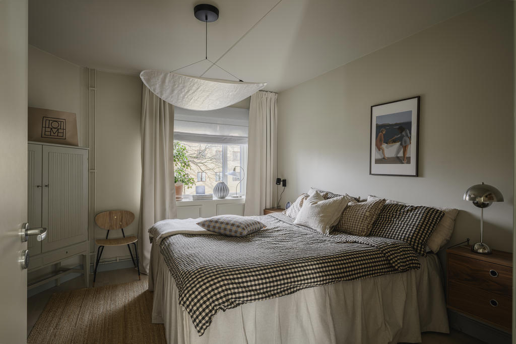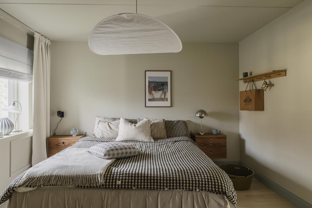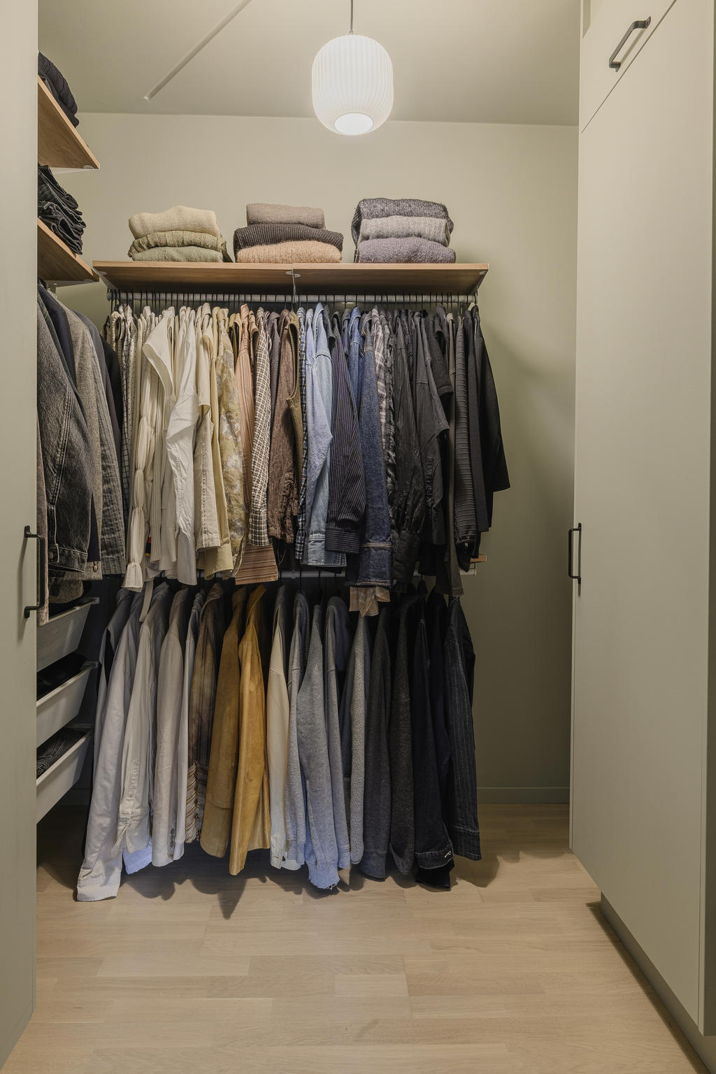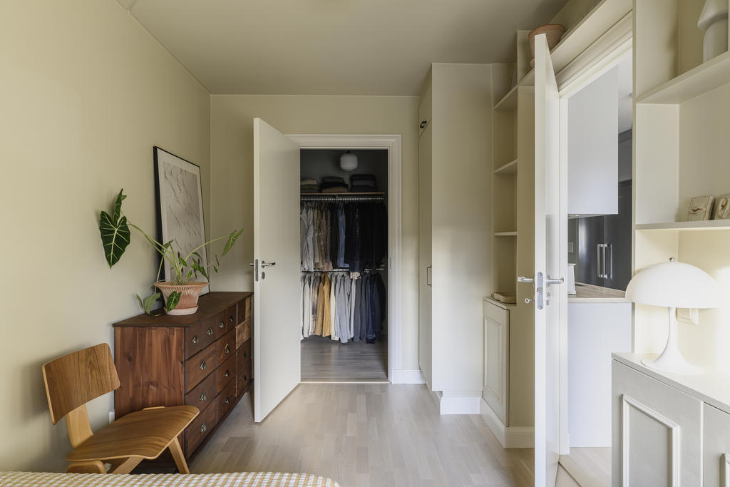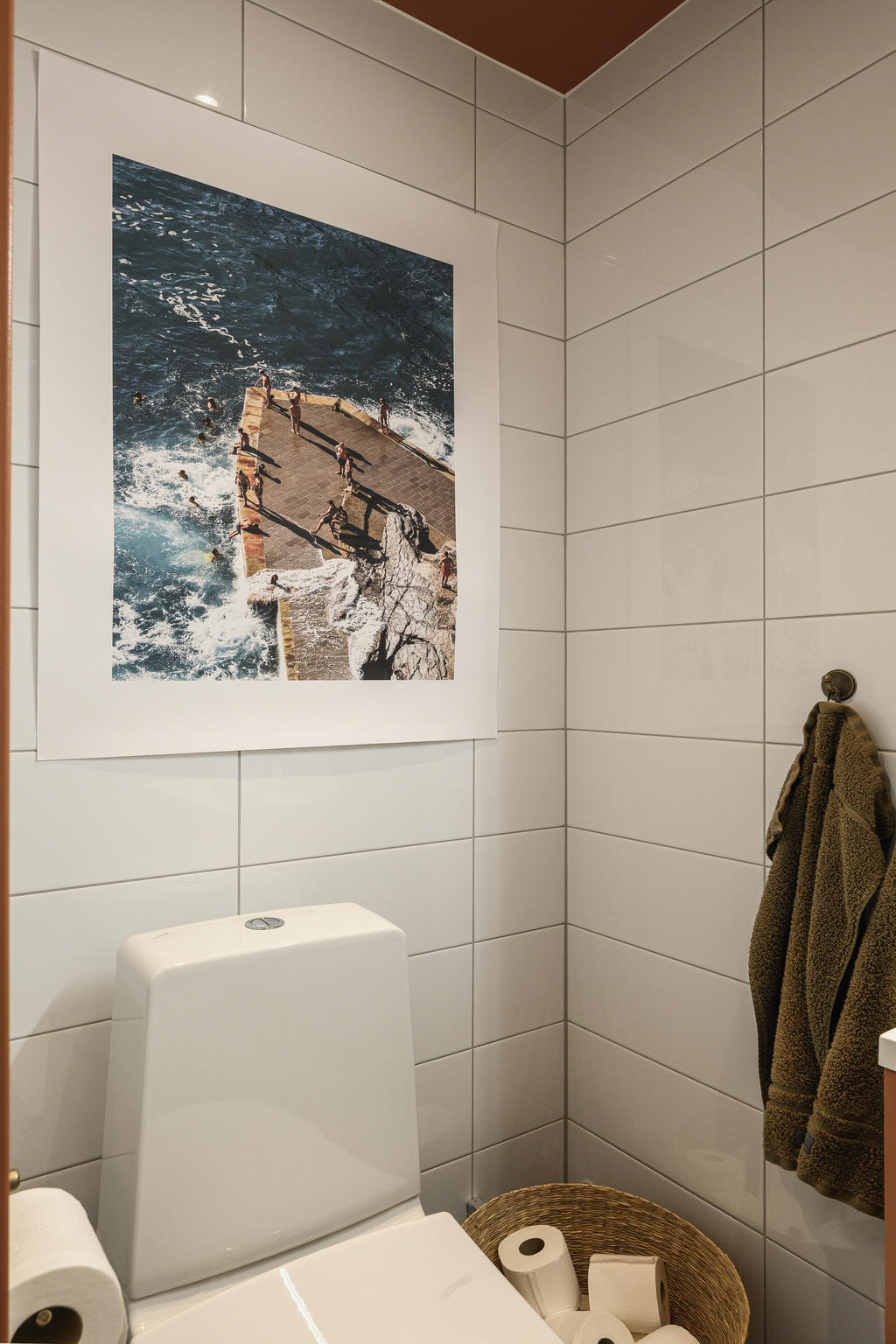 Bostaden erbjuder två rymliga och rofyllda sovrum, båda med generösa förvaringsmöjligheter. Här finns platsbyggda garderober och en måttanpassad bokhylla som både effektiviserar ytan och förstärker den genomgående känslan av genomtänkt design. Det helkaklade badrummet håller samma höga nivå med moderna material, stilrena val och en praktisk tvättdel. Utöver detta finns en gäst-WC – en uppskattad bonus som gör vardagen betydligt smidigare.