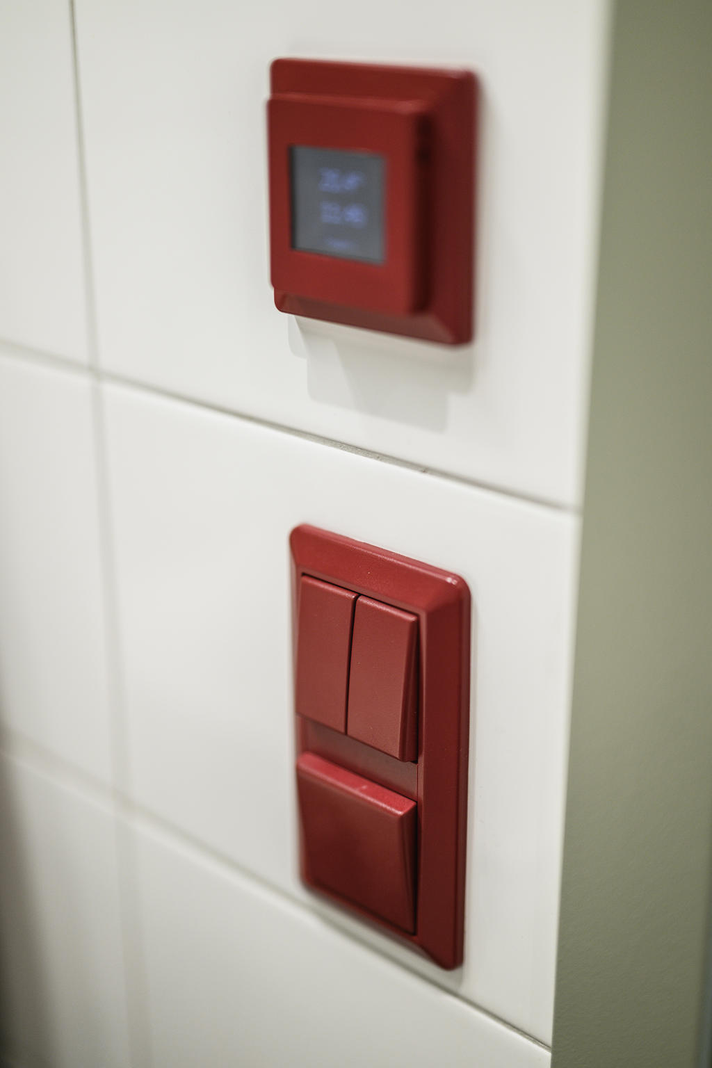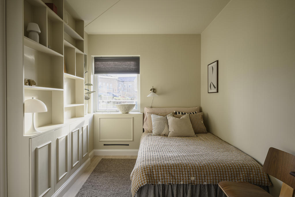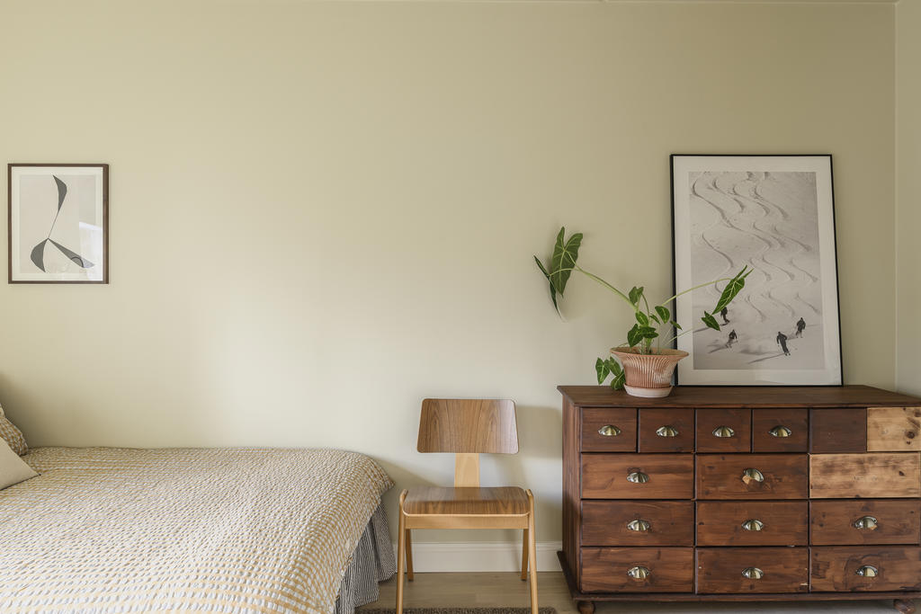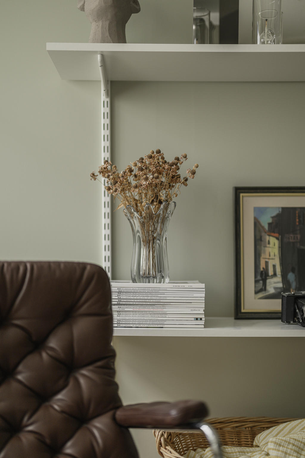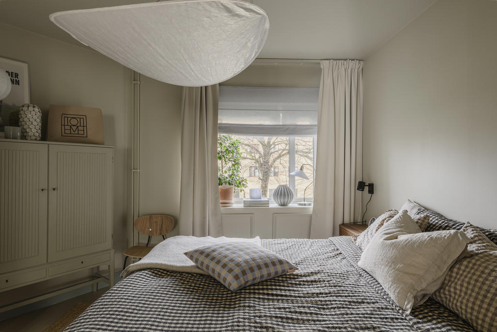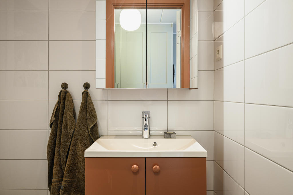 Bostaden erbjuder två rymliga och rofyllda sovrum, båda med generösa förvaringsmöjligheter. Här finns platsbyggda garderober och en måttanpassad bokhylla som både effektiviserar ytan och förstärker den genomgående känslan av genomtänkt design. Det helkaklade badrummet håller samma höga nivå med moderna material, stilrena val och en praktisk tvättdel. Utöver detta finns en gäst-WC – en uppskattad bonus som gör vardagen betydligt smidigare.