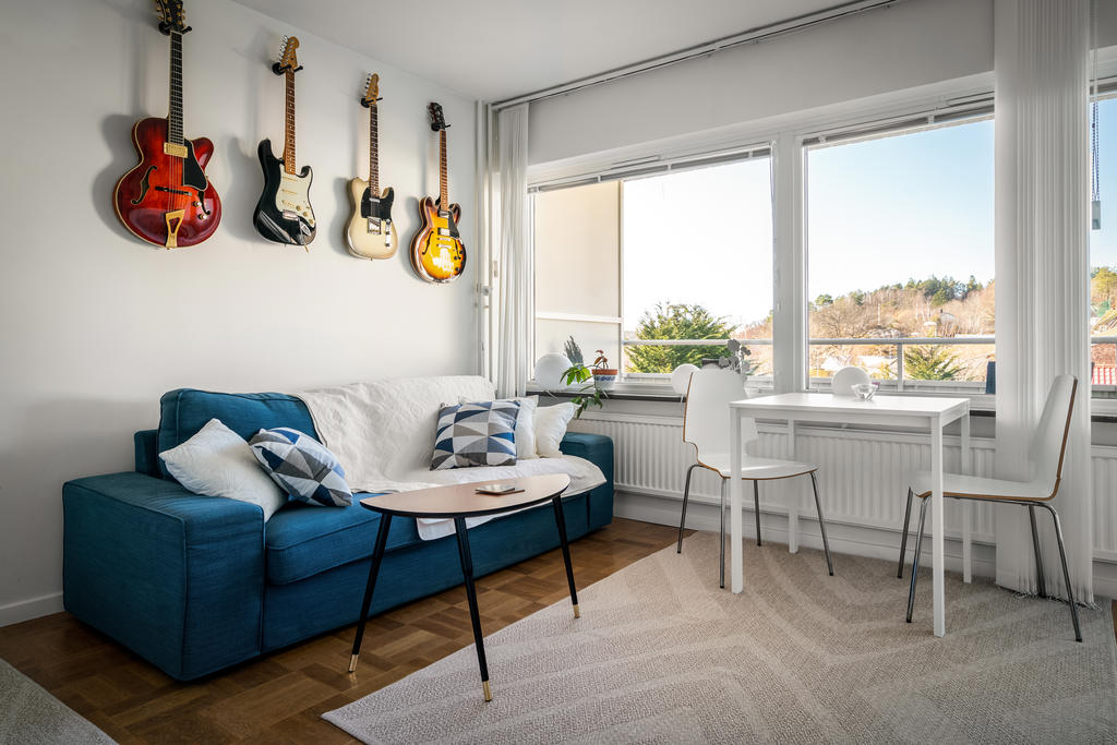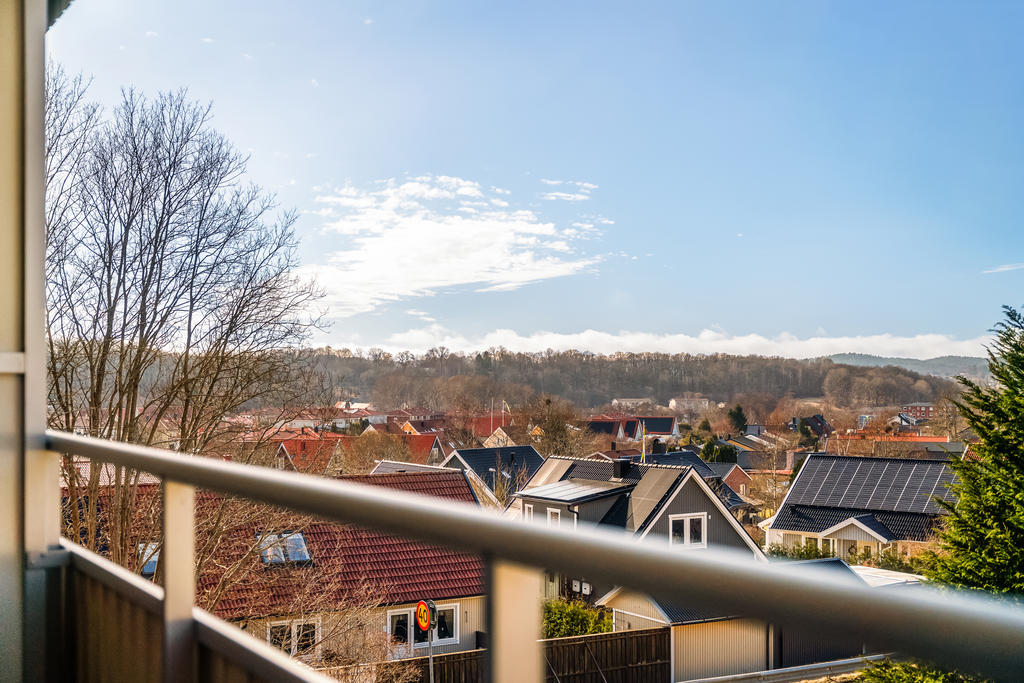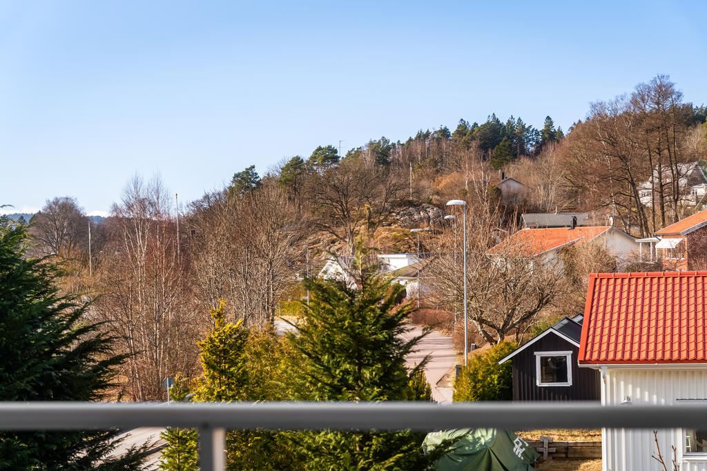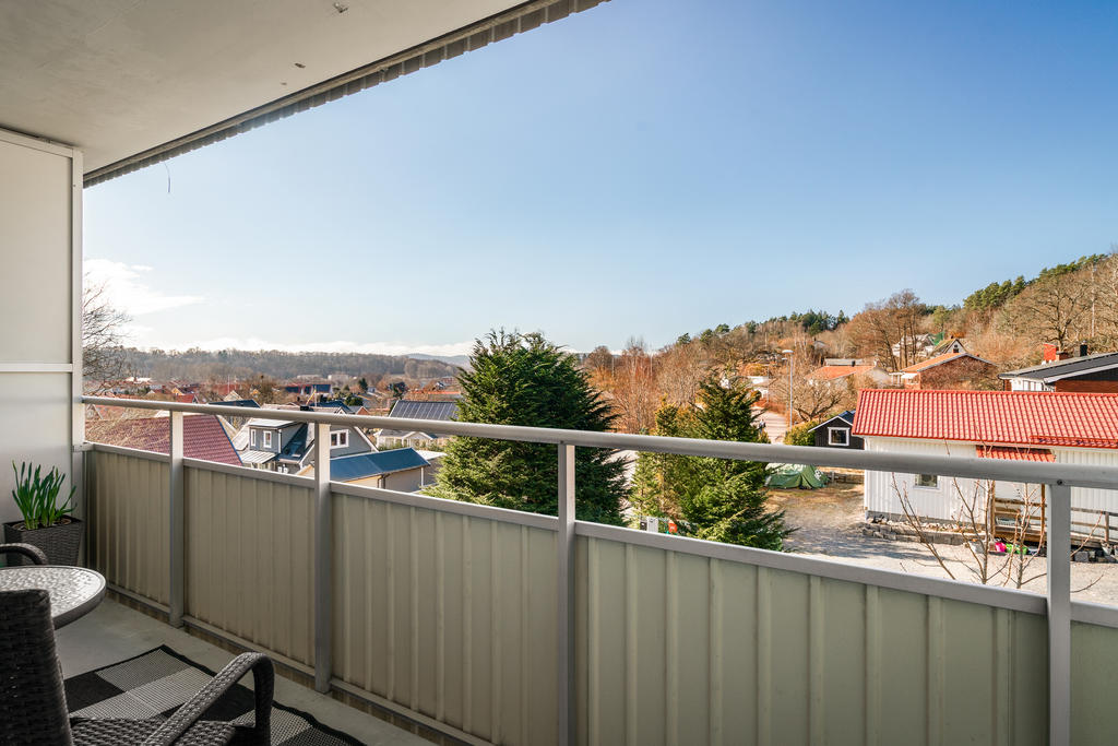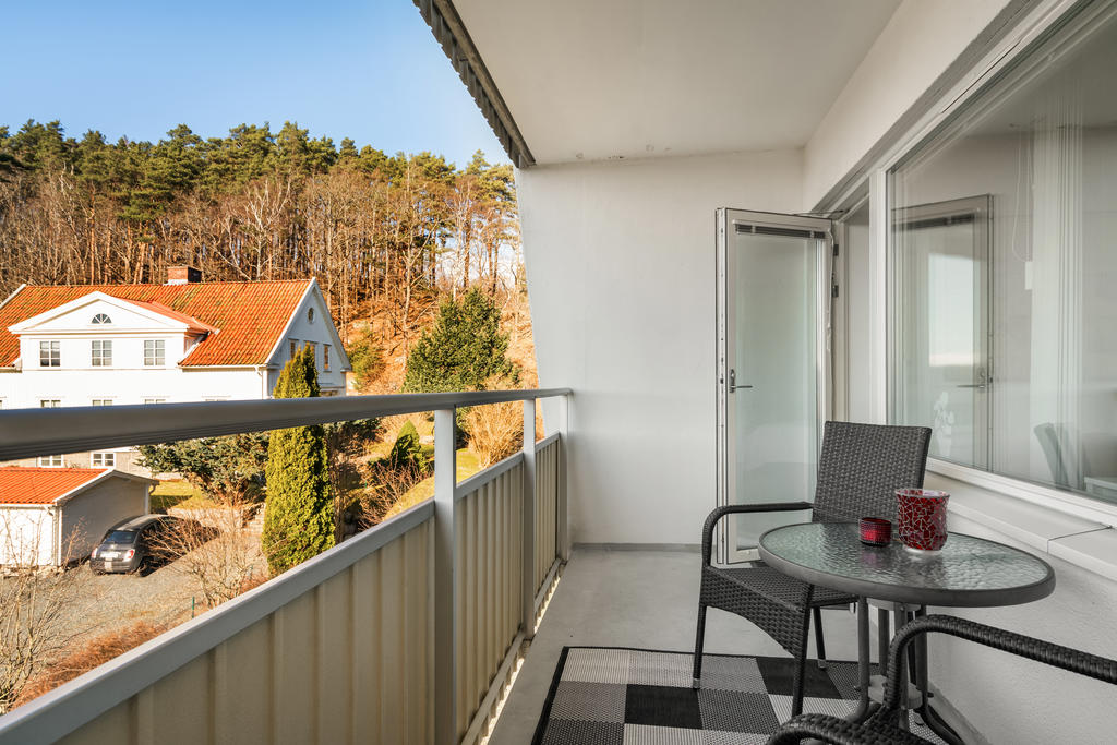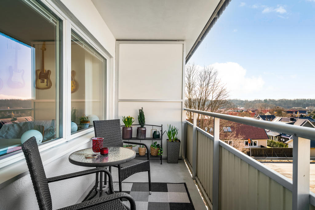 Från allrummet nås bostadens balkong, ett härligt extrarum under årets varmare månader. Här kan du njuta av morgonkaffet eller koppla av i solen. Den stora balkongen erbjuder en fantastisk plats att koppla av på med utsikt över skogen, villakvarteren och horisonten. Här sitter du ostört och kan njuta av eftermiddagens och kvällens sista solstrålar.