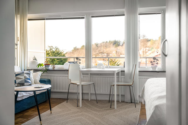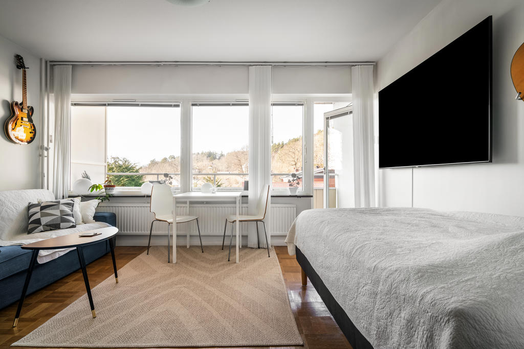 Redan vid entrén möts du av en praktisk hall med goda förvaringsmöjligheter i flera garderober. Vidare in öppnar bostaden upp sig mot ett ljust och luftigt allrum med ett generöst ljusinsläpp som skapar en trivsam atmosfär. Här finns gott om plats för både säng, soffgrupp och matplats, en flexibel yta som enkelt anpassas efter dina behov.