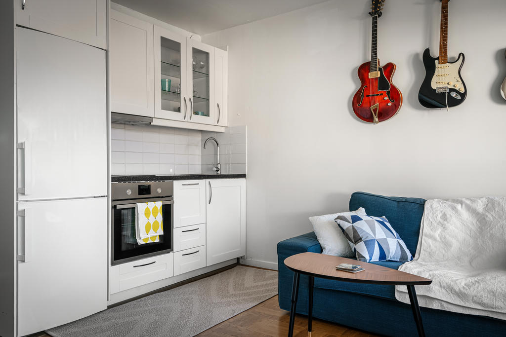 Det stilrena köket är smakfullt integrerat och erbjuder bra arbetsytor samt god förvaring bakom ljusa skåpluckor. Här finns allt du behöver för att laga såväl vardagsmiddagar som trevliga helgmiddagar. Intill köket finns en naturlig plats för matbord.