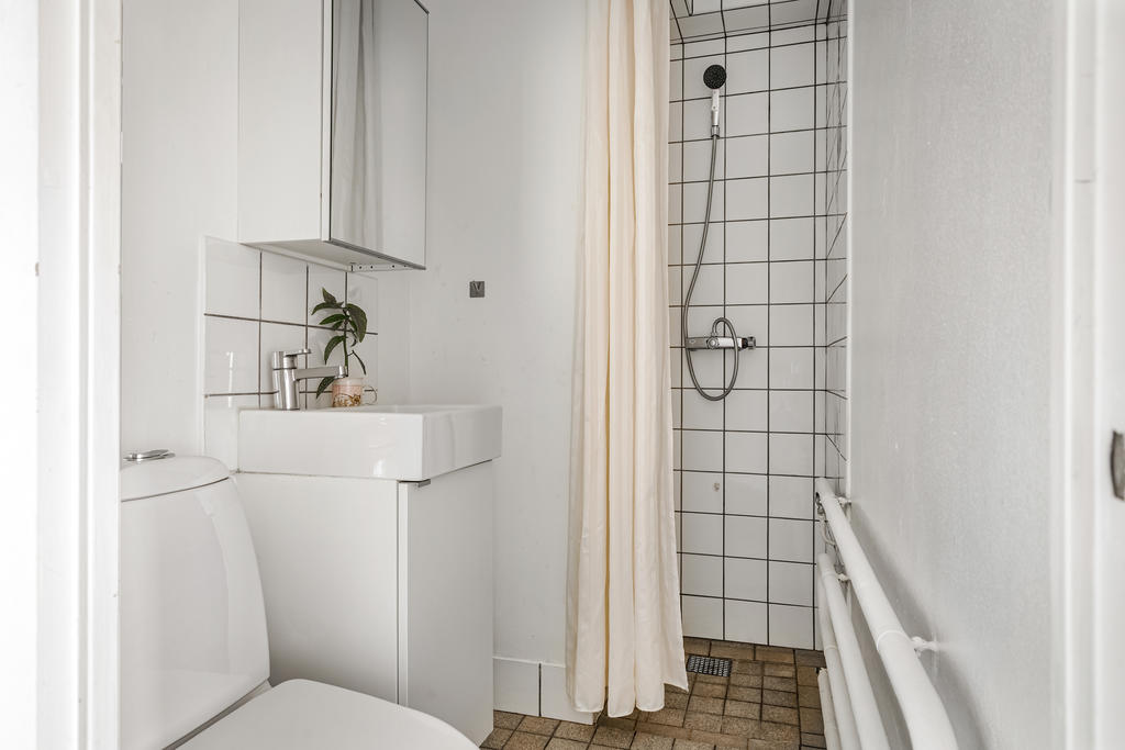 Badrummet är funktionellt planerat med dusch, wc och handfat i en tidlös design.