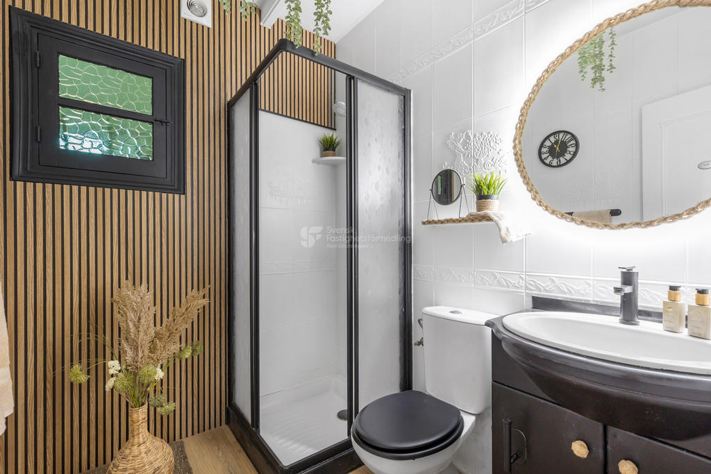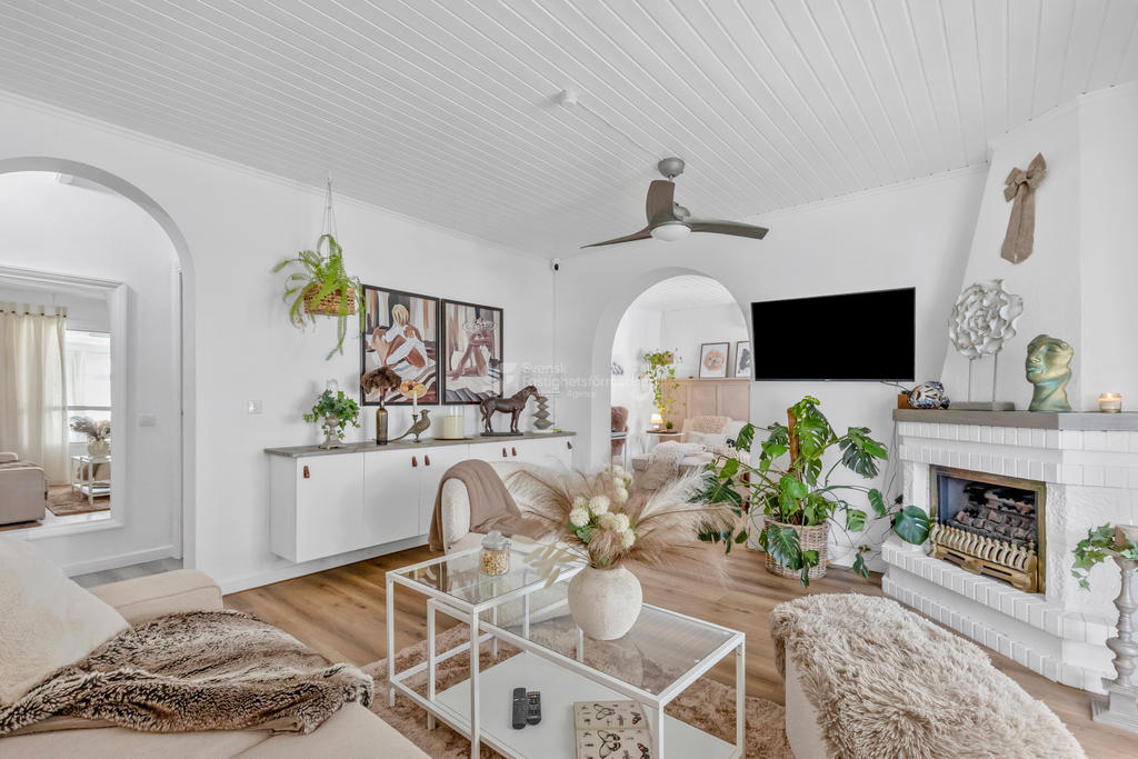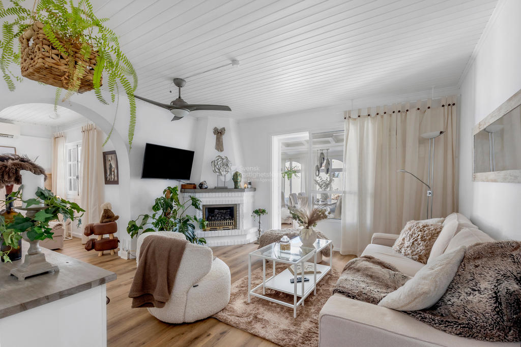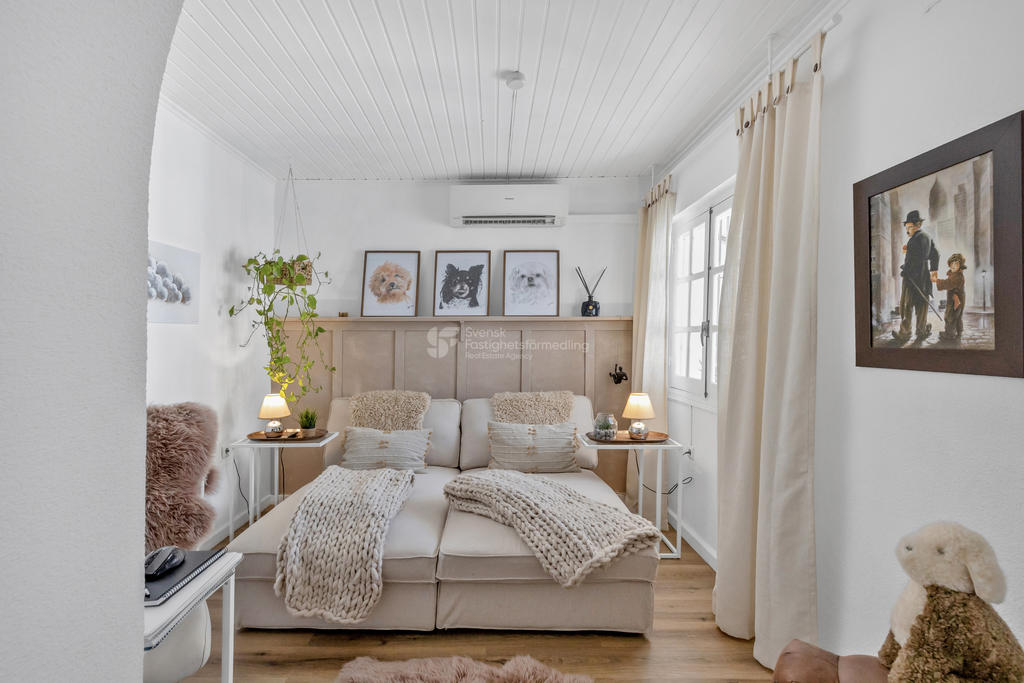 Huset erbjuder 4 stora sovrum och 2 badrum, varav ena badrummet är utrustat med golvvärme. Här finns fullt utrustat kök, liten tvättstuga, extra pentry samt två separata ingångar – perfekt för generationsboende eller för att dela upp bostaden vid uthyrning. Vardagsrum och ett ljust uterum skapar generösa och trivsamma sällskapsytor året runt.