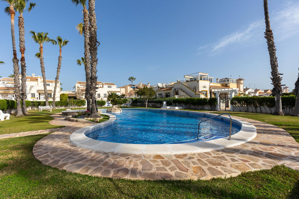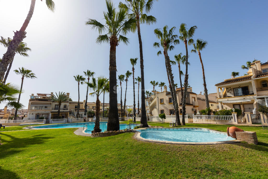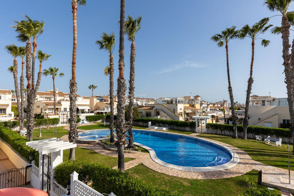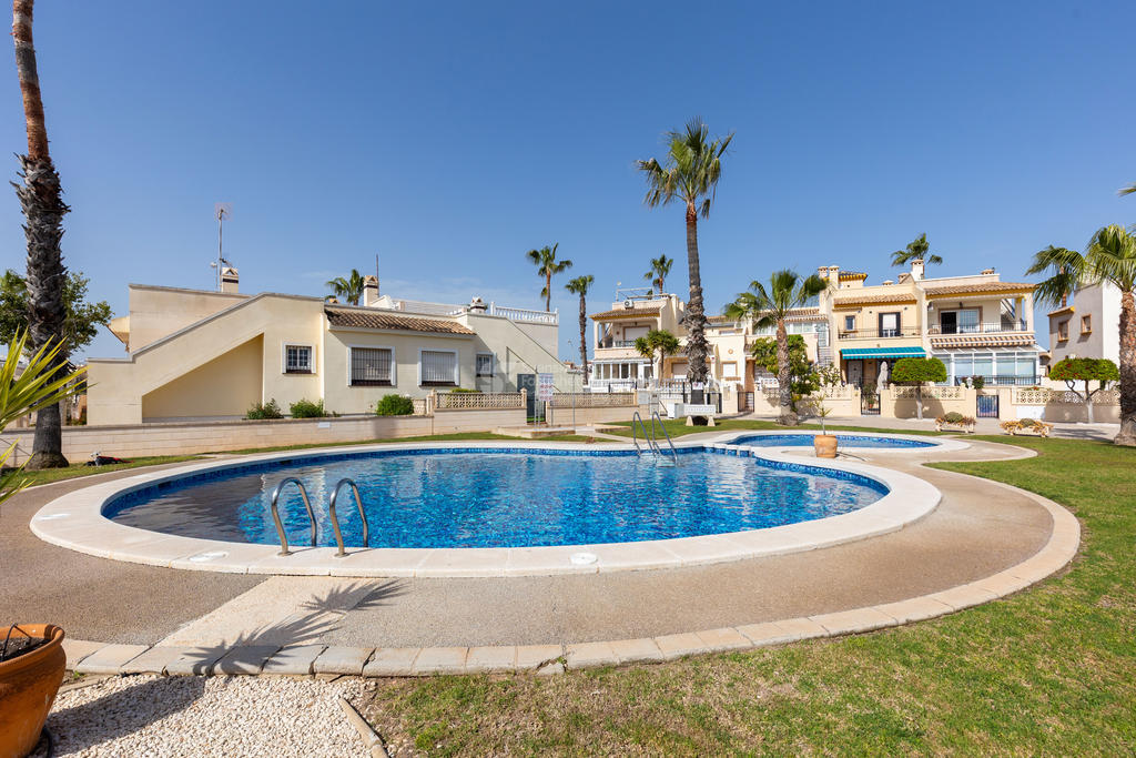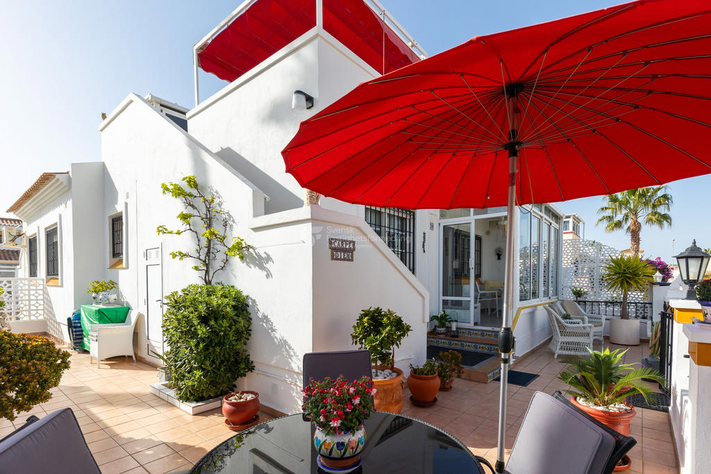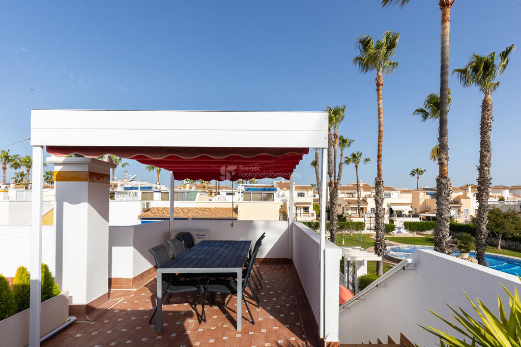 Upptäck ditt drömboende i hjärtat av Playa Flamenca, Orihuela Costa. Detta charmiga radhus erbjuder en unik möjlighet att njuta av det bästa av både semester och året runt-boende. Med fyra rymliga rum varav tre är sovrum, två badrum och en inbjudande takterrass med sol och vacker poolutsikt har du alla förutsättningar att skapa minnesvärda stunder under den spanska solen.