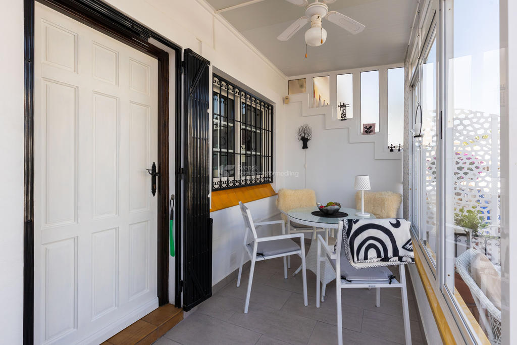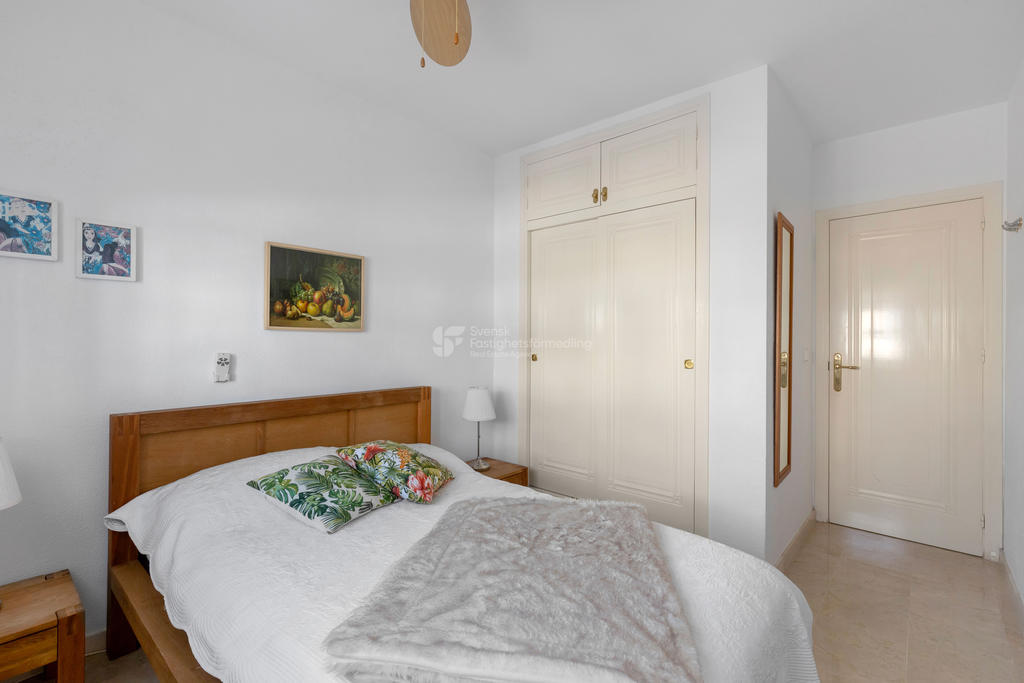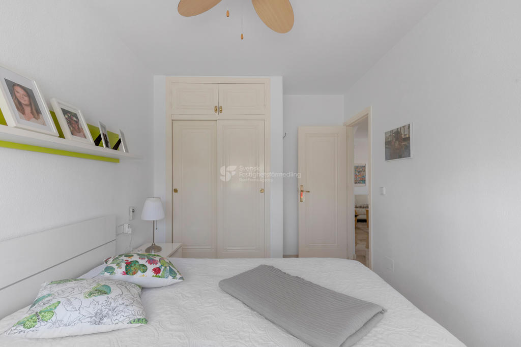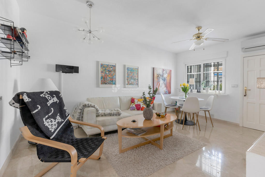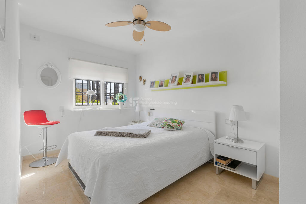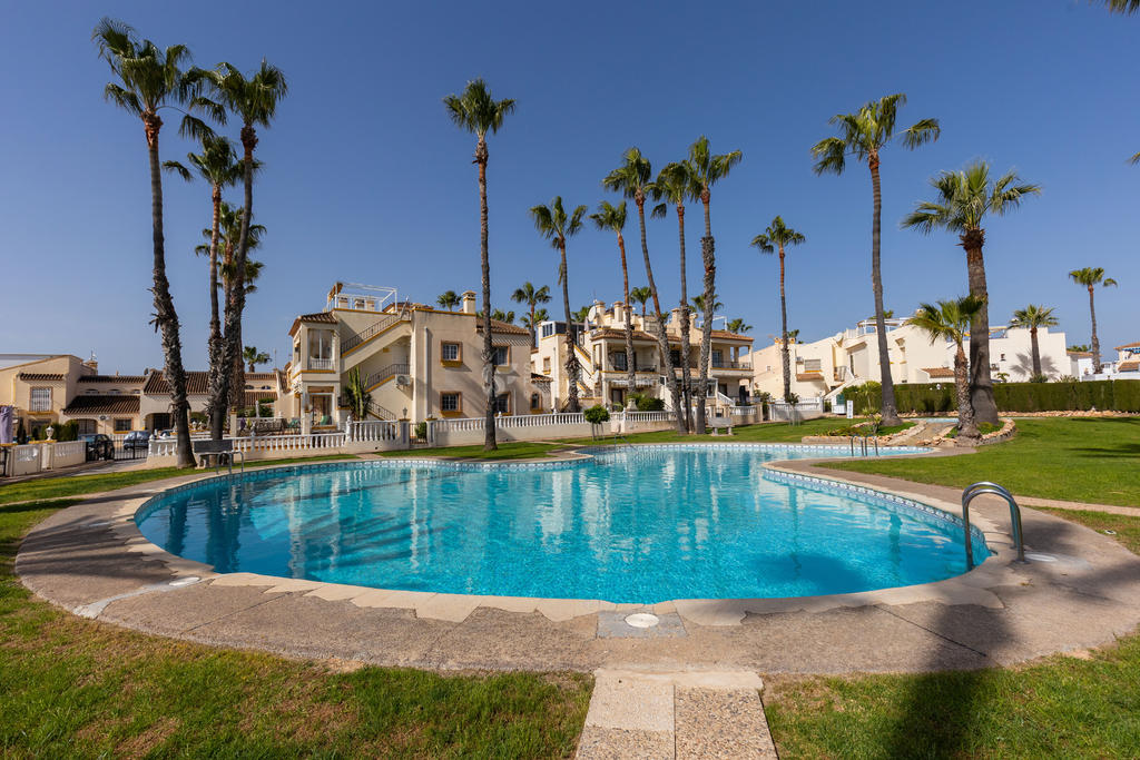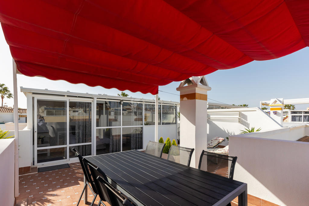 Upptäck ditt drömboende i hjärtat av Playa Flamenca, Orihuela Costa. Detta charmiga radhus erbjuder en unik möjlighet att njuta av det bästa av både semester och året runt-boende. Med fyra rymliga rum varav tre är sovrum, två badrum och en inbjudande takterrass med sol och vacker poolutsikt har du alla förutsättningar att skapa minnesvärda stunder under den spanska solen.