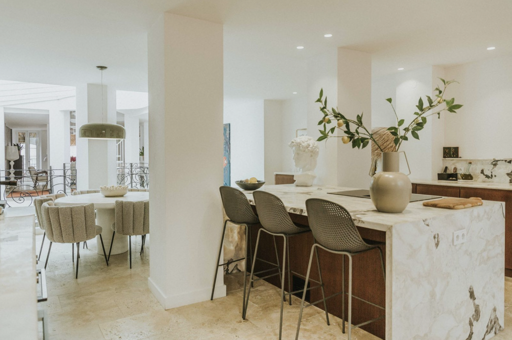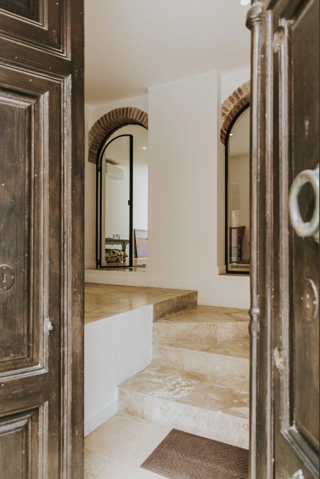 The townhouse offers a total built area of 319 m², distributed over three floors, and features three spacious bedrooms and three bathrooms. The recent renovation has been carefully executed by an interior designer, achieving a harmonious blend of modern comfort and original architectural elements. Features such as exposed wooden beams, natural stone details, and wrought iron accents have been preserved and seamlessly integrated into a refined, modern aesthetic.