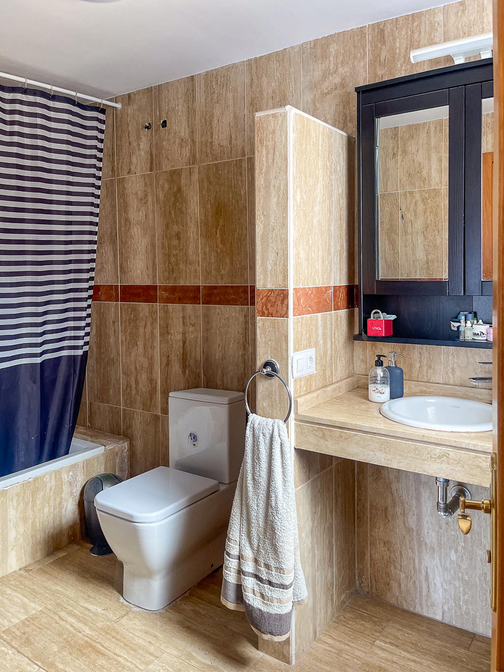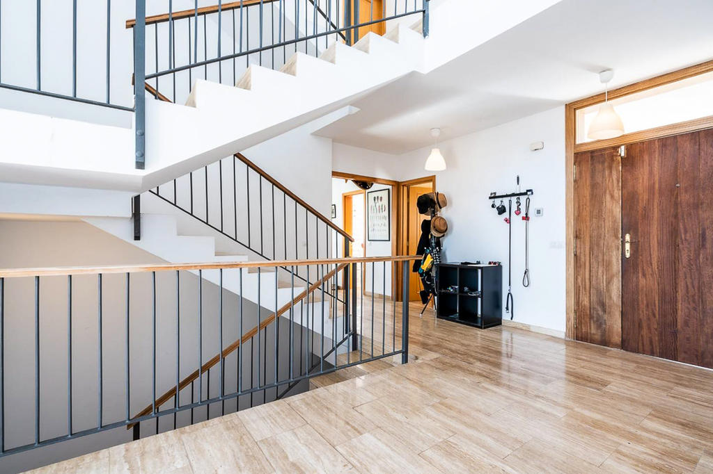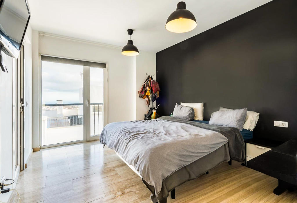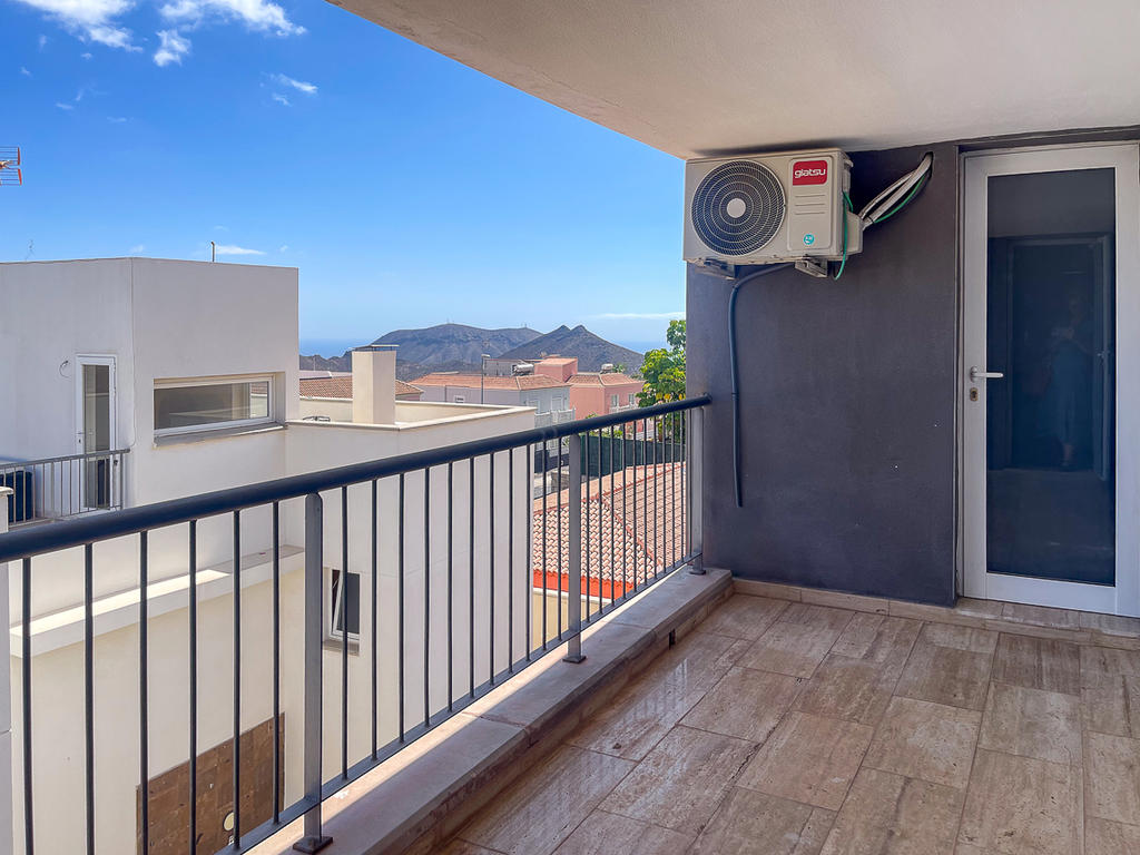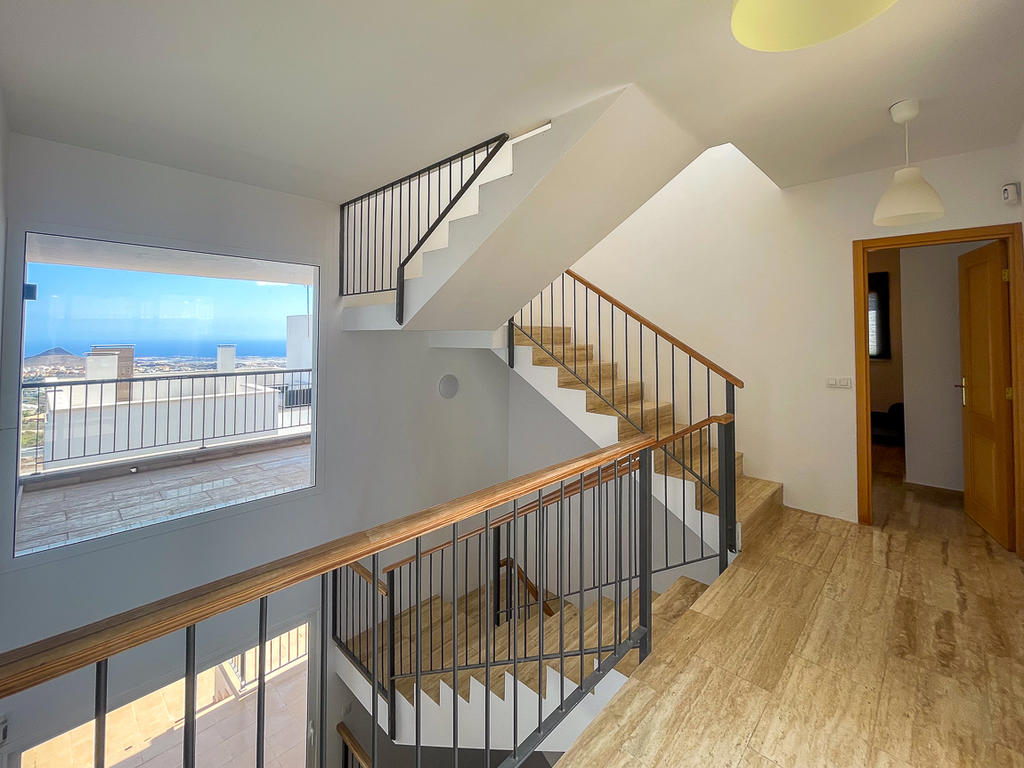 Heading upstairs, you'll find the home's three bedrooms, including a generous master bedroom with a walk-in closet and a private en-suite bathroom. An additional bathroom serves the other bedrooms, offering a practical and comfortable layout for both family and guests. One more set of stairs up takes you to the stunning rooftop terrace, with sweeping panoramic views of both the sea and the mountains – a perfect spot to relax and take in the surroundings. Solar panels are also installed here, providing sustainable electricity for the home.