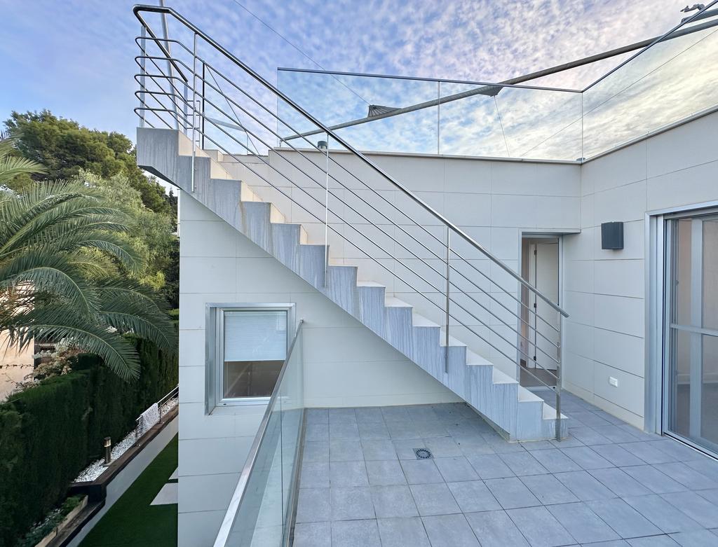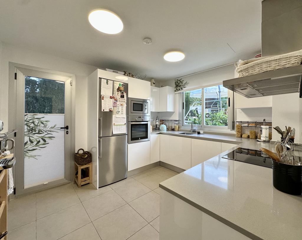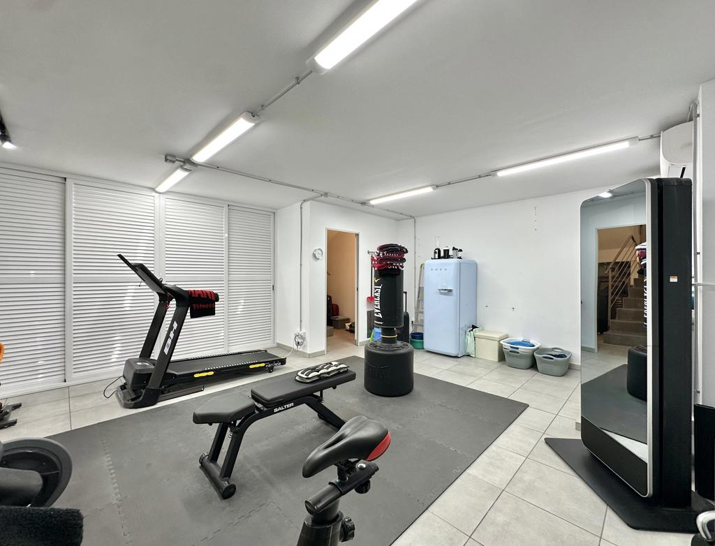 The property is 217 m2 inside, distributed over three floors. With three bedrooms, three bathrooms, a large open living/dining room, kitchen and a private gym in the basement.