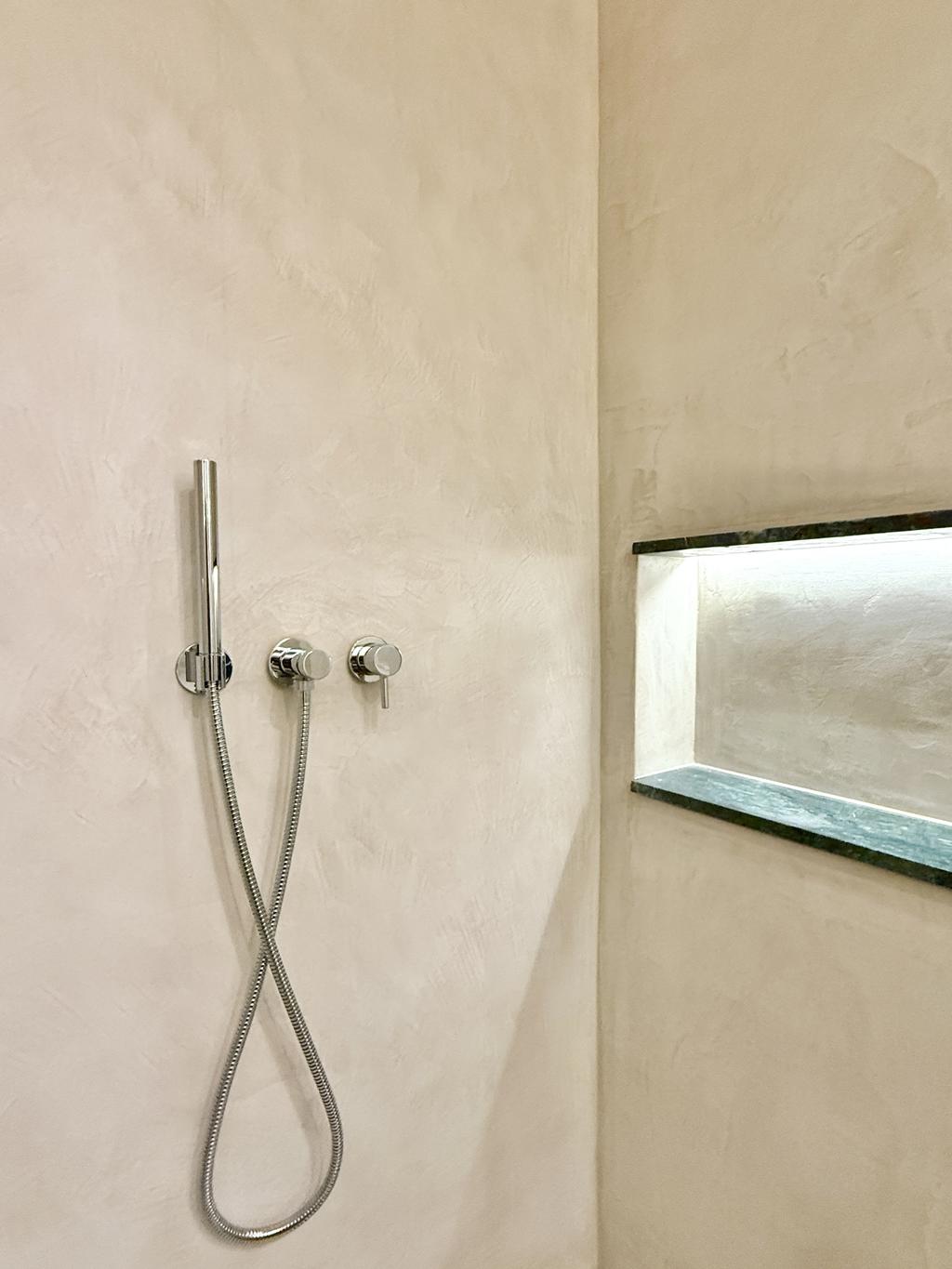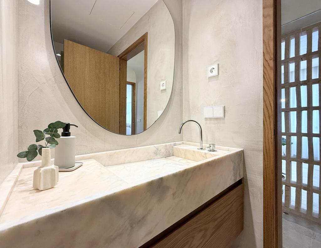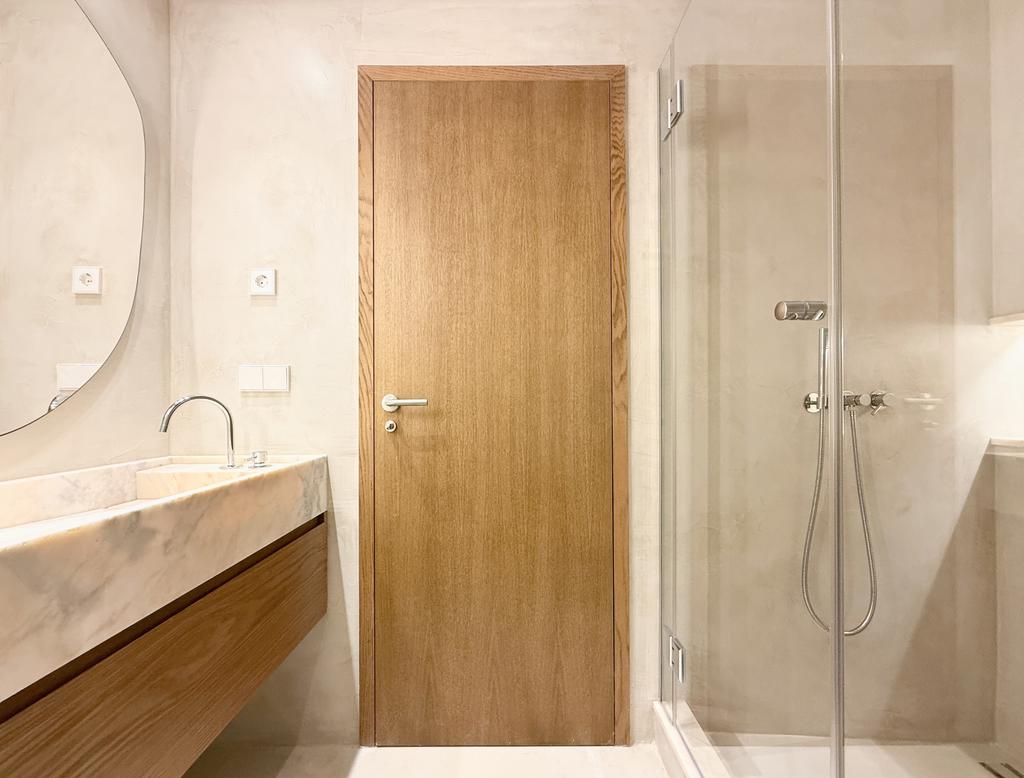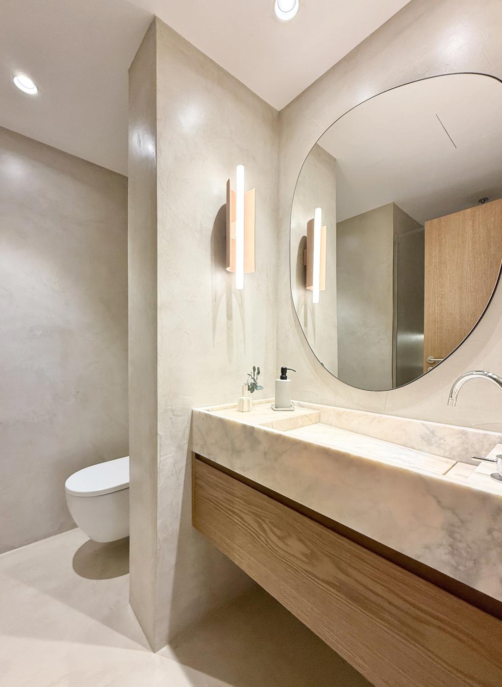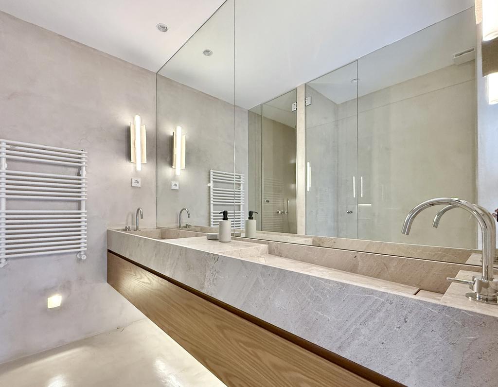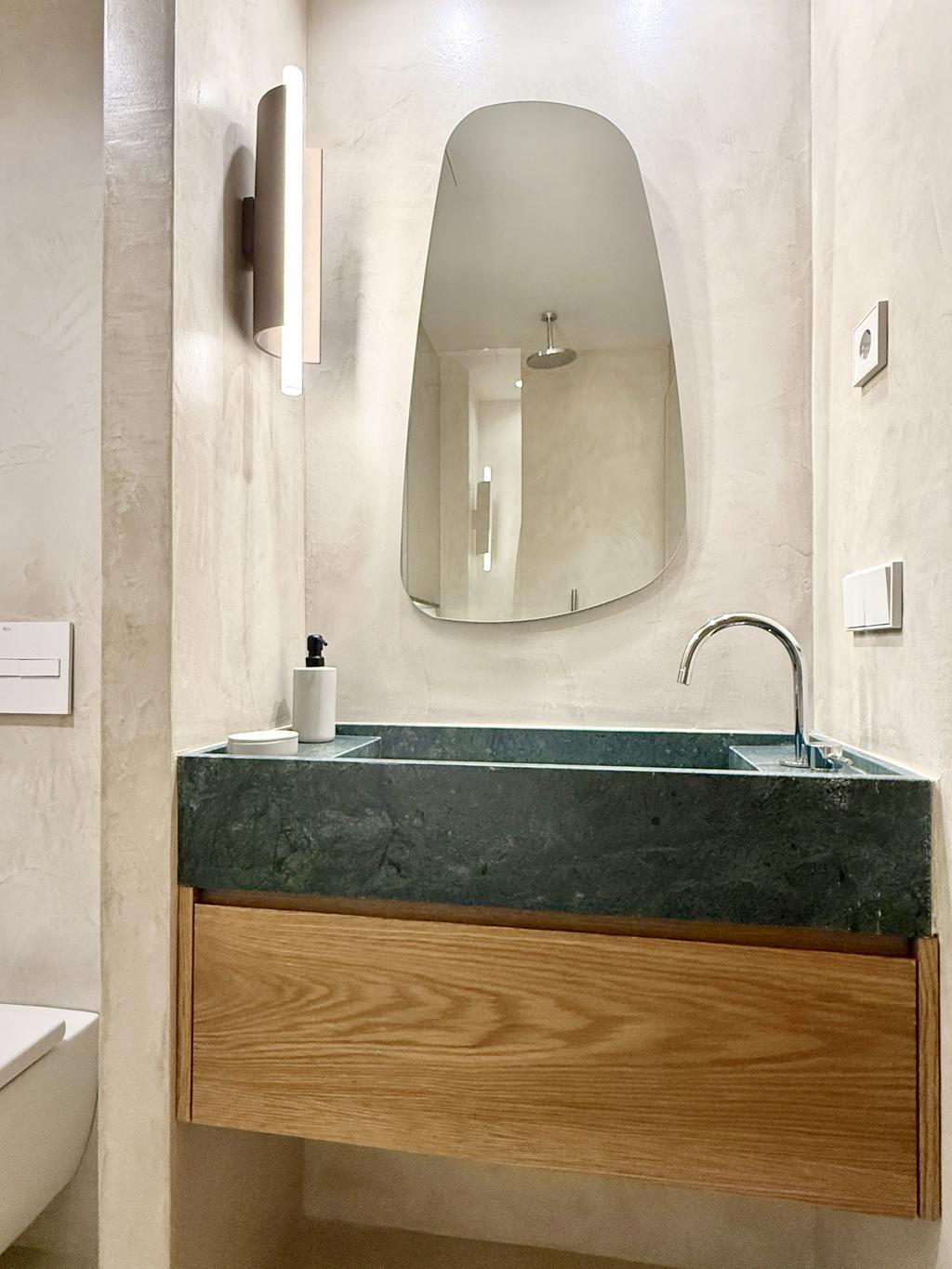 The choice of materials is characterized by natural elegance. The floors in the main part of the home are laid in the gray limestone Zarci, while the bathrooms are clad in microcement from MORTEX – a modern and durable choice that provides a seamless and harmonious surface. Natural stone sinks and walls in smooth plaster reinforce the exclusive feeling.