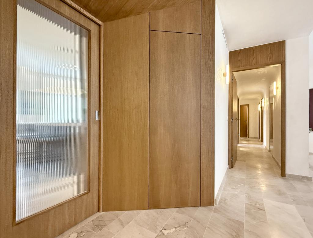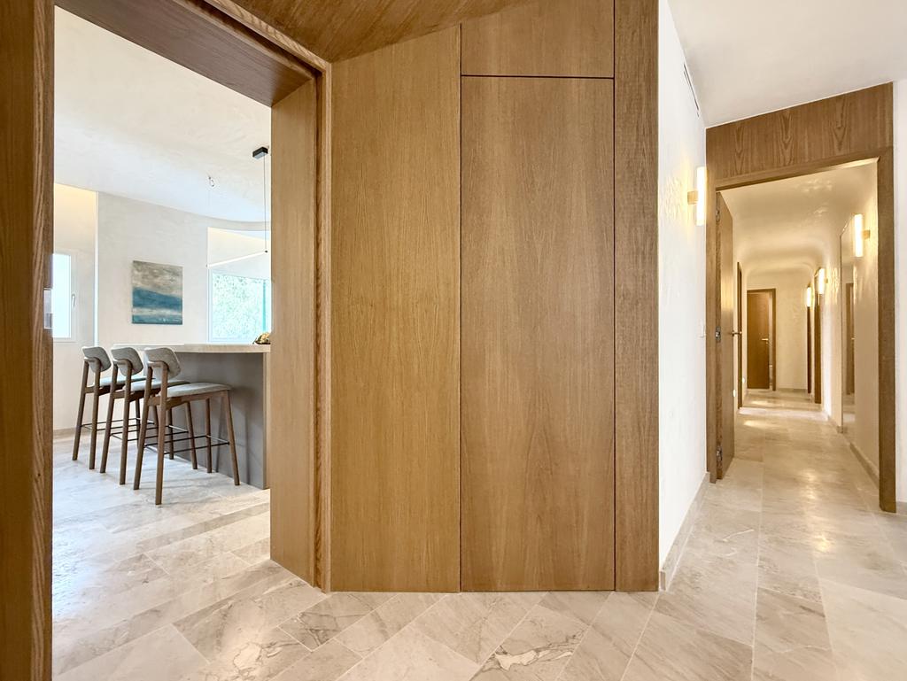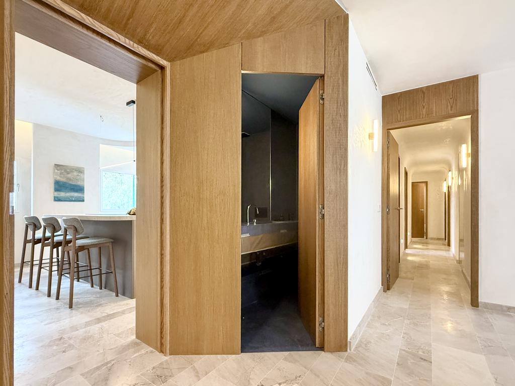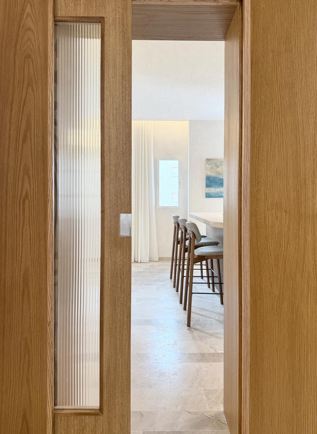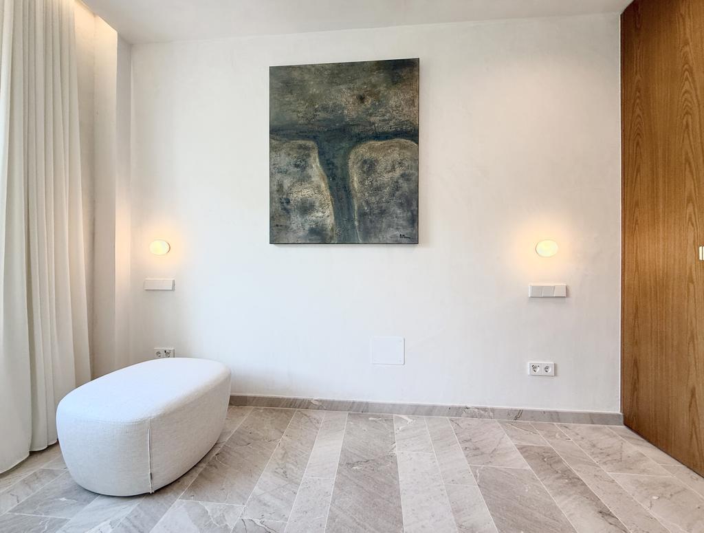 The large, minimalist windows with hidden frames and Climalit glass provide excellent sound and heat insulation, complemented by Guardian Sun glass for optimal light. Discreet Dline handles and traditional Mallorcan aluminum blinds contribute to a sober and thoughtful aesthetic. The interior carpentry in real wood provides warmth and continuity throughout the home.