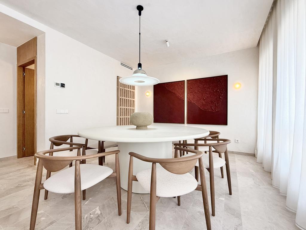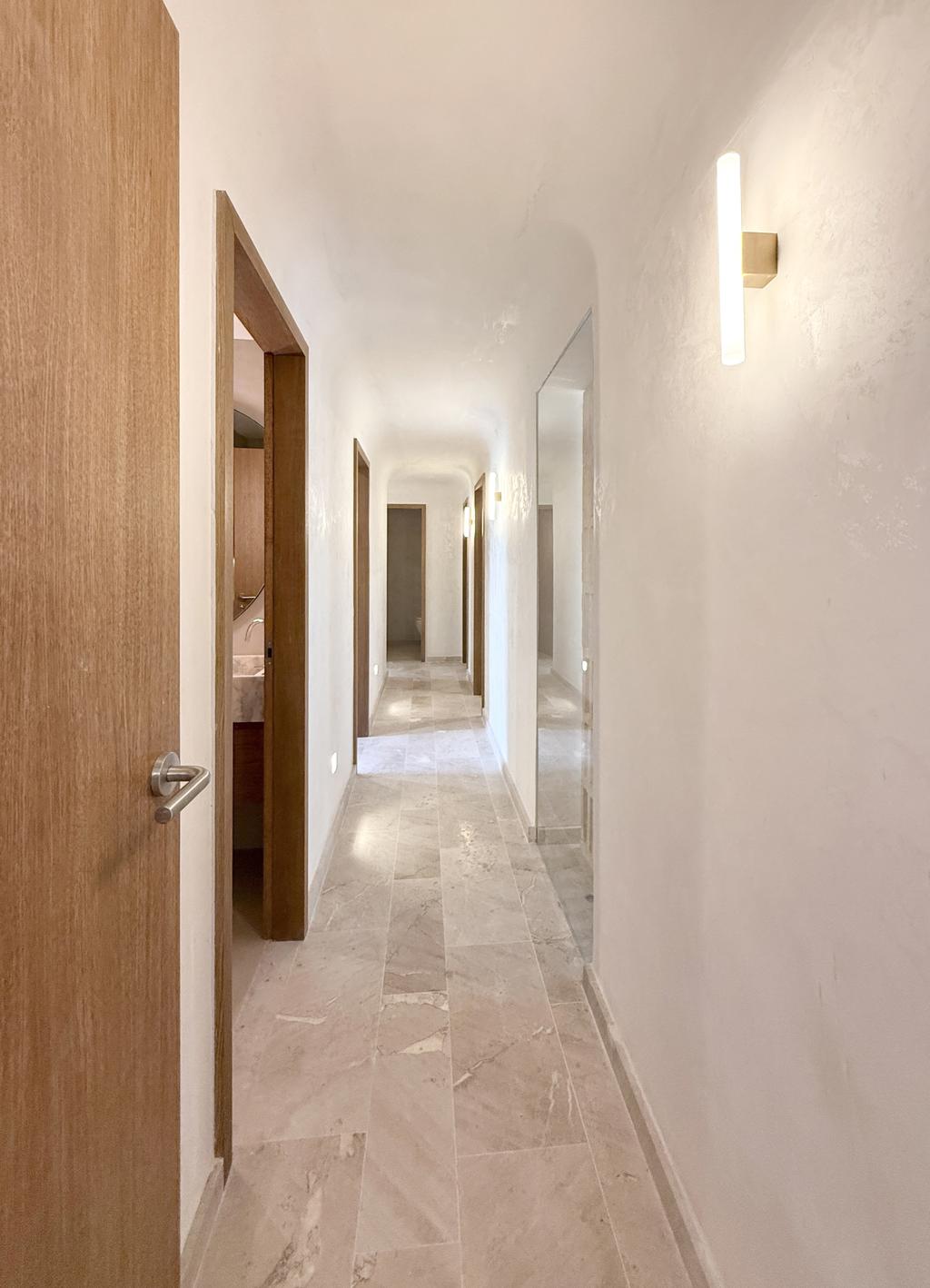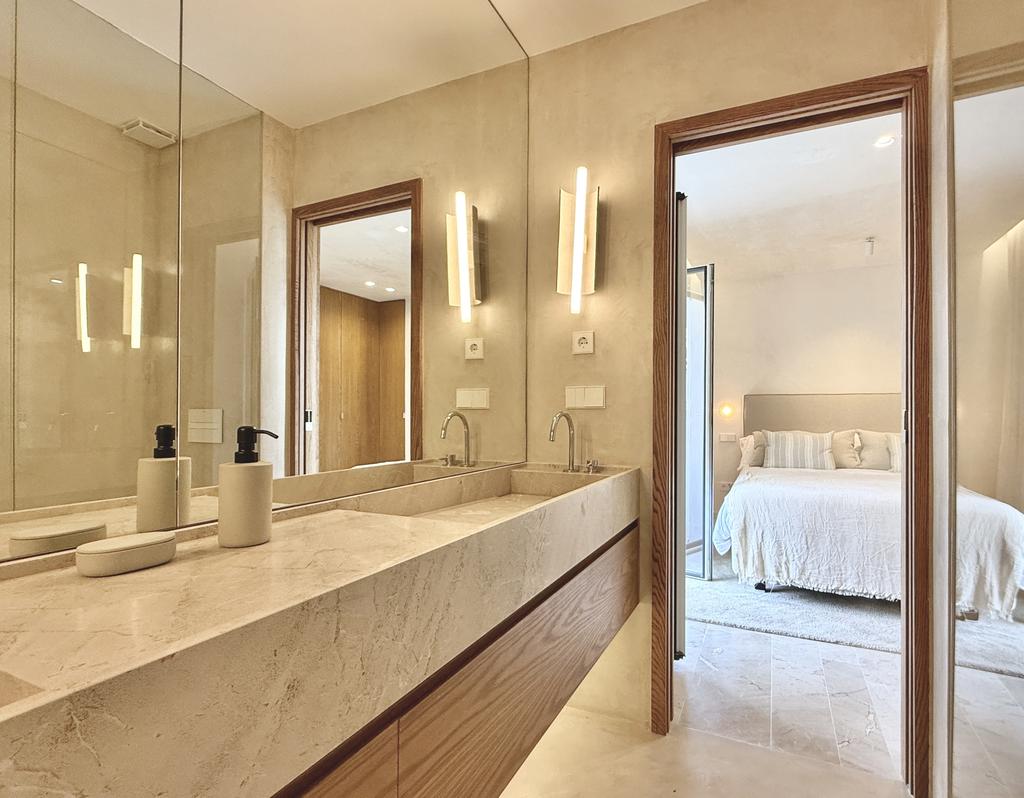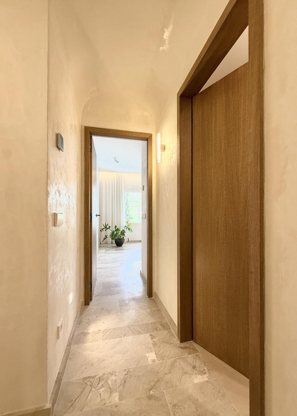 The large, minimalist windows with hidden frames and Climalit glass provide excellent sound and heat insulation, complemented by Guardian Sun glass for optimal light. Discreet Dline handles and traditional Mallorcan aluminum blinds contribute to a sober and thoughtful aesthetic. The interior carpentry in real wood provides warmth and continuity throughout the home.
