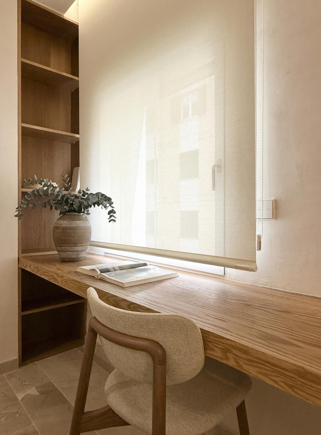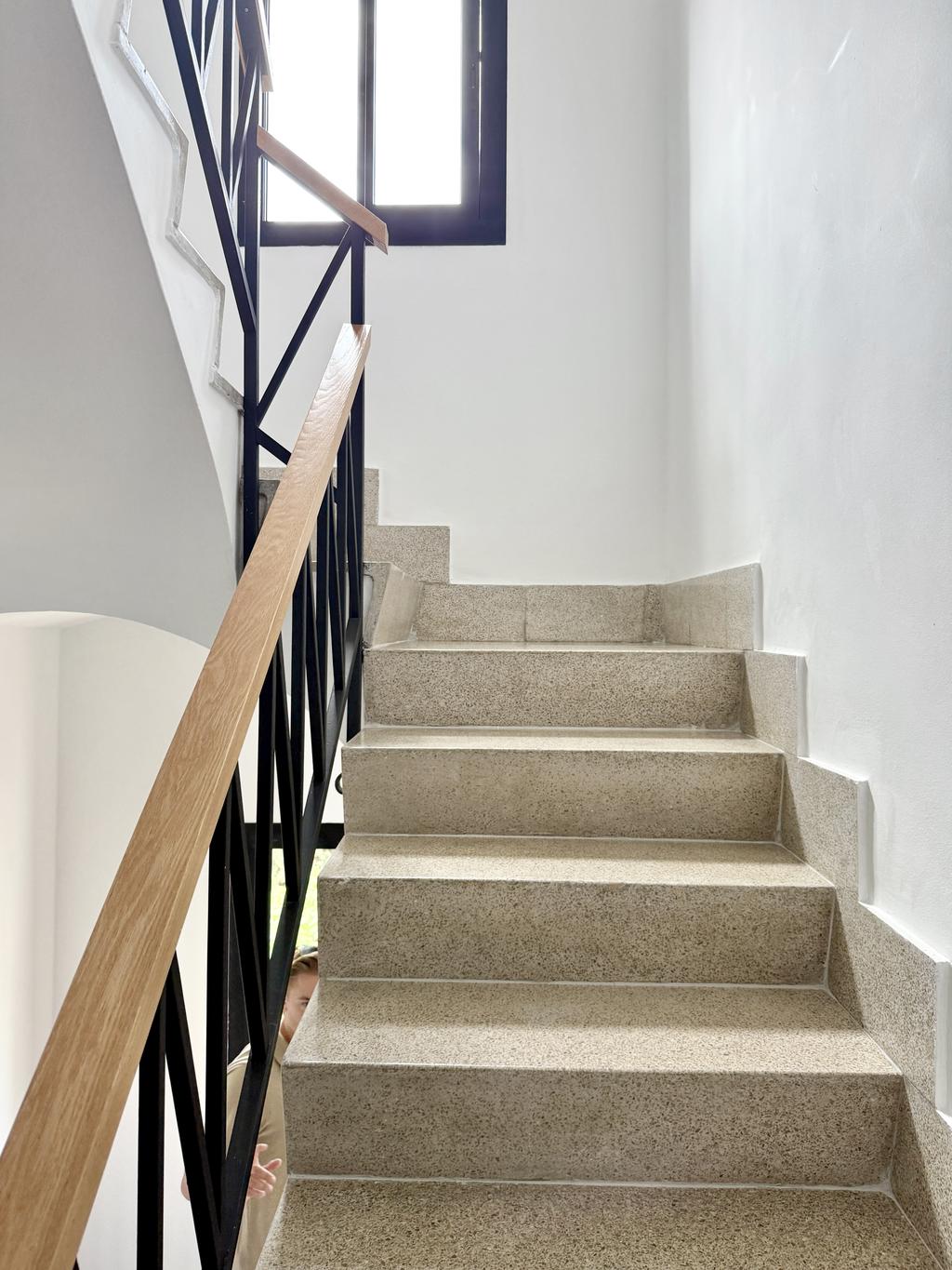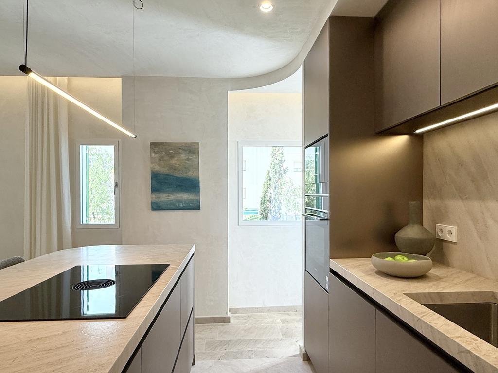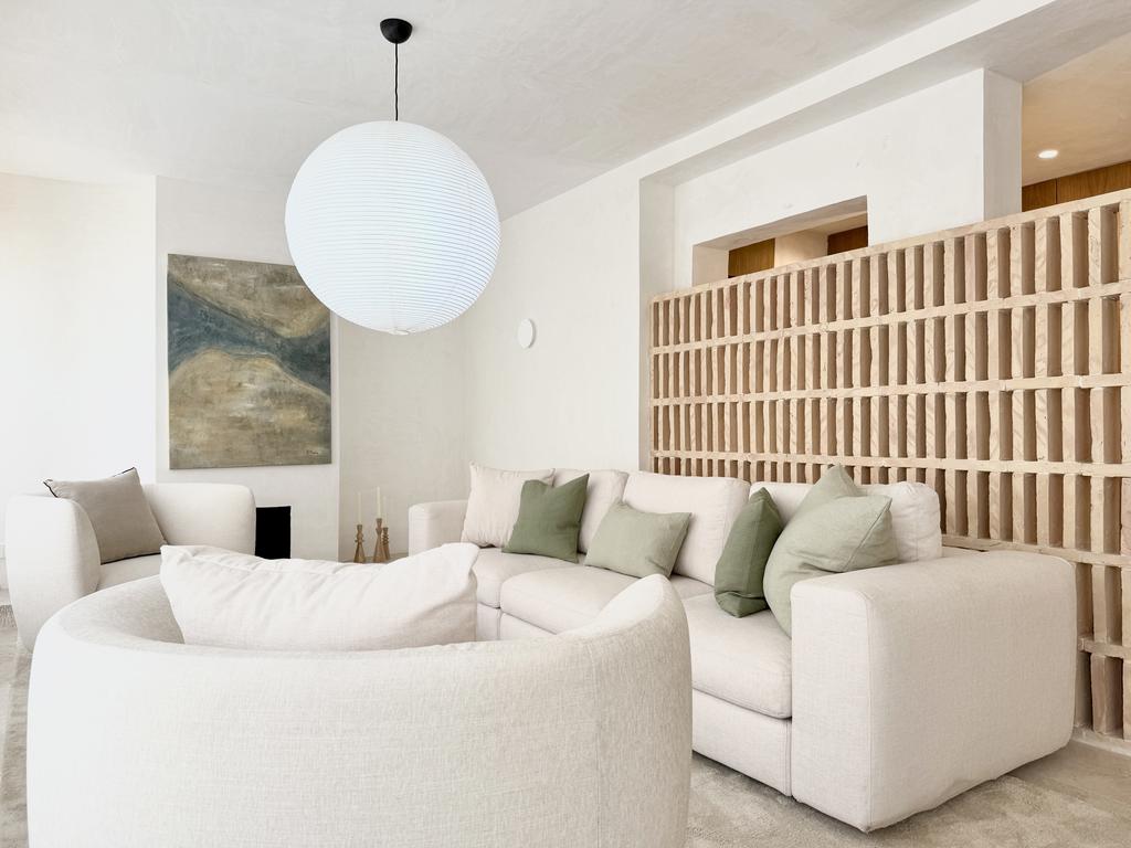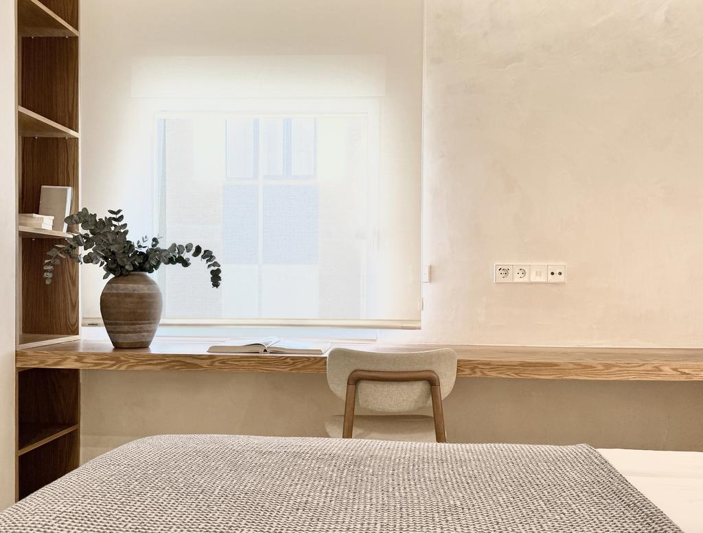 The large, minimalist windows with hidden frames and Climalit glass provide excellent sound and heat insulation, complemented by Guardian Sun glass for optimal light. Discreet Dline handles and traditional Mallorcan aluminum blinds contribute to a sober and thoughtful aesthetic. The interior carpentry in real wood provides warmth and continuity throughout the home.