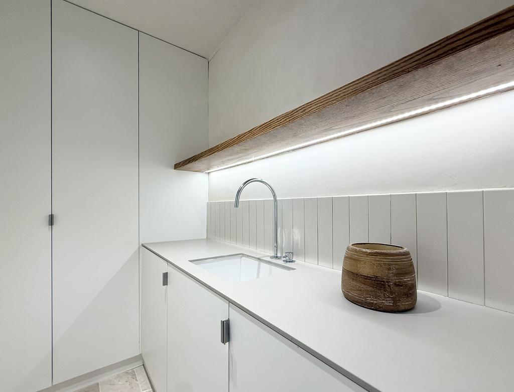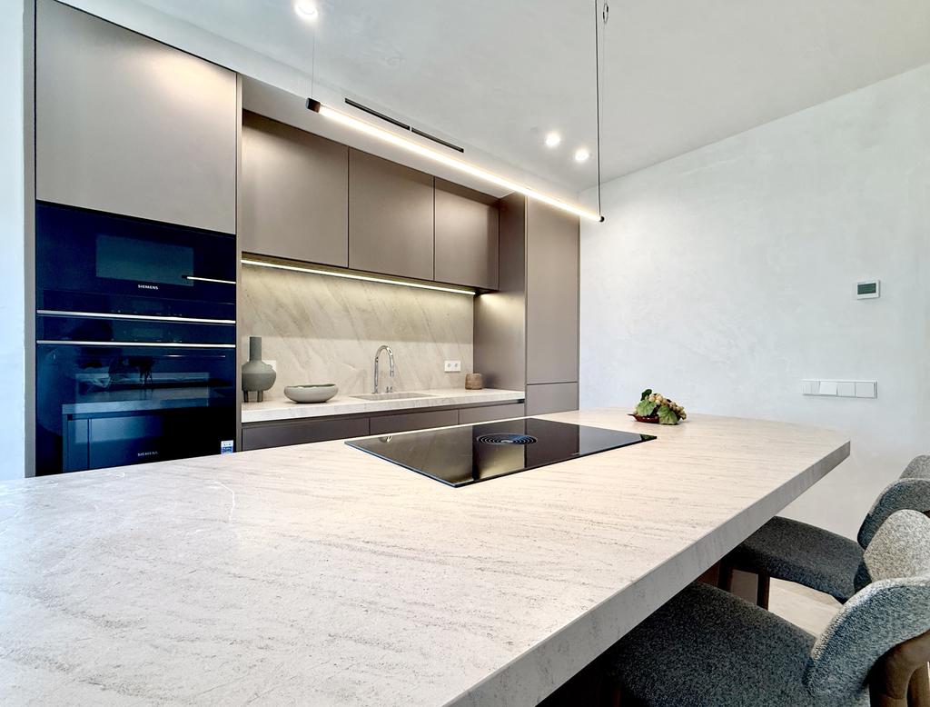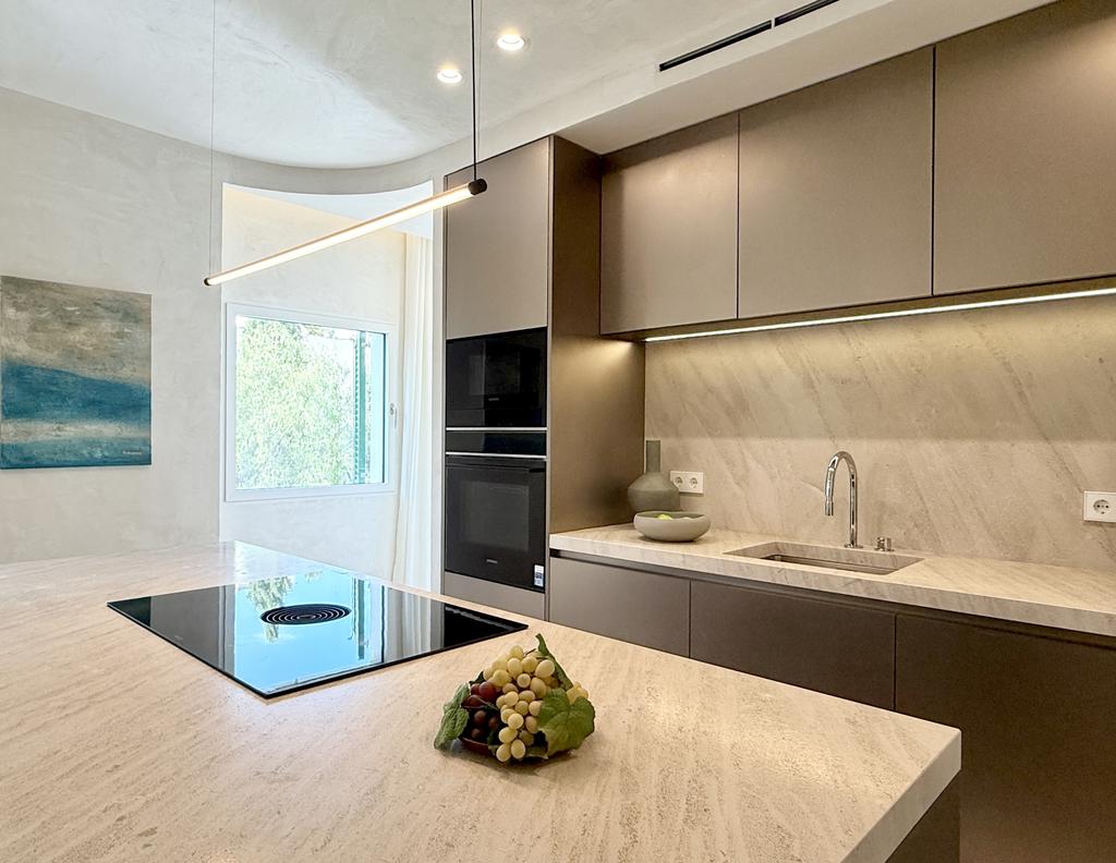 The Modulnova kitchen is both elegant and practical, with Siemens appliances, a Bora hob and natural stone worktops. The separate laundry room, with a durable Coverlam worktop, offers plenty of space for storage and practical everyday management.