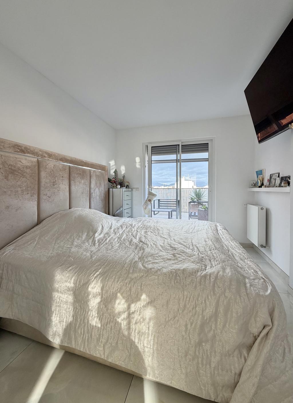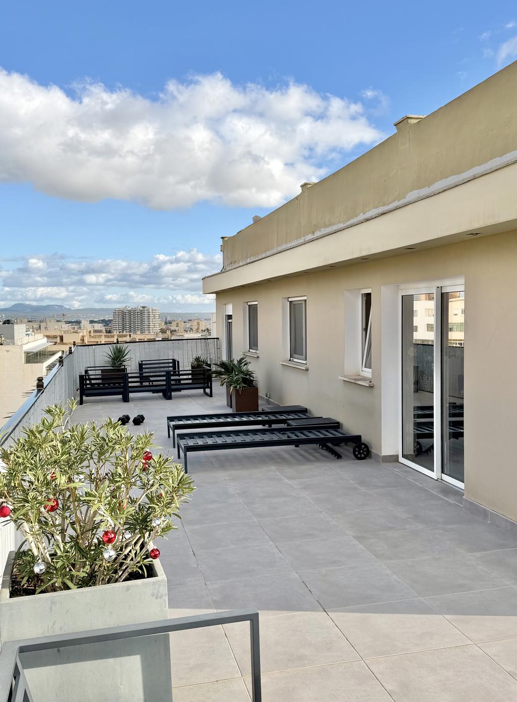 The private terrace of approximately 90 m² is one of the property's great highlights. Here, the panorama spreads out over the sea, Palma's characteristic roof ridges, the iconic cathedral and the surrounding mountains. The terrace offers plenty of space for lounge furniture, sun loungers and a barbecue, creating a perfect environment for both relaxing days and social evenings.