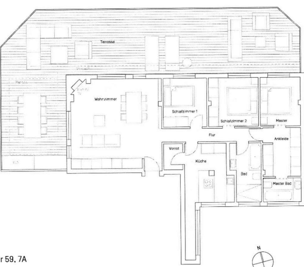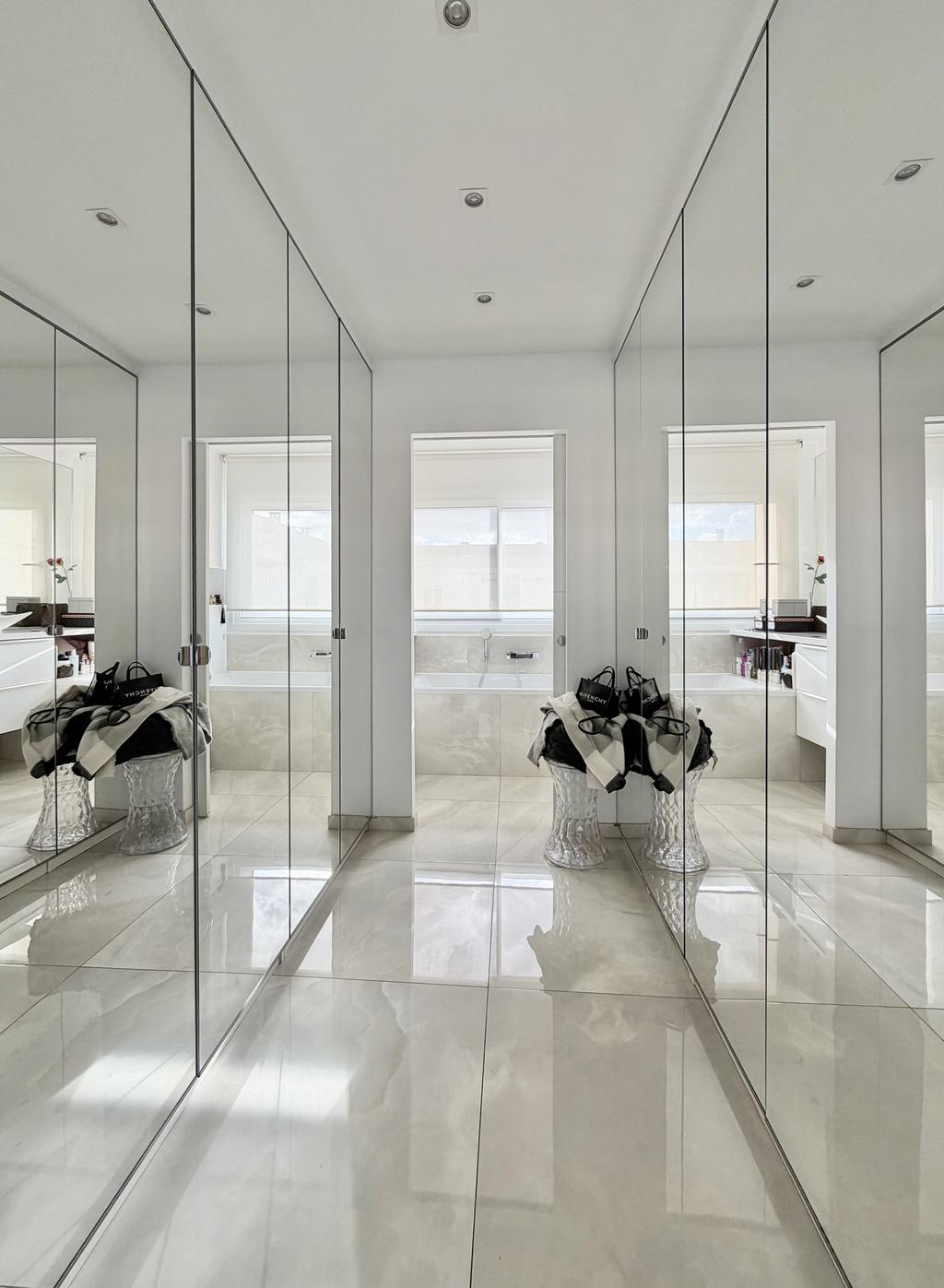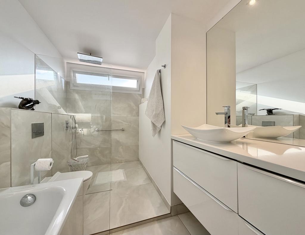 Inside, around 100 m² of tastefully renovated spaces await. The airy living room is flooded with natural light and connects to a modern, fully equipped kitchen. There is also a practical laundry area adjacent. The apartment has three generously sized bedrooms, one with a private bathroom and its own walk-in closet, as well as a further stylish bathroom.