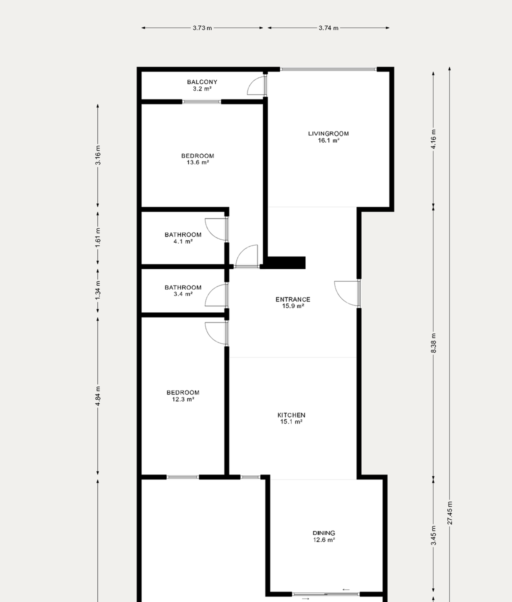 The home offers two bedrooms, two bathrooms, a living room with access to the balcony, an open kitchen and dining room.
