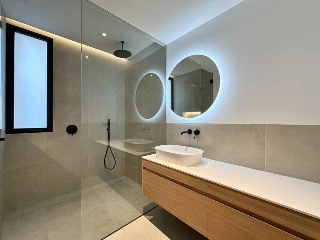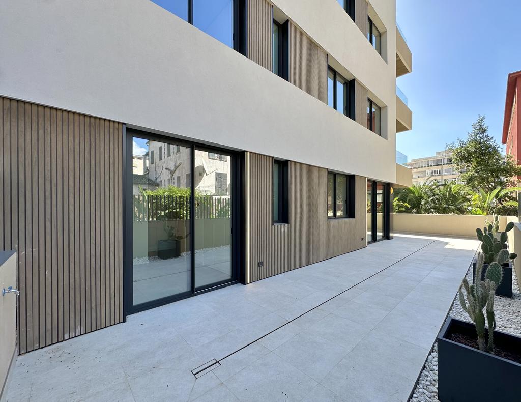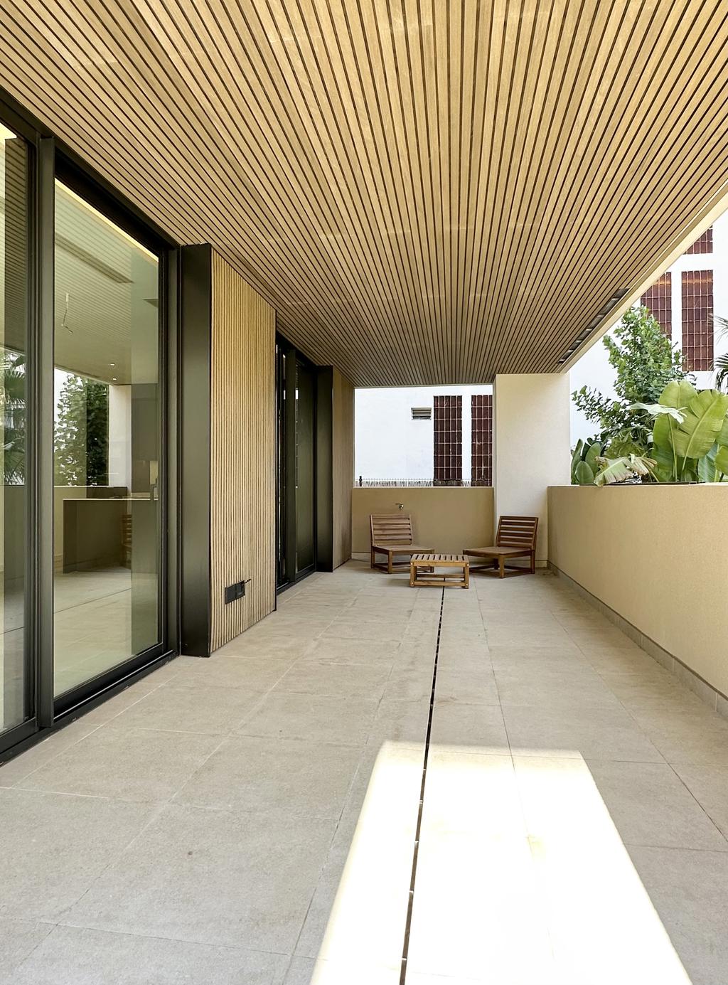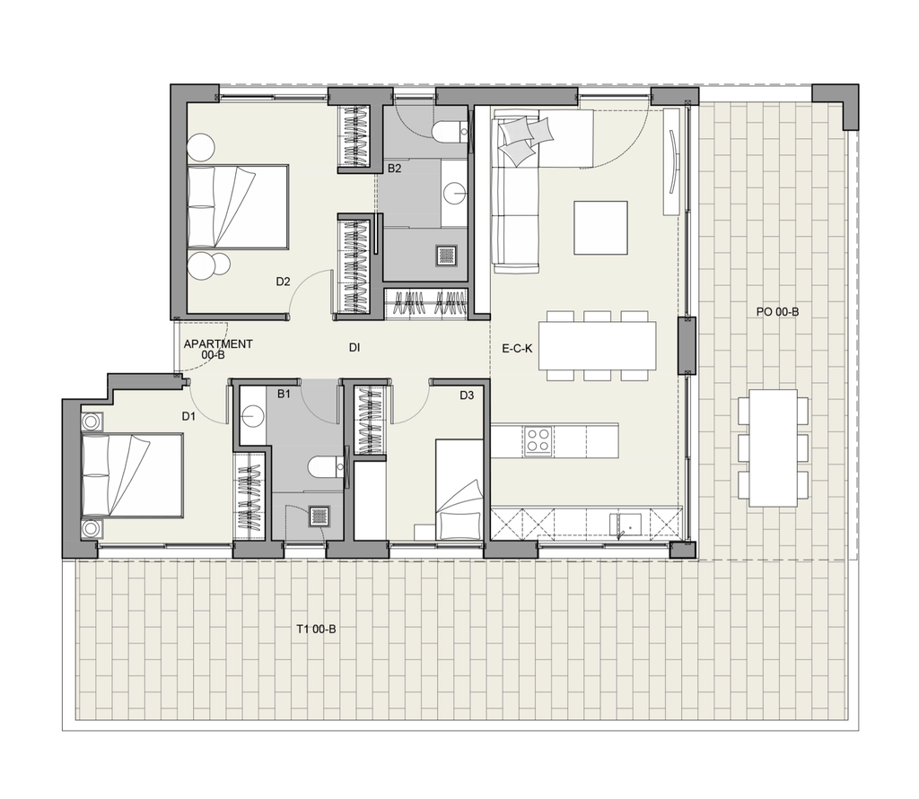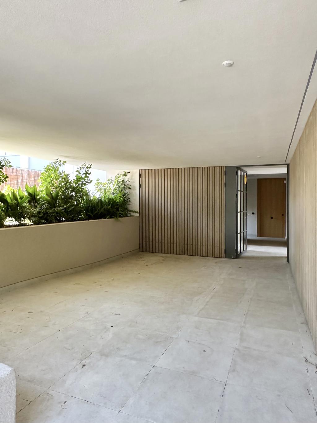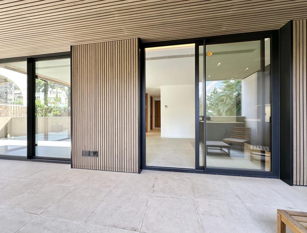The apartment is 93 m2 internally, distributed over three bedrooms, two bathrooms and a large open plan living/kitchen. In addition to this there is a large private patio of 74 m2, which is accessed via the living/kitchen and two of the bedrooms. The L-shaped patio extends around the house and gives the feeling of an extension of the open plan living/kitchen.