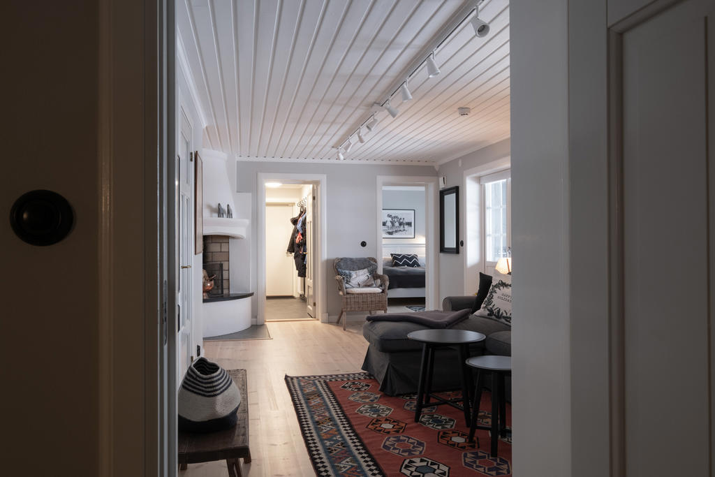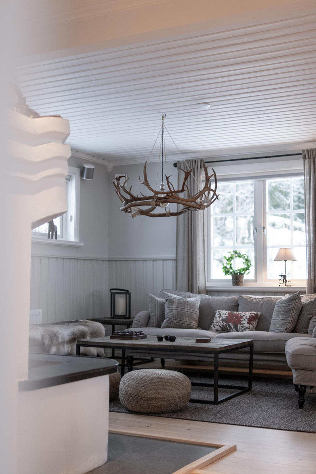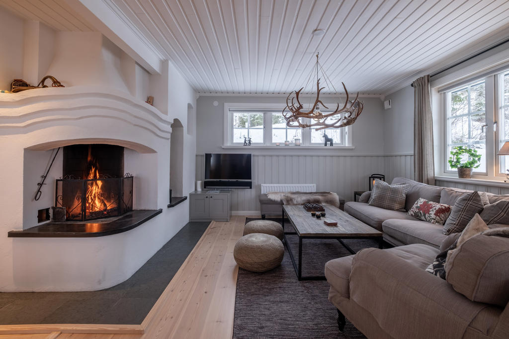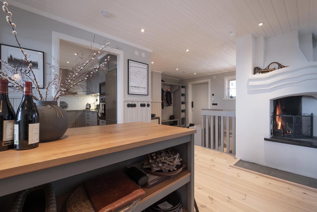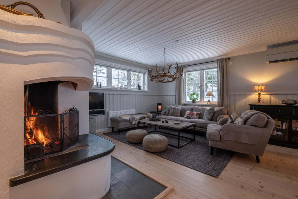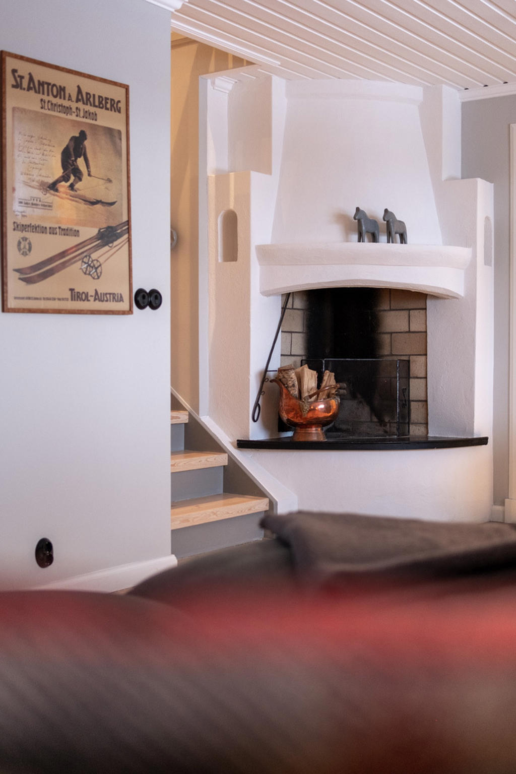 Materialvalen är gedigna och genomtänkta och skapar en fin och avkopplande atmosfär där den sprakande öppna spisen ger den extra mysfaktorn och värmande avkoppling du önskar efter dagens aktiviteter.