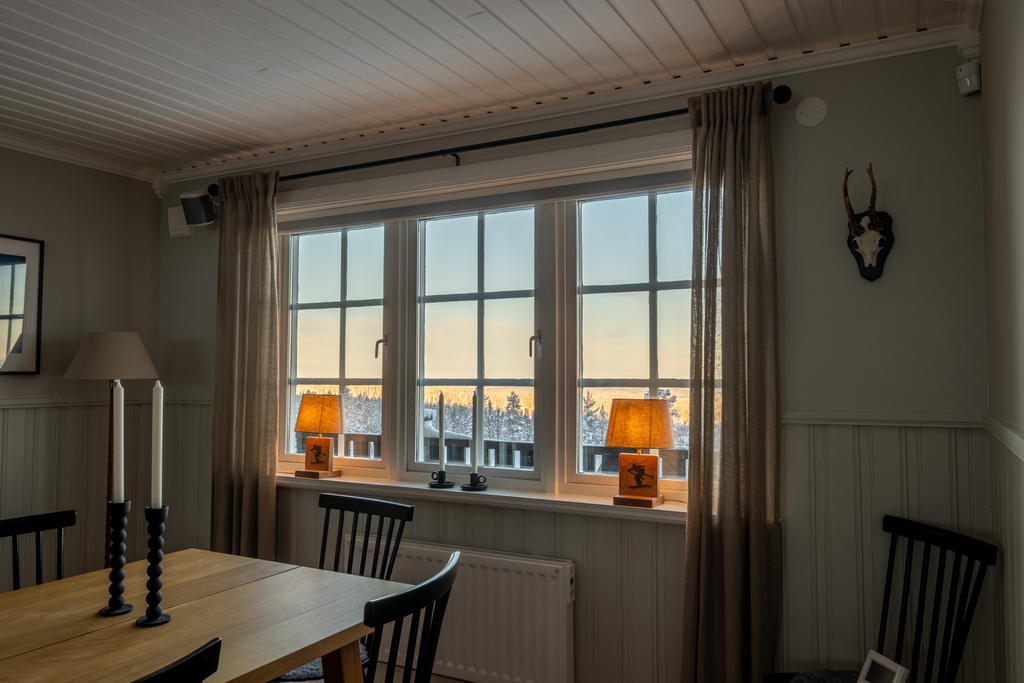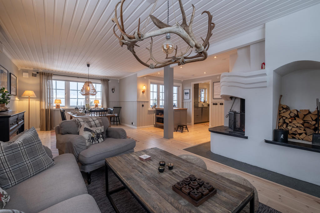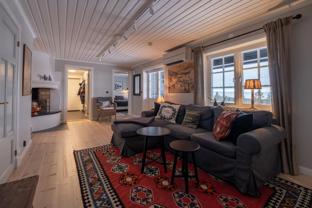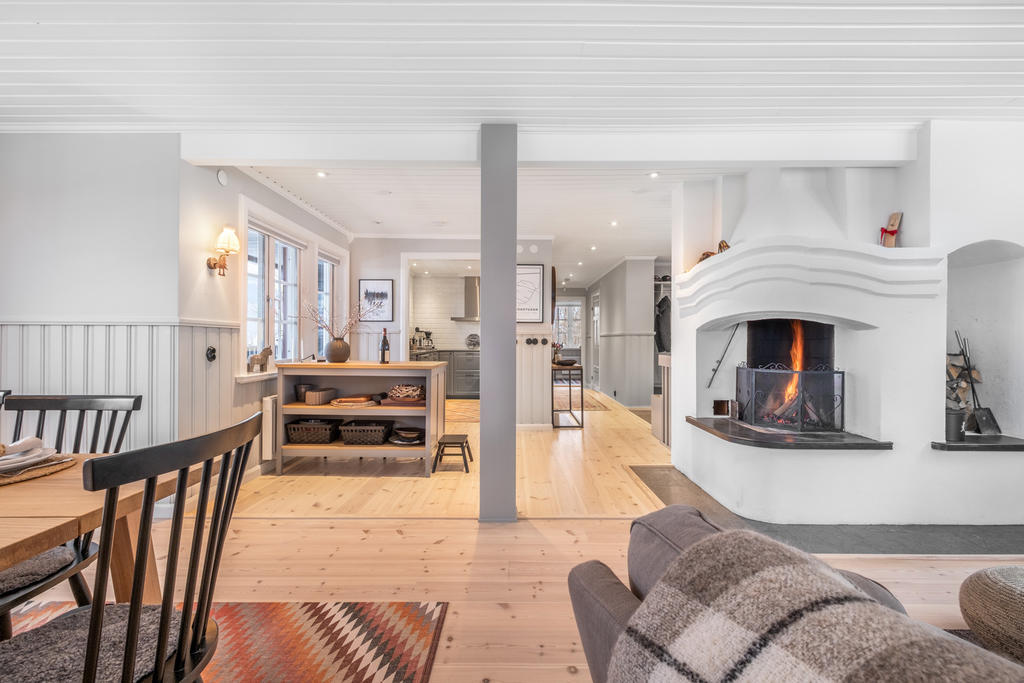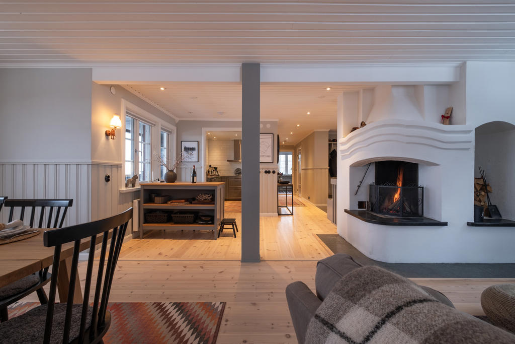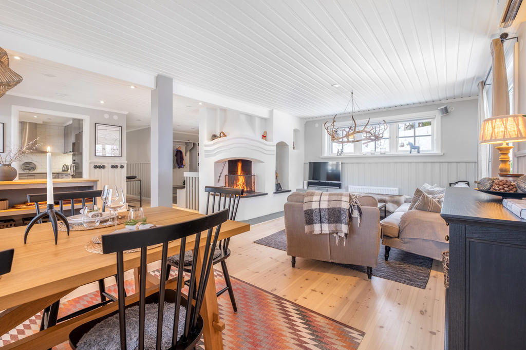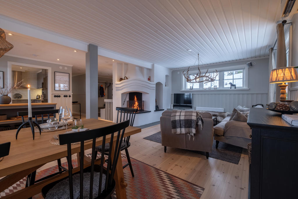 Fjällandskapet blir en naturlig del av interiören och skapar ett ständigt närvarande lugn. Den öppna planlösningen mellan kök, matplats och vardagsrum gör hemmet till en självklar samlingspunkt, med plats för långa middagar, livliga samtal och stilla kvällar framför den sprakande brasan.