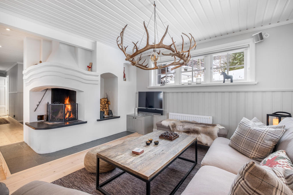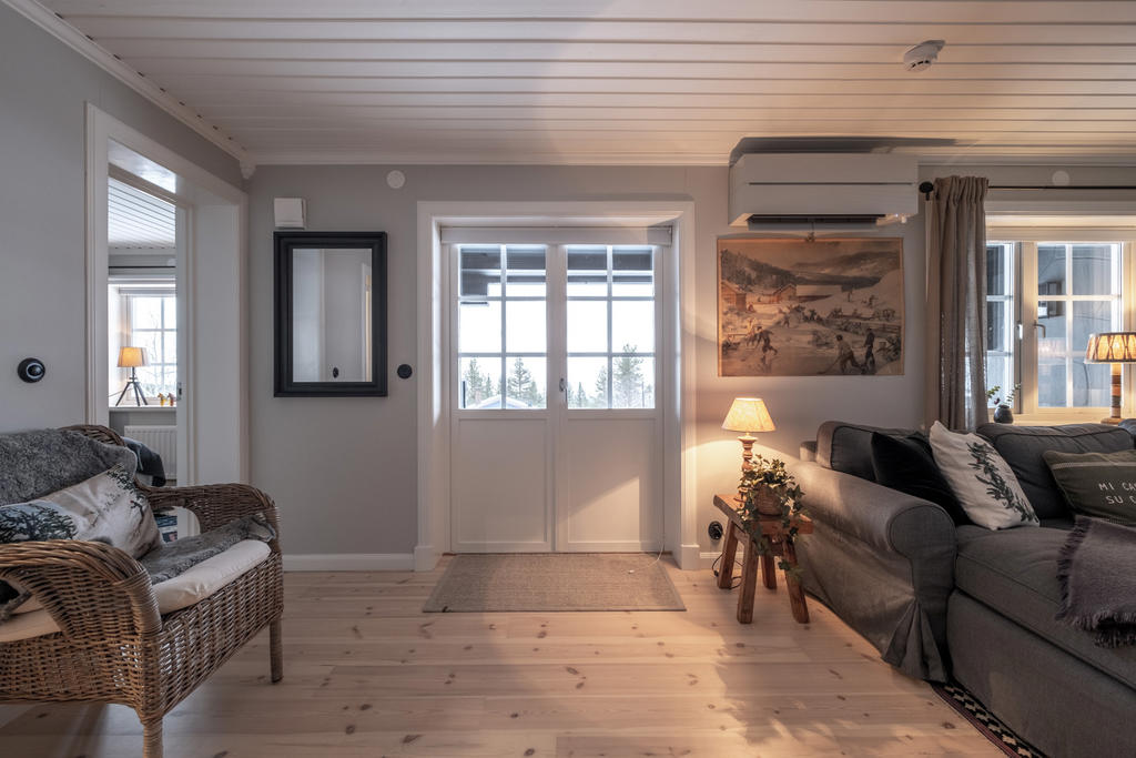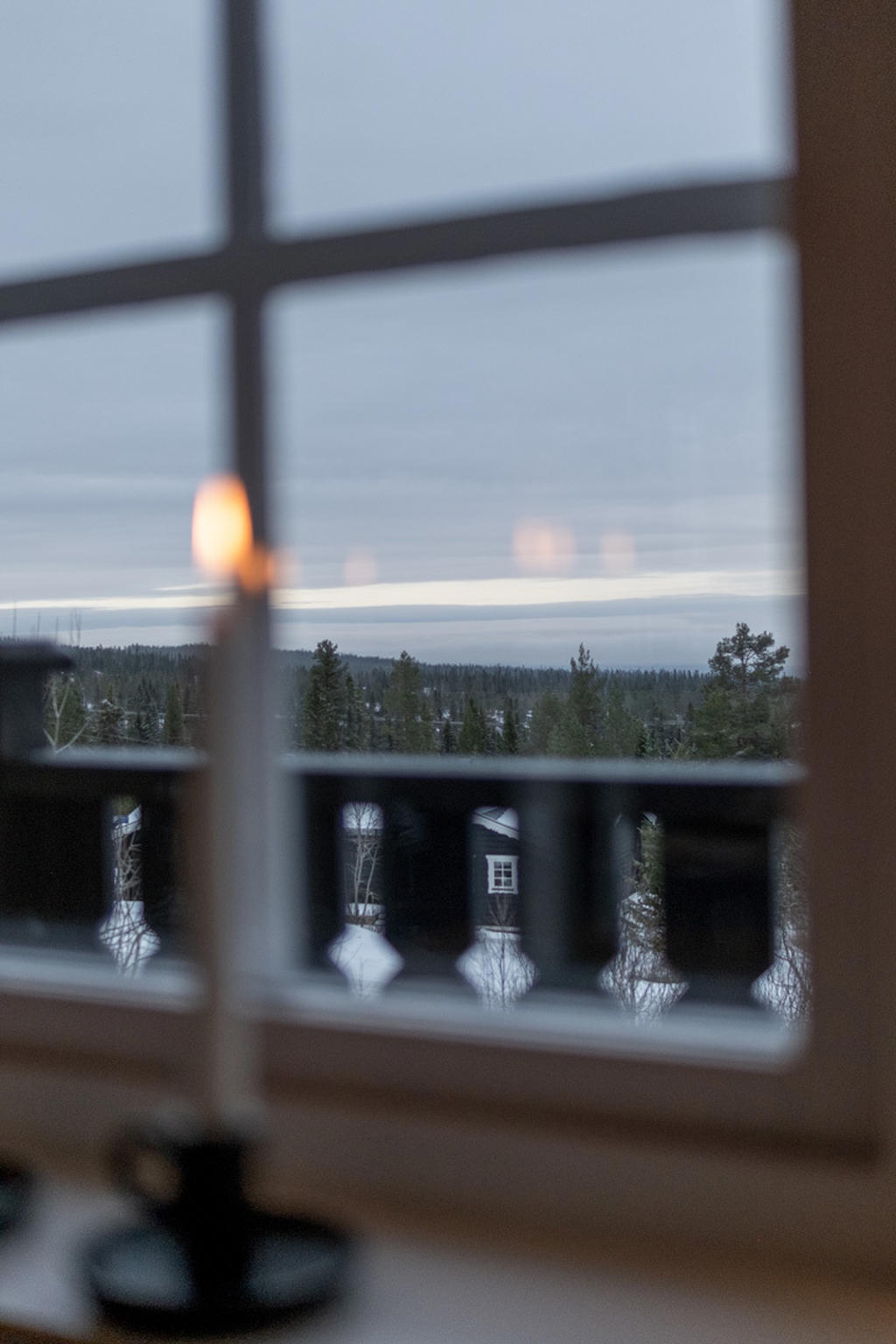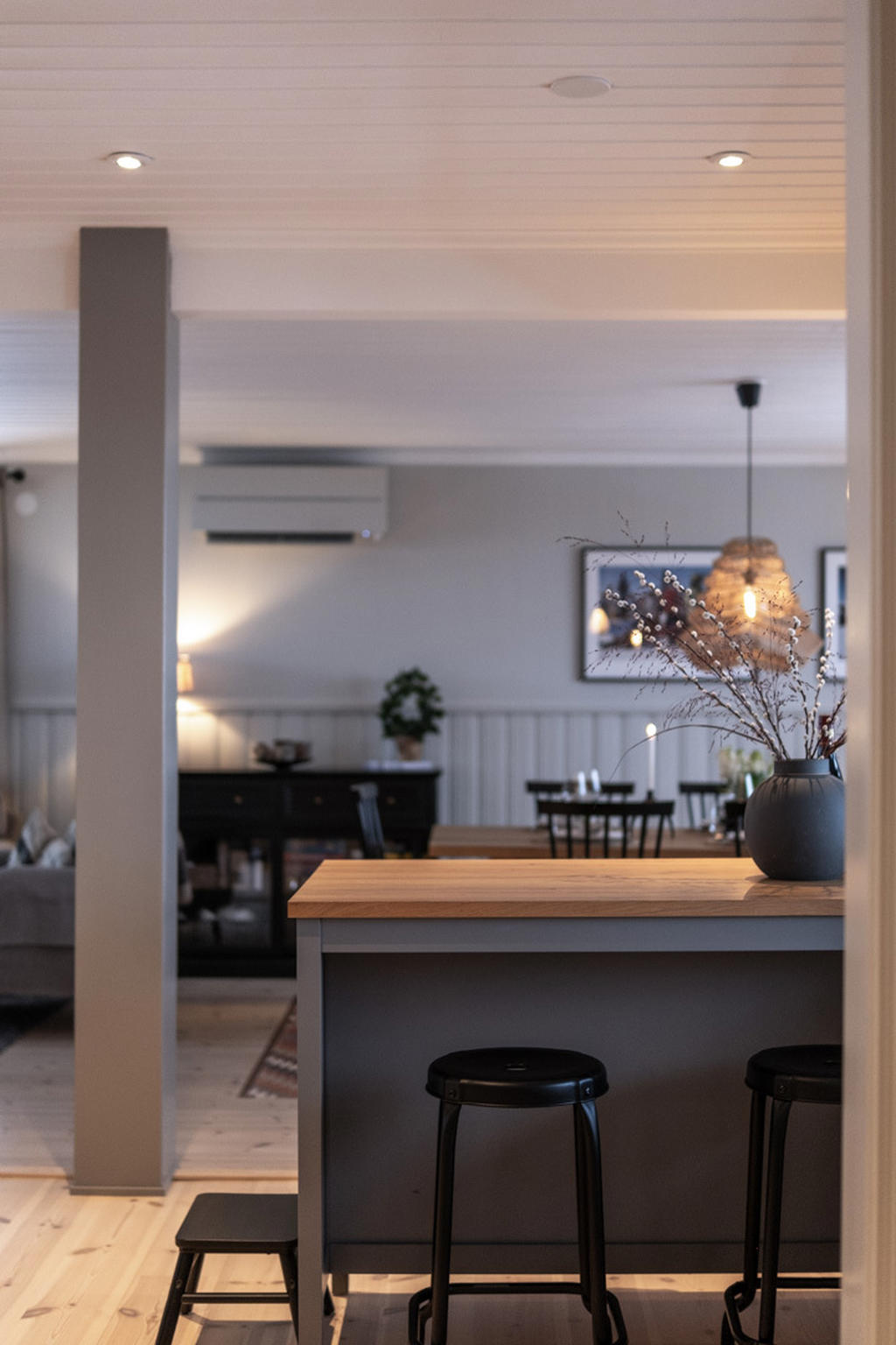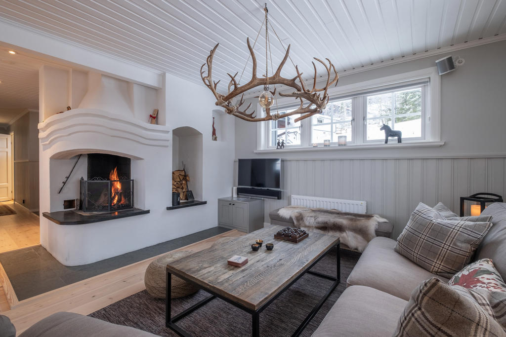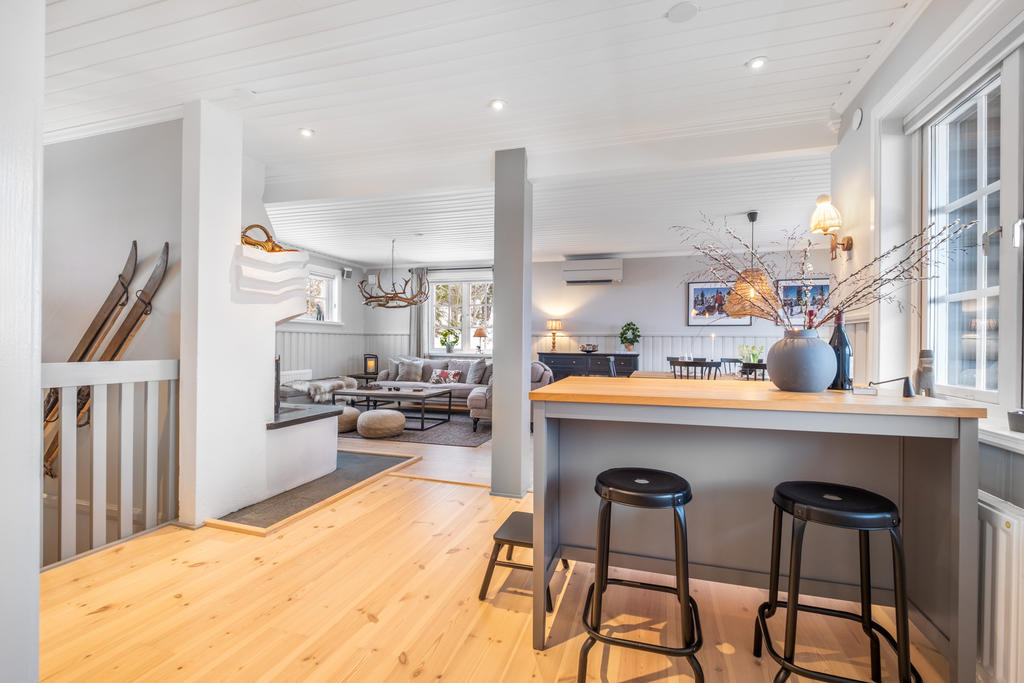 Fjällandskapet blir en naturlig del av interiören och skapar ett ständigt närvarande lugn. Den öppna planlösningen mellan kök, matplats och vardagsrum gör hemmet till en självklar samlingspunkt, med plats för långa middagar, livliga samtal och stilla kvällar framför den sprakande brasan.