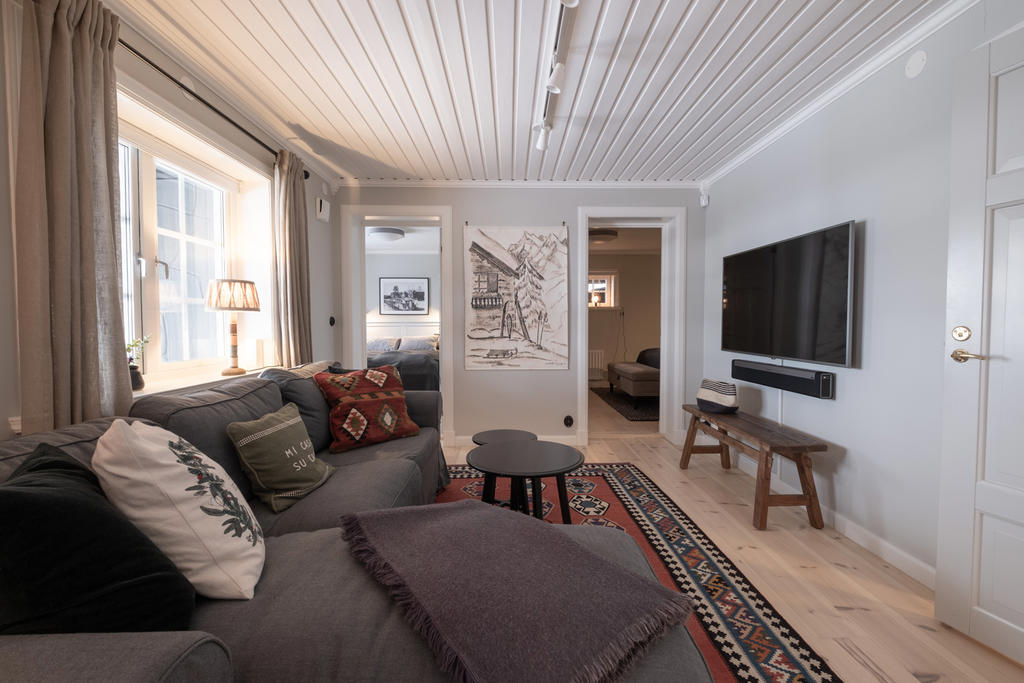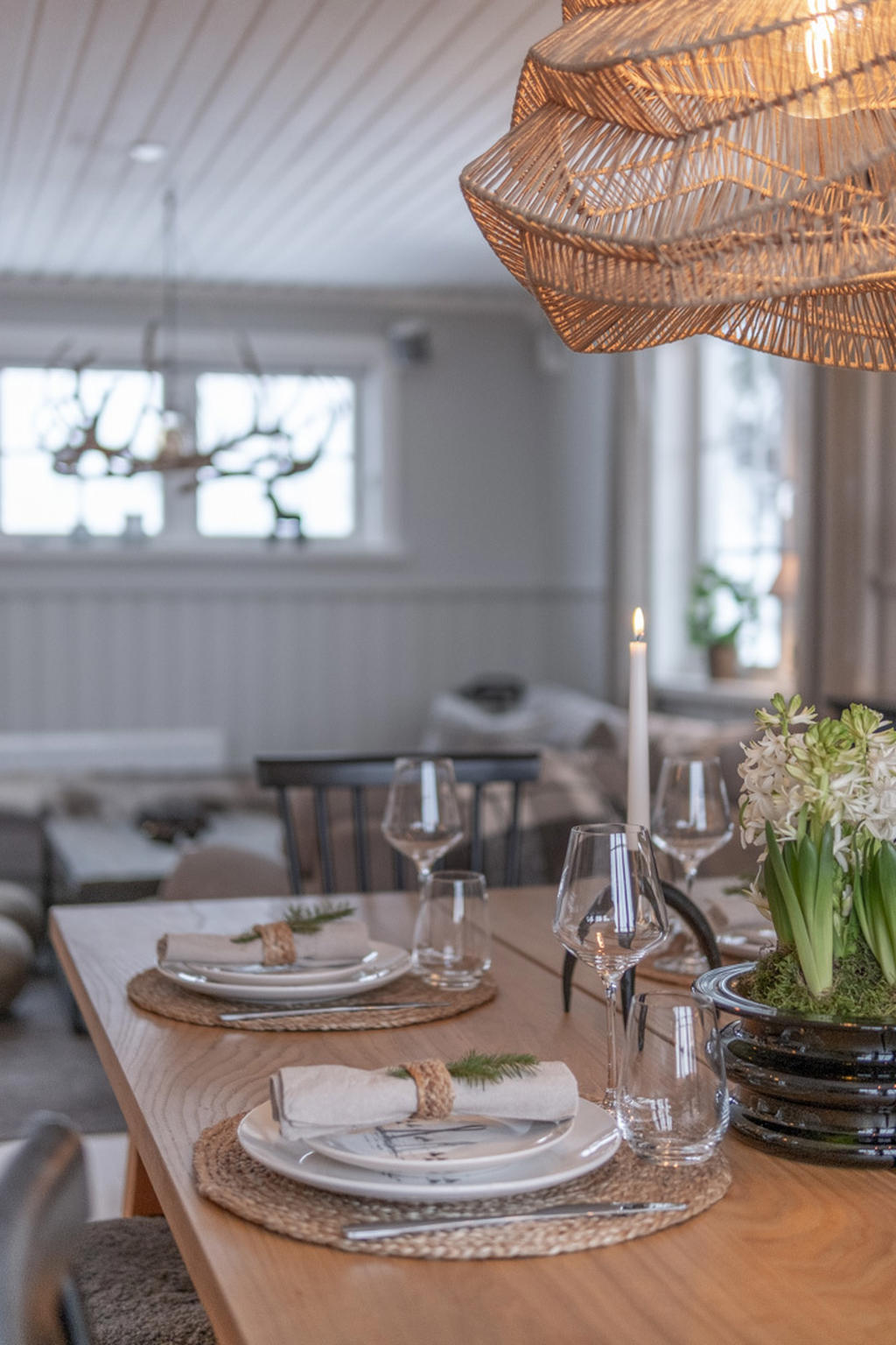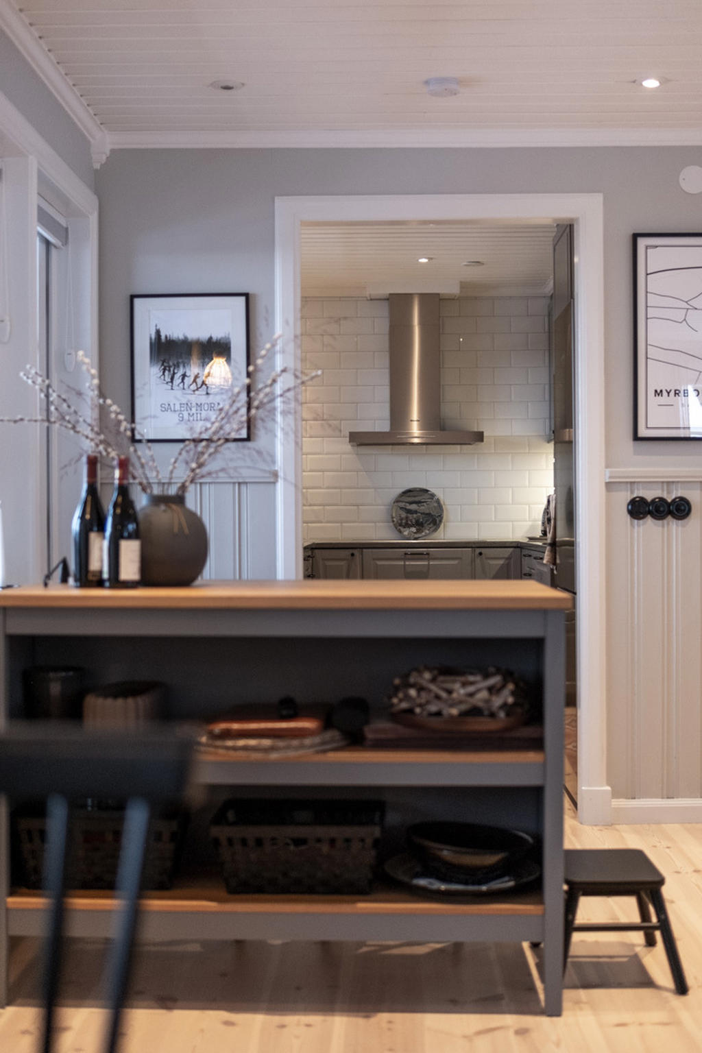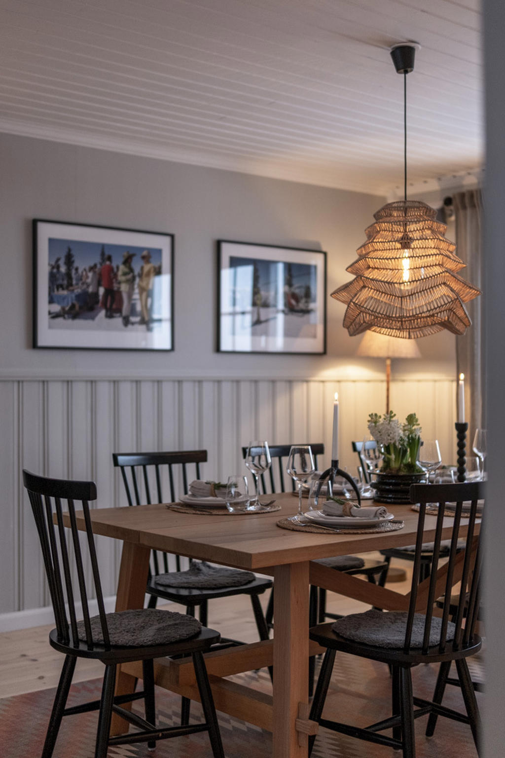 Fjällandskapet blir en naturlig del av interiören och skapar ett ständigt närvarande lugn. Den öppna planlösningen mellan kök, matplats och vardagsrum gör hemmet till en självklar samlingspunkt, med plats för långa middagar, livliga samtal och stilla kvällar framför den sprakande brasan.