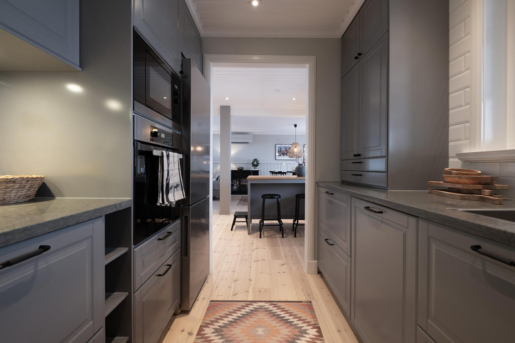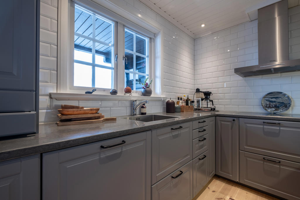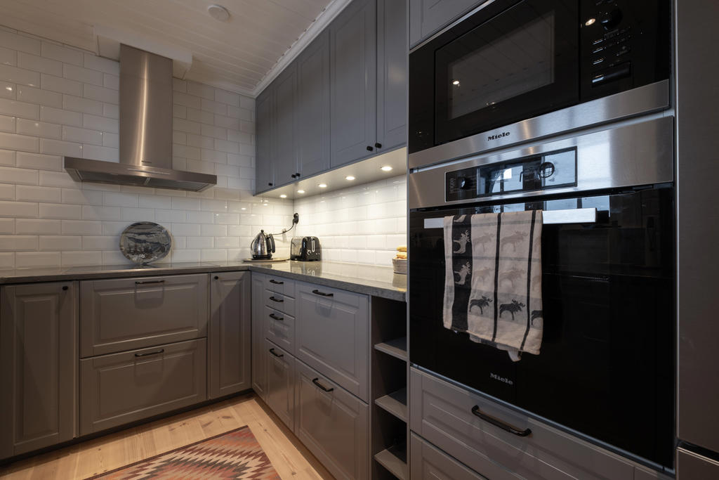 Köket är modernt och funktionellt med gott om arbetsytor och förvaring. Här finns alla förutsättningar för att laga mat till många – oavsett om det är frukost inför första åket eller middag efter en dag på fjället.