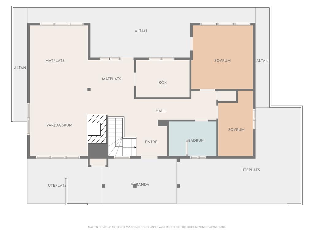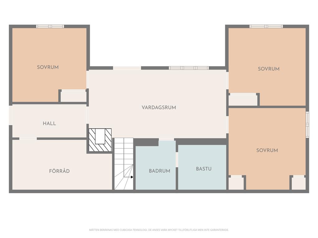 Sovrumen är fördelade på två plan med Masterbedroom och ett familjerum på entréplan och ytterligare tre sovrum i sutterängplan.