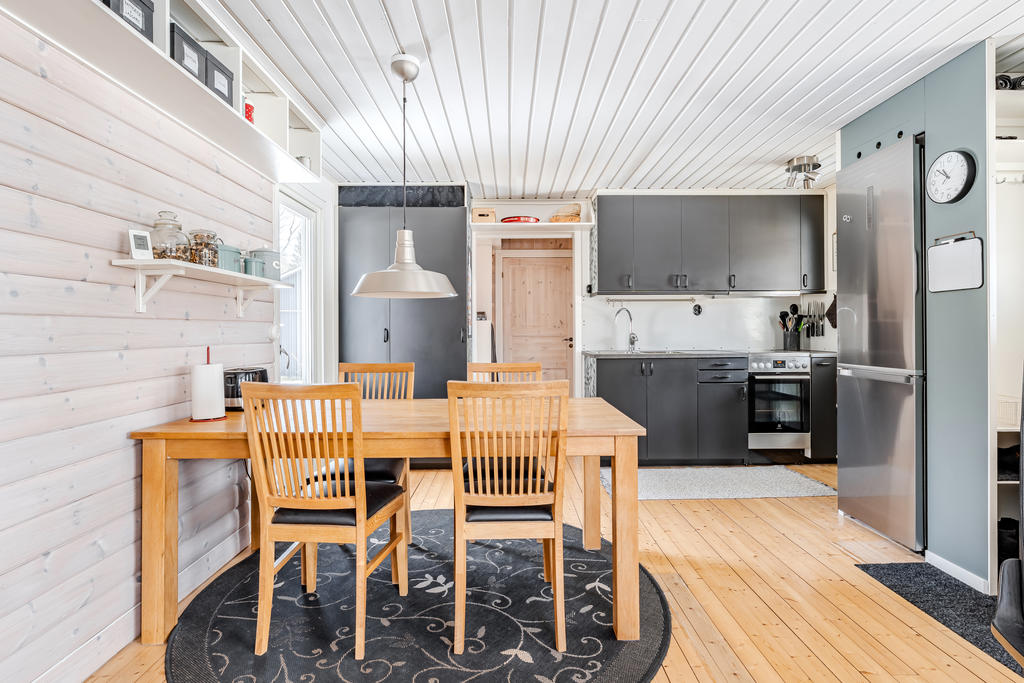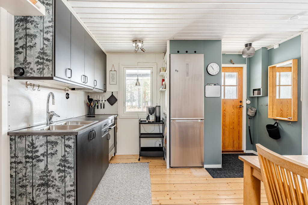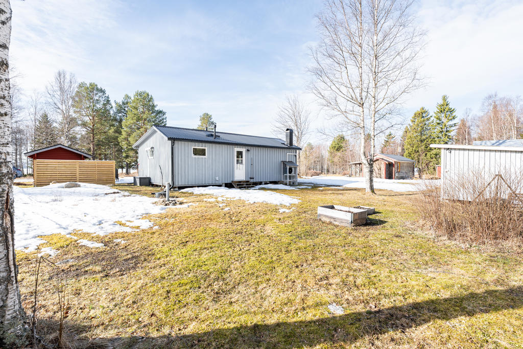 På tomten finns även en isolerad friggebod som möjliggör övernattning för gäster, perfekt när familj och vänner kommer på besök. Här lever man nära naturen på riktigt – säljarna har haft förmånen att följa både rådjurskid och harpaltars uppväxt på nära håll. Skogen ligger alldeles intill, vilket gör det enkelt att ge sig ut för att plocka bär och svamp utan att ens behöva ta bilen.