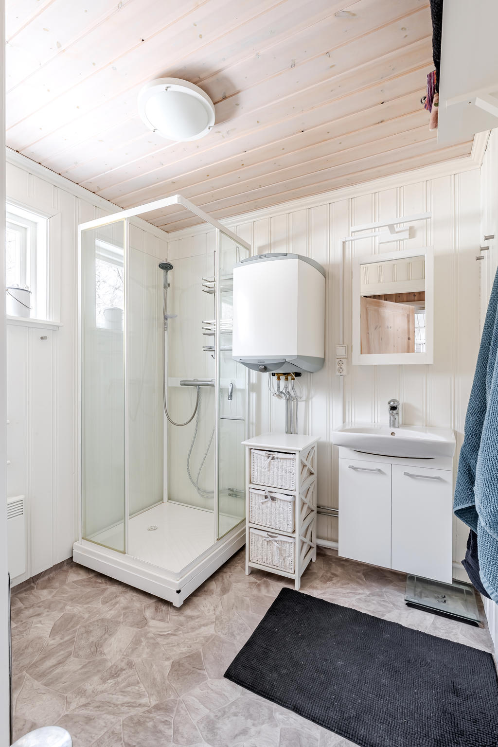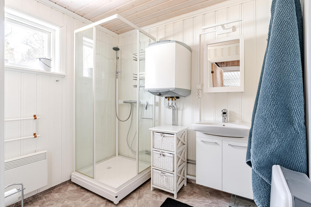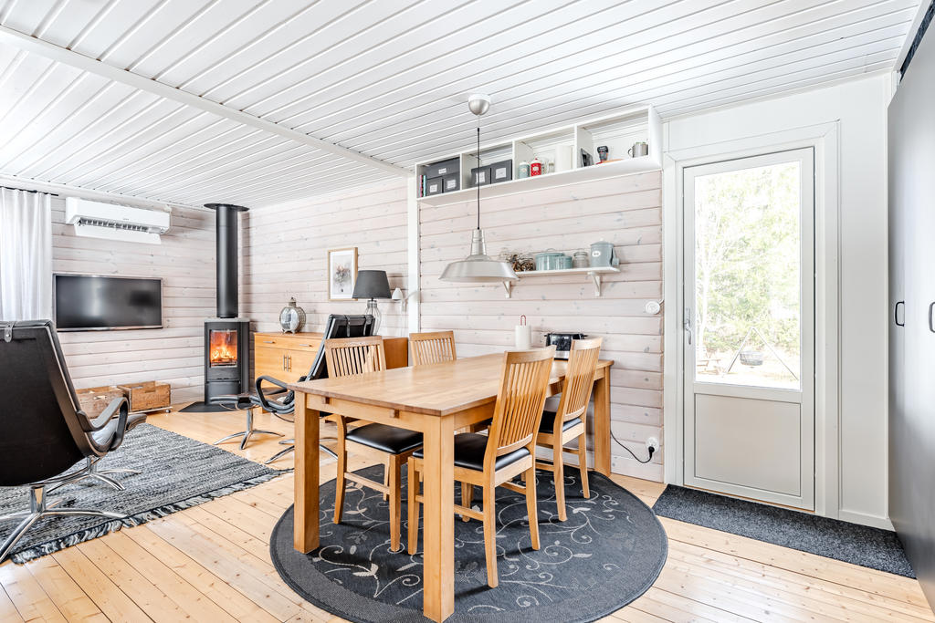 Stugan bjuder på en mysig atmosfär där kaminen blir en naturlig samlingspunkt – lika uppskattad under vinterhalvåret som under kyligare, regniga sommardagar. Det generösa badrummet och det rymliga sovrummet gör att stugan upplevs större än sin faktiska storlek och ger ett oväntat luftigt intryck.