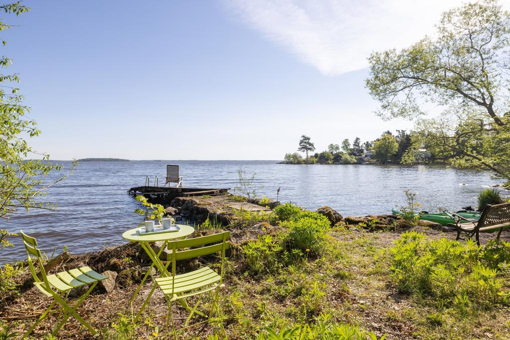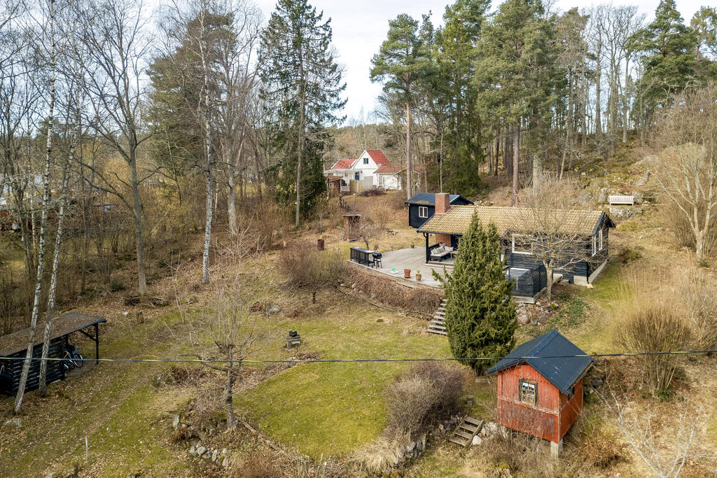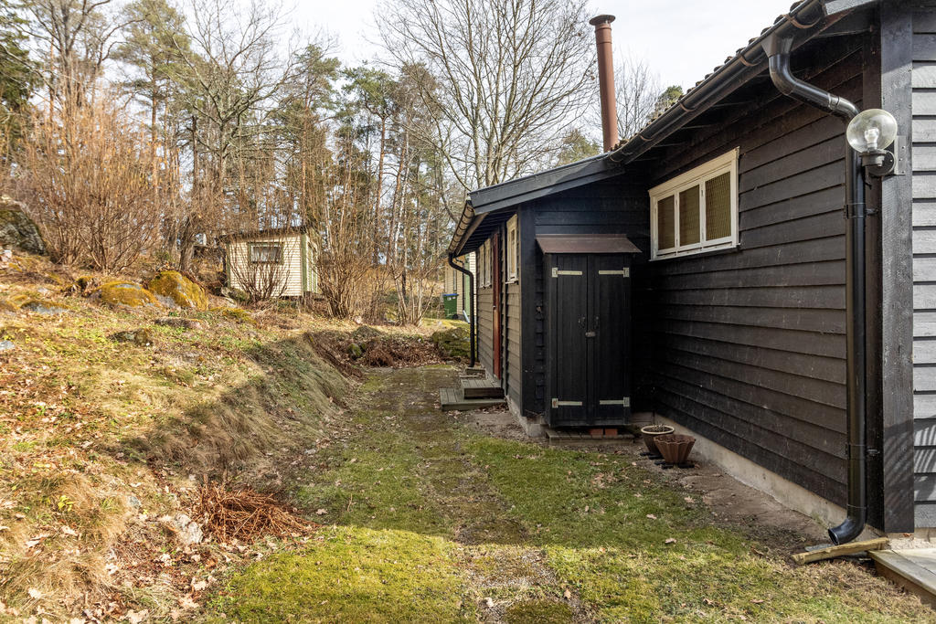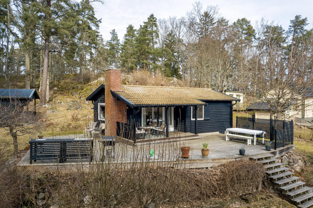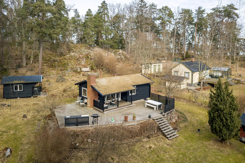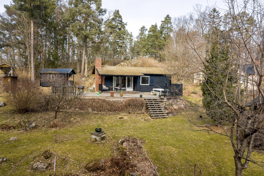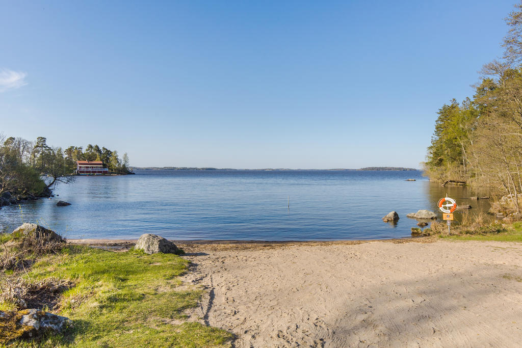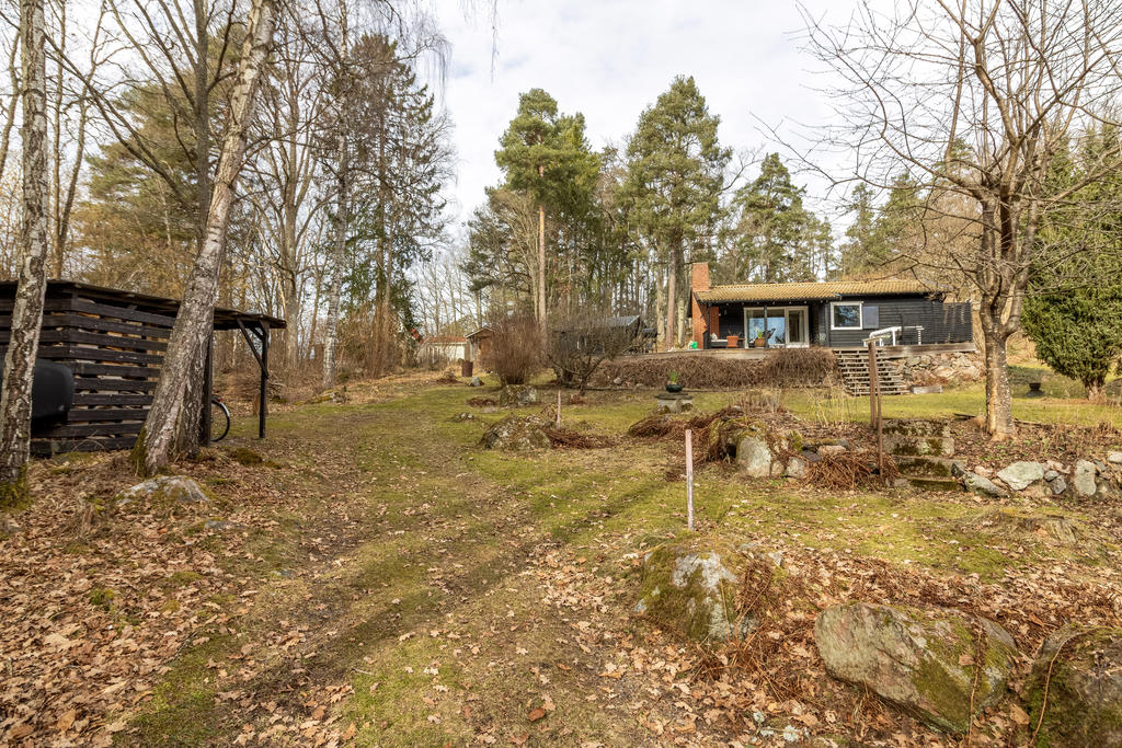 På en lummig och lättskött trädgård omgiven av höga träd och insynsskyddande häckar finner vi ett välvårdat fritidshus med Mälaren strax intill. En kort stig leder ned till klippbad och strax intill finns även en helt insynsskyddad liten strand och brygga. Området har många badplatser men här vid klipporna är du oftast ensam, och det känns nästan som ditt egna privata bad i skogen. Här njuter man av ljumma sommarbad medan kvällssolen sänker sig i horisonten. På vintern förvandlas skogsbacken ned till klipporna till en pulkabacke och Mälarens blanka spegel till skridskobana.