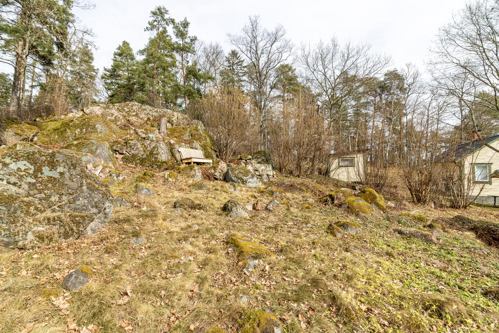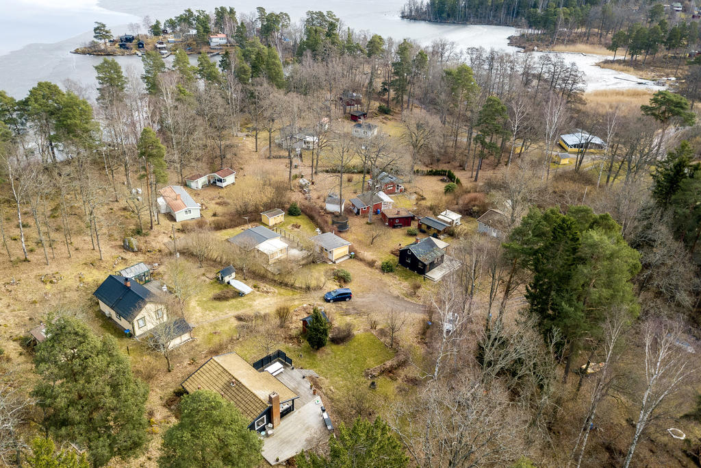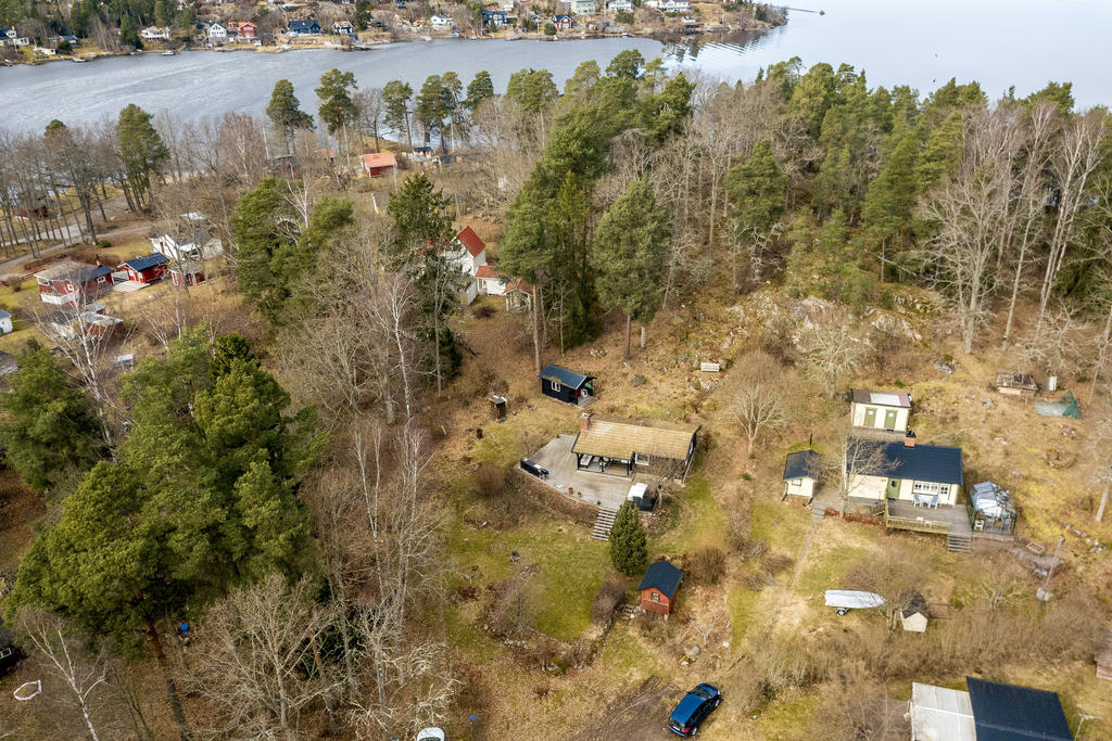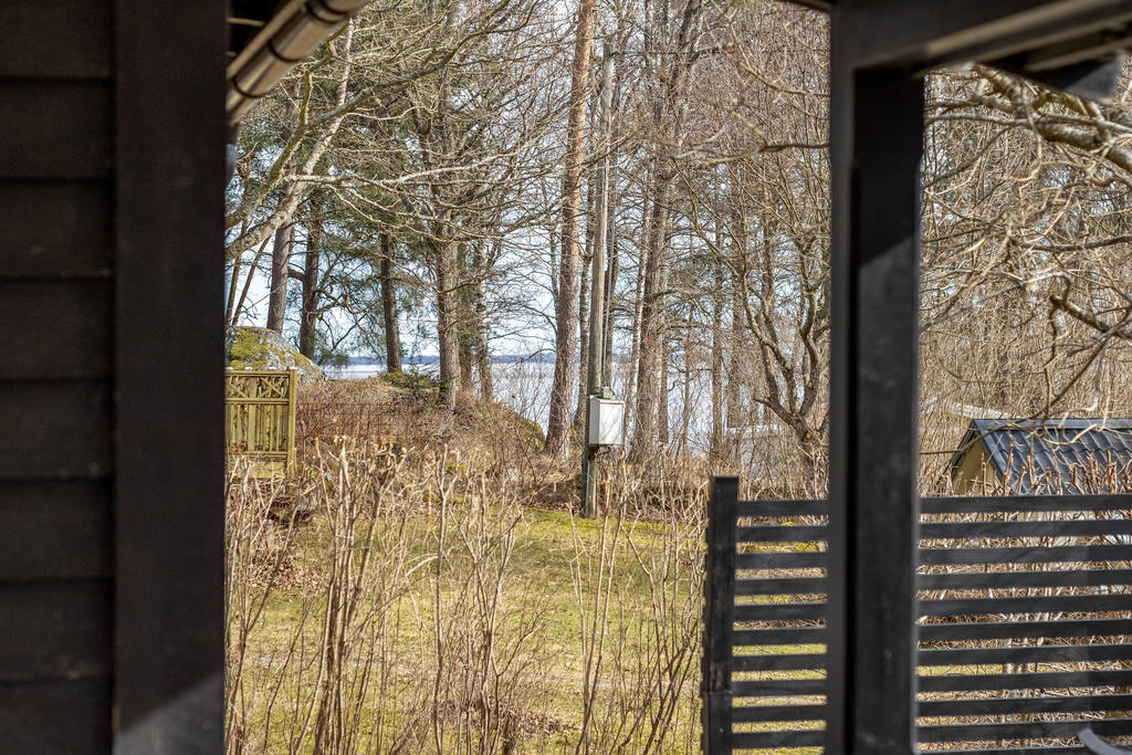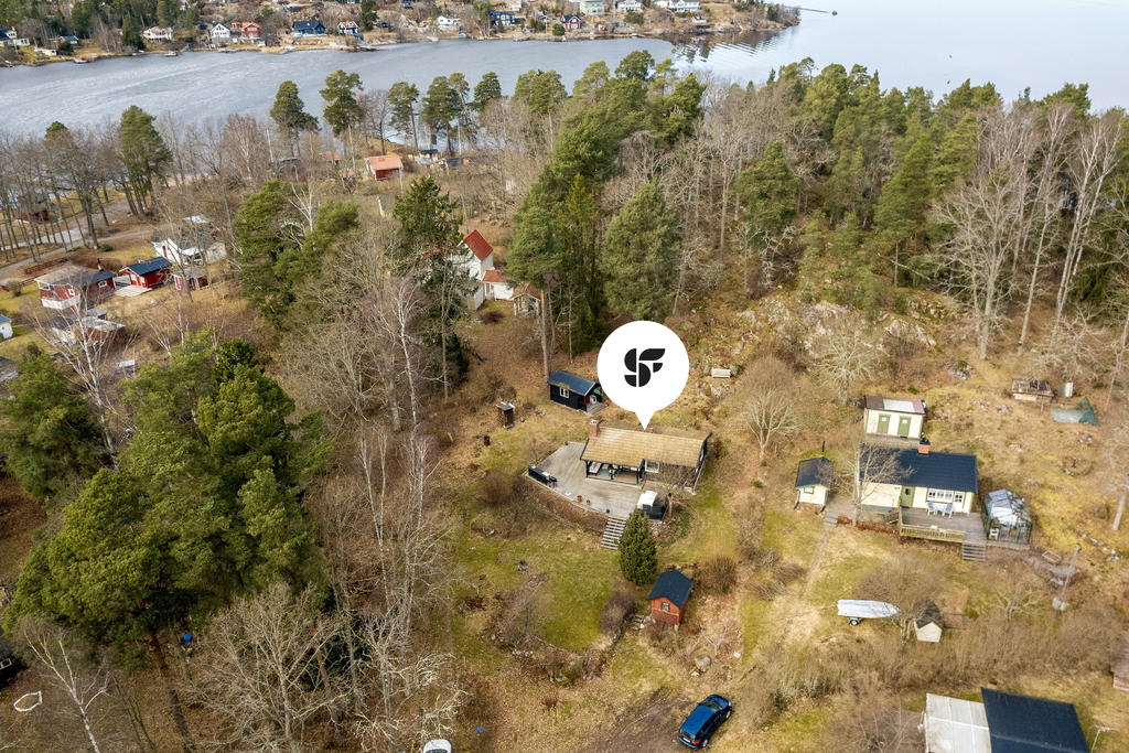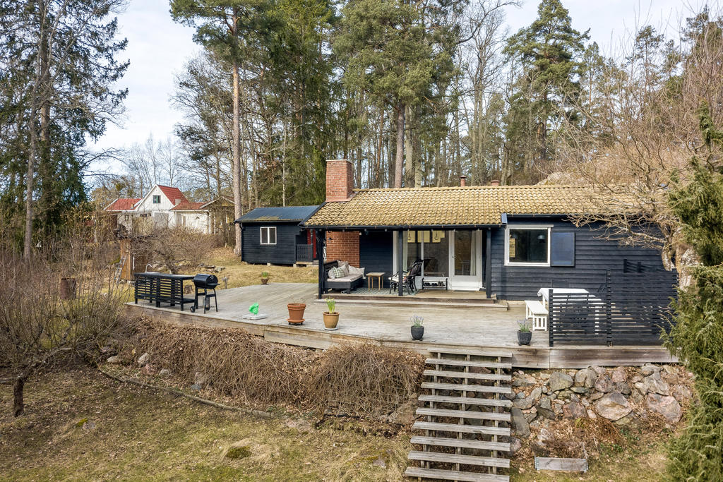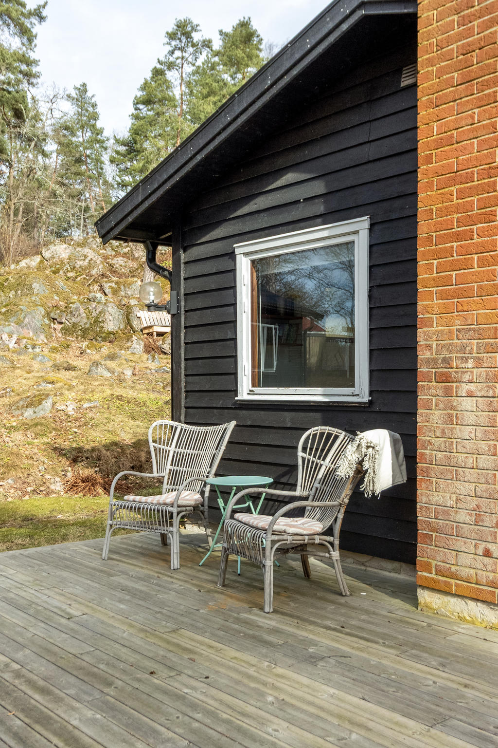 På en lummig och lättskött trädgård omgiven av höga träd och insynsskyddande häckar finner vi ett välvårdat fritidshus med Mälaren strax intill. En kort stig leder ned till klippbad och strax intill finns även en helt insynsskyddad liten strand och brygga. Området har många badplatser men här vid klipporna är du oftast ensam, och det känns nästan som ditt egna privata bad i skogen. Här njuter man av ljumma sommarbad medan kvällssolen sänker sig i horisonten. På vintern förvandlas skogsbacken ned till klipporna till en pulkabacke och Mälarens blanka spegel till skridskobana.