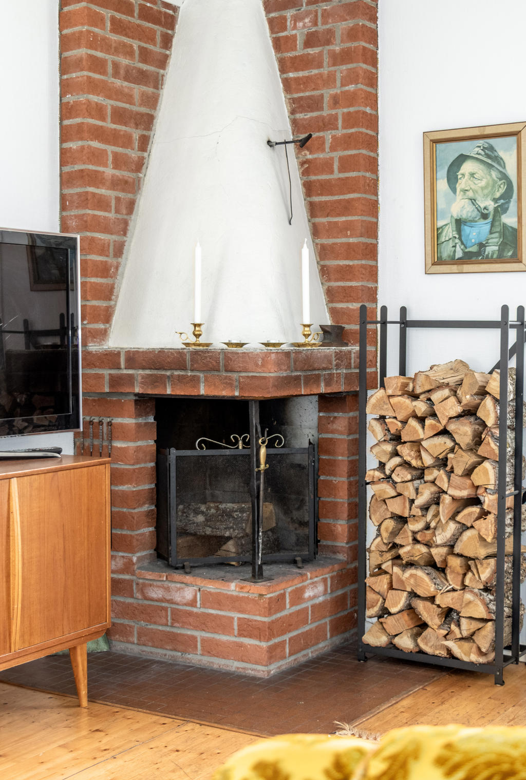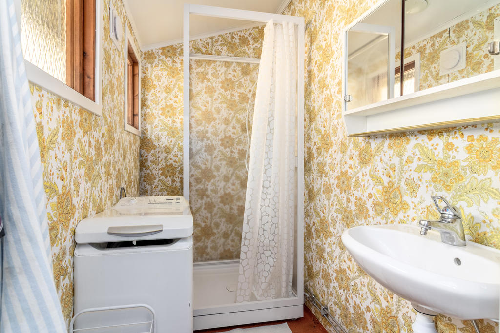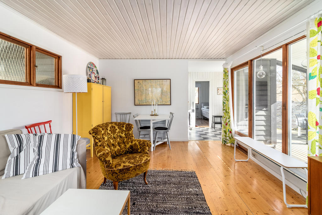 Stugan, om ca 50 kvm, uppfördes 1974 och rymmer ett arbetskök med matplats intill fönstret, vardagsrum med öppen spis, två sovrum samt duschrum och separett. De sociala ytorna är generösa med direkt anknytning mellan vardagsrum och stort öppet altandäck med utsikt över trädgården. Generösa fönsterpartier och det höga läget ger ett naturligt ljus åt ytorna inomhus och altandäckets läge i syd-väst ger sol hela dagen fram till kvällsgrillen.