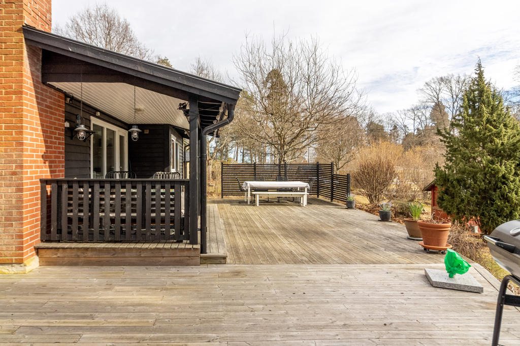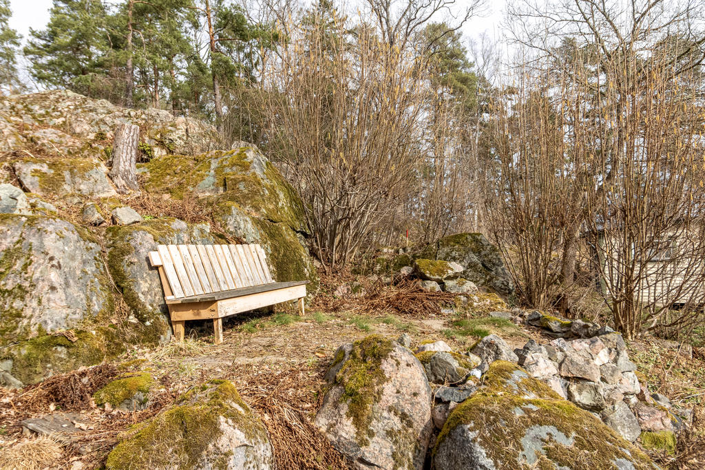 Den uppväxta trädgården är kuperad med flera naturliga trädgårdsrum i både sol och skugga. Bänken mot bergsväggen på baksidan är familjens lilla hemlig-hörna med magisk utsikt. Från flera platser i trädgården och altanen har sjöutsikt åt två håll.