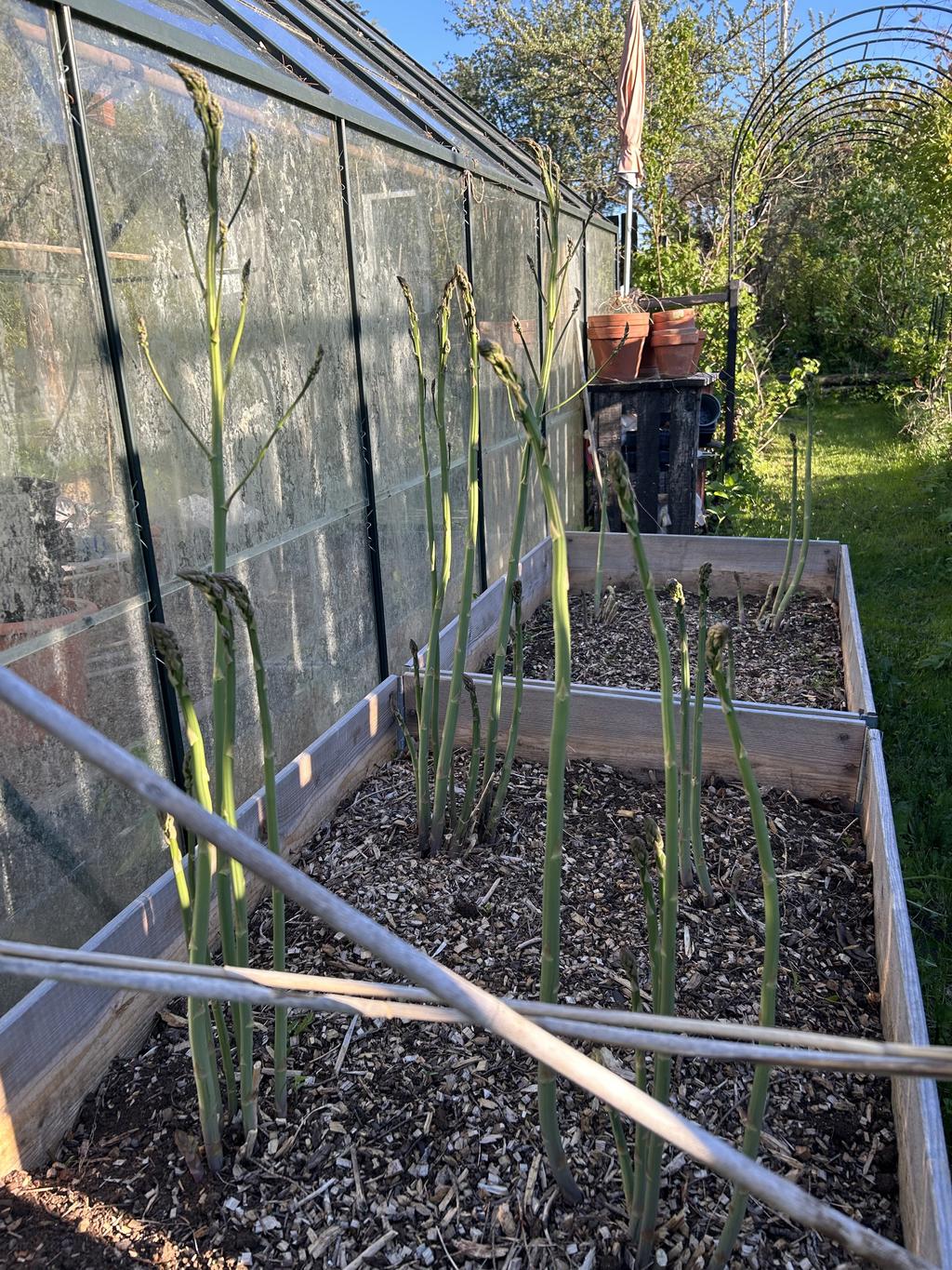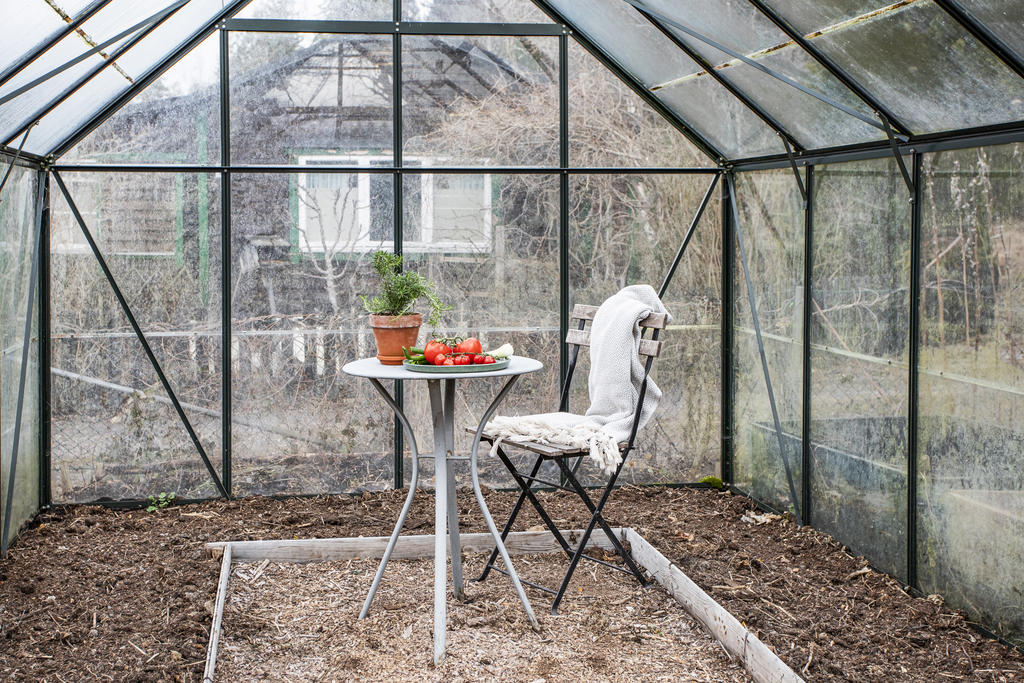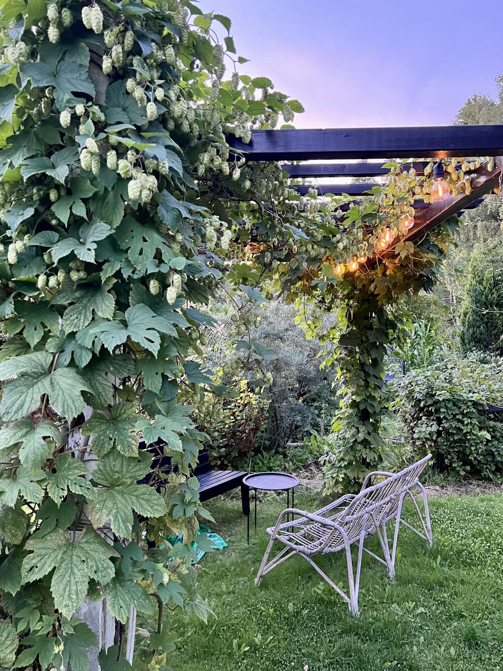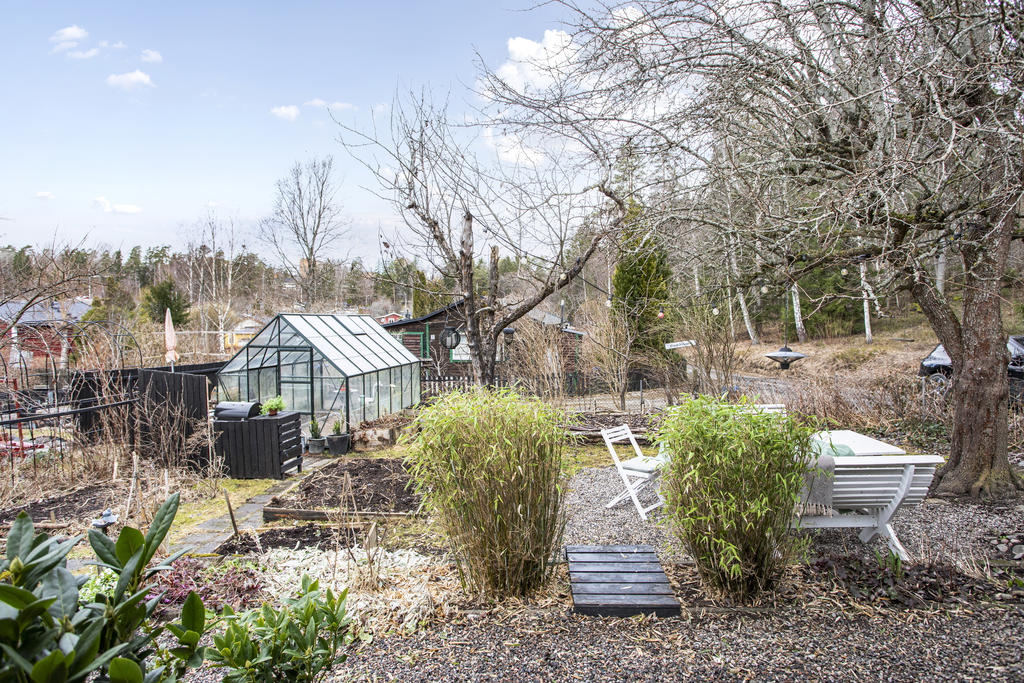 Trädgården är en dröm för odlingsentusiasten! Här finns ett charmigt växthus där tomatplantorna trivs som allra bäst, tillsammans med flera bärbuskar och fruktträd som ger skörd och njutning genom hela säsongen.