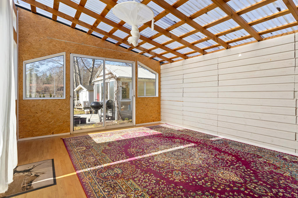 Från köket kommer vi ut i ett inglasat uterum med högt i tak och magiskt ljusinsläpp.