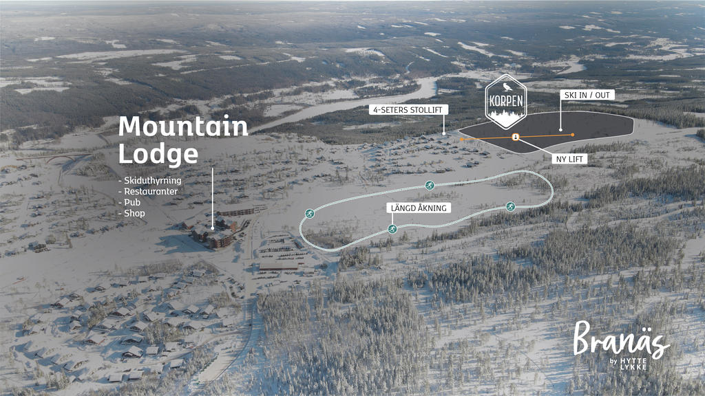 På Korpen kommer de flesta stugorna att byggas med Ski in – Ski out och i området kommer även finnas skidlift samt ett eget snösystem. Området ligger på en liten höjd, och många av tomterna kommer att få en vacker utsikt och mycket goda solförhållanden. Den tidigare nämnda liften kommer att ge dig direktkontakt med hjärtat av Branäs skidsystem där tillgänglighet erbjuds till skidåkning som tillfredsställer såväl nybörjaren som den mer rutinerade åkaren. Korpen har ett av de bästa lägena i Branäs.