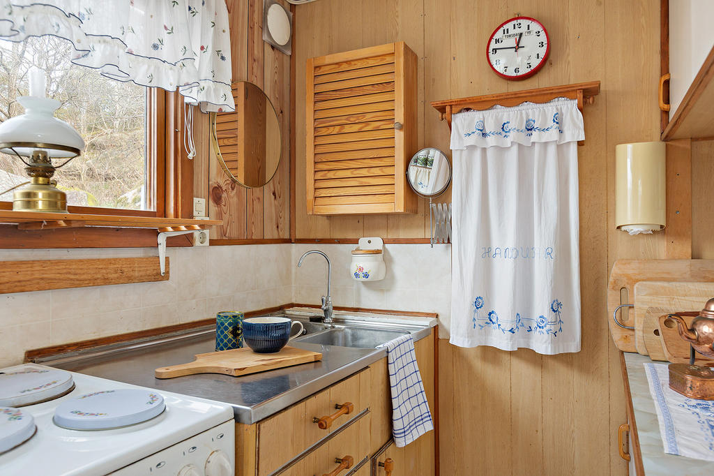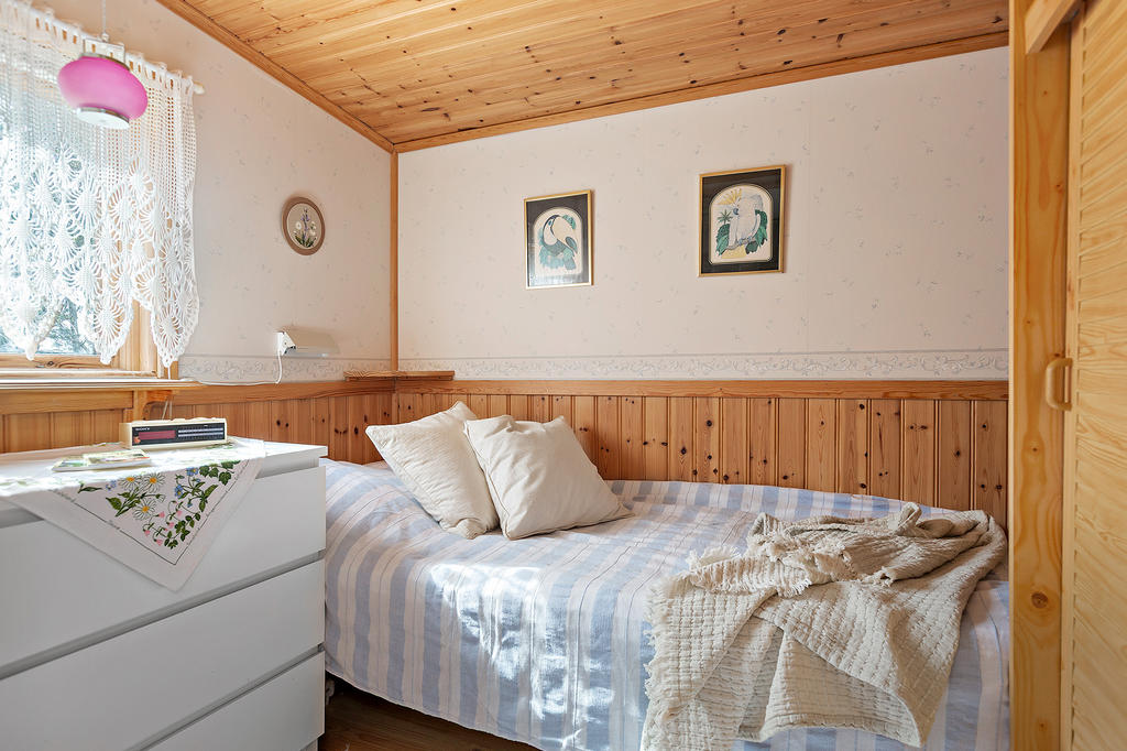 Här ligger en charmig röd stuga om 27 kvm, inbäddad i grönska och med en planlösning som rymmer allt du behöver: hall med plats för ett mindre bord och två stolar, ett välkomnande litet kök, en trivsam vardagsrumsdel och en mysig sovplats att krypa ner i efter långa sommardagar.