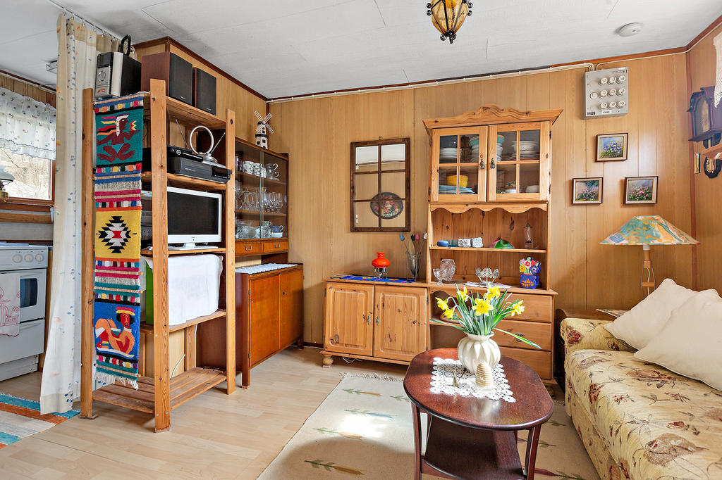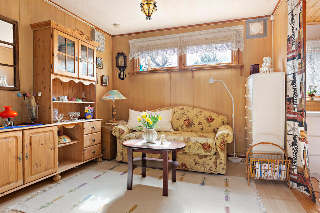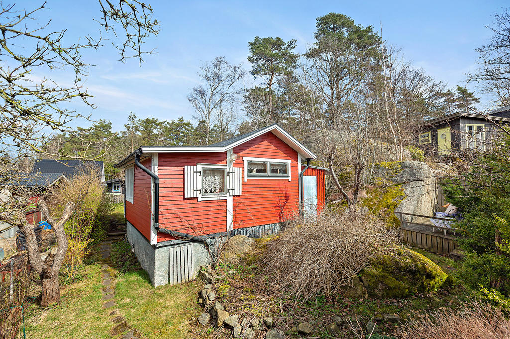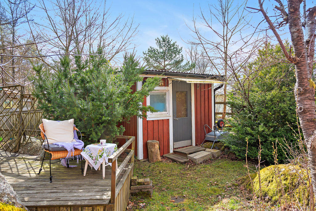 Praktiska utrymmen finns i form av ett fristående förråd bakom stugan samt ytterligare ett förråd vid sidan – perfekt för allt från trädgårdsredskap till sommarens projekt.