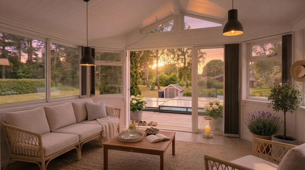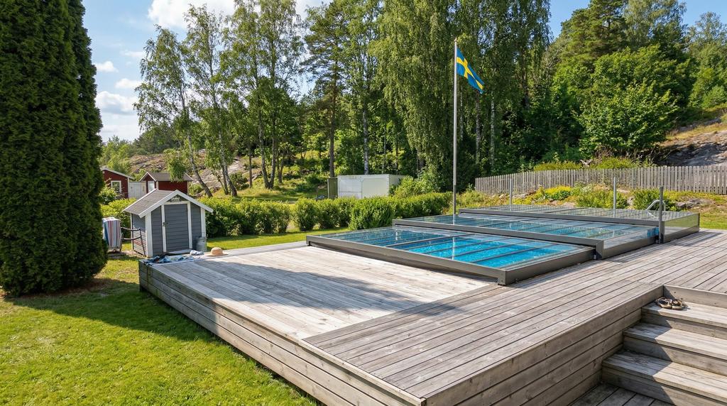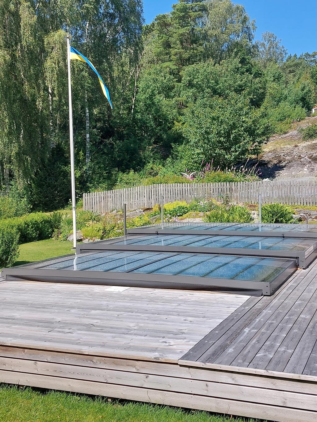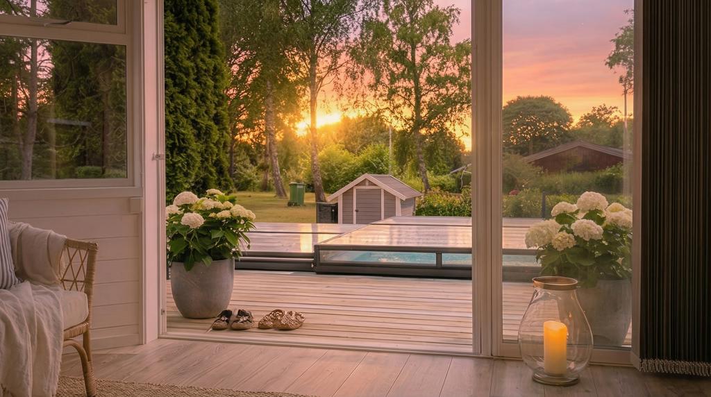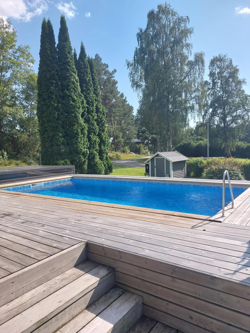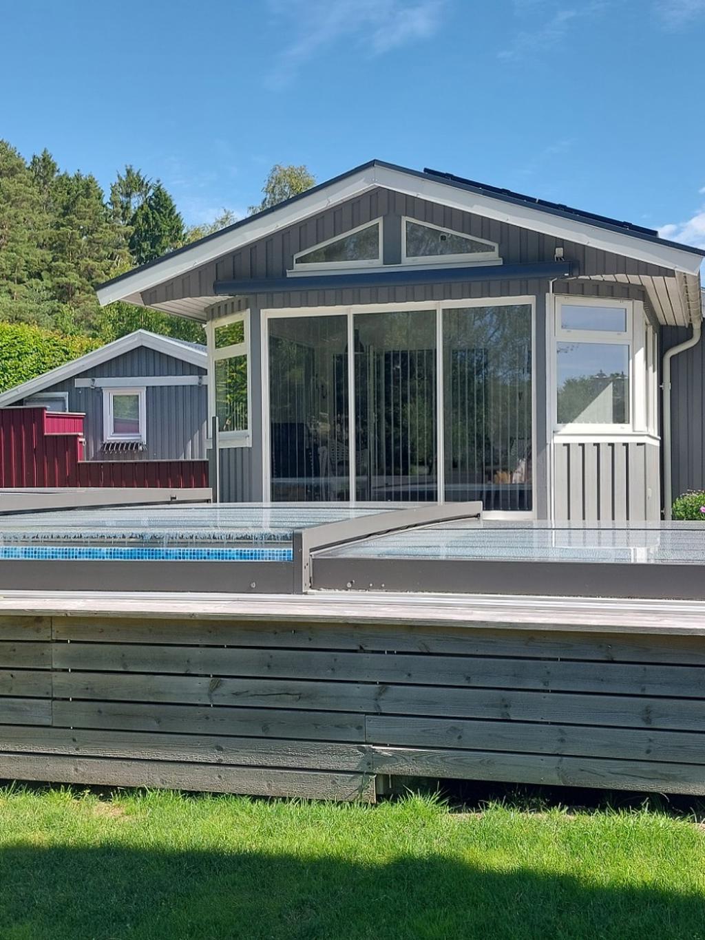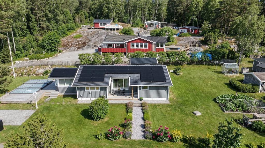 Själva huset har genomgått en omfattande förvandling och erbjuder idag en välplanerad planlösning med hall, badrum, två sovrum, kök samt vardagsrum och matplats i en social och öppen känsla. Här möts sommarhusets charm och modern komfort i fin balans. Braskaminen sprider värme och stämning under årets svalare månader och solcellerna bidrar till både hållbarhet och lägre driftkostnader. Från det härliga uterummet leds ni vidare ut till en riktig oas – poolområdet. Här förlängs sommaren och dagarna fylls av bad, skratt och långa måltider under bar himmel. En plats för både stilla morgnar och livliga sommarkvällar. Uteplatser finns att tillgå oavsett om man söker tak över huvudet, skydd ifrån solen eller vill pressa i solstolen.