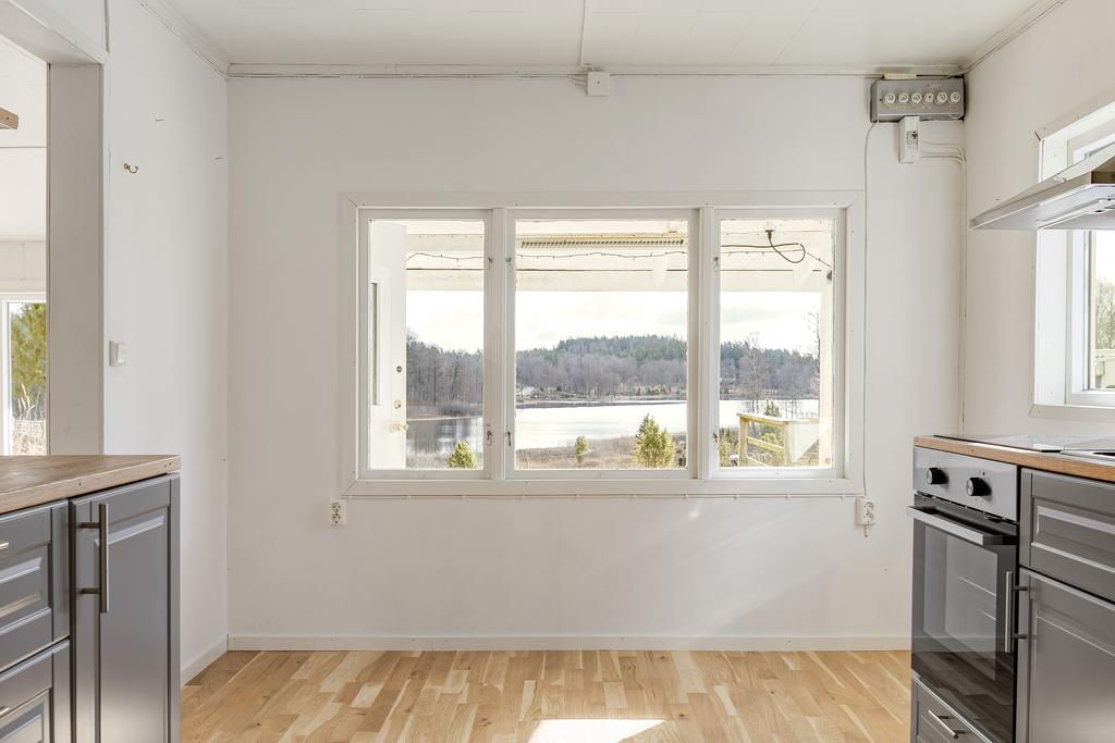 Nytt fräscht kök med gråa stilrena luckor och matplats med fin utsikt mot sjön.
