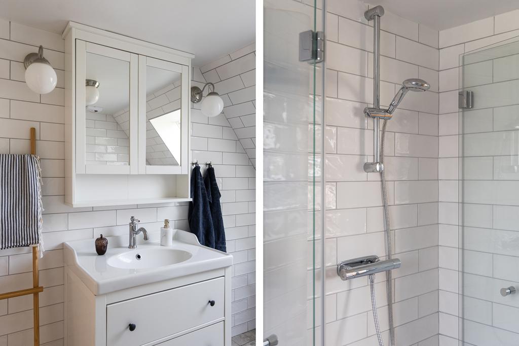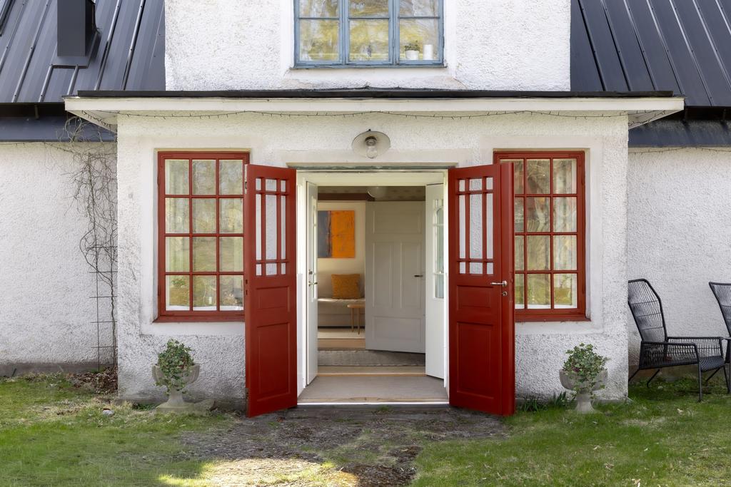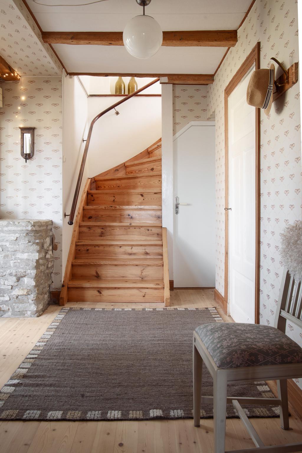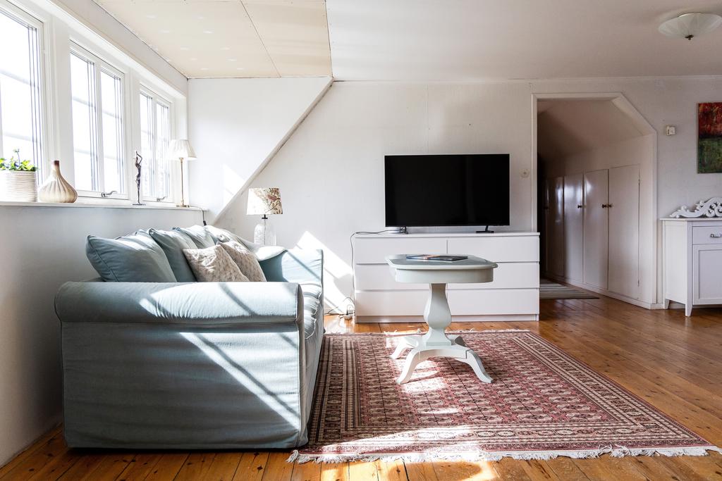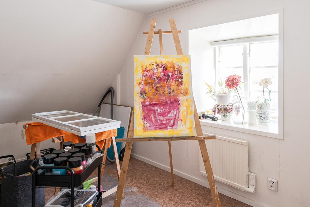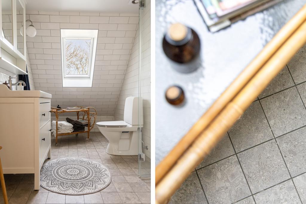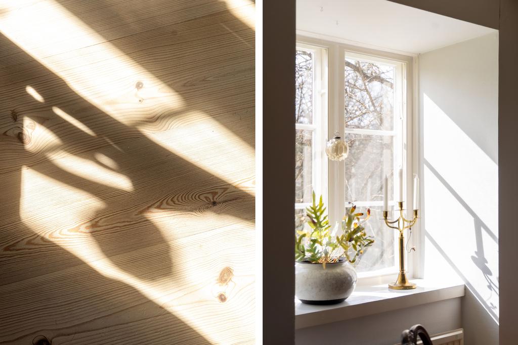 På entréplanet finns kök, vardagsrum och matsal i fil samt glasveranda mot gårdssidan. Övre plan rymmer allrum, sovrum och badrum.