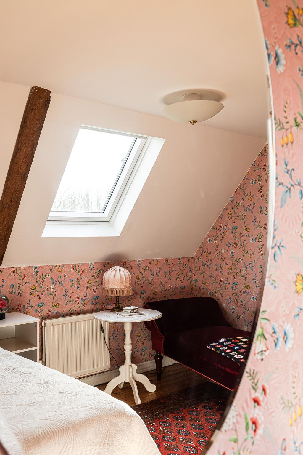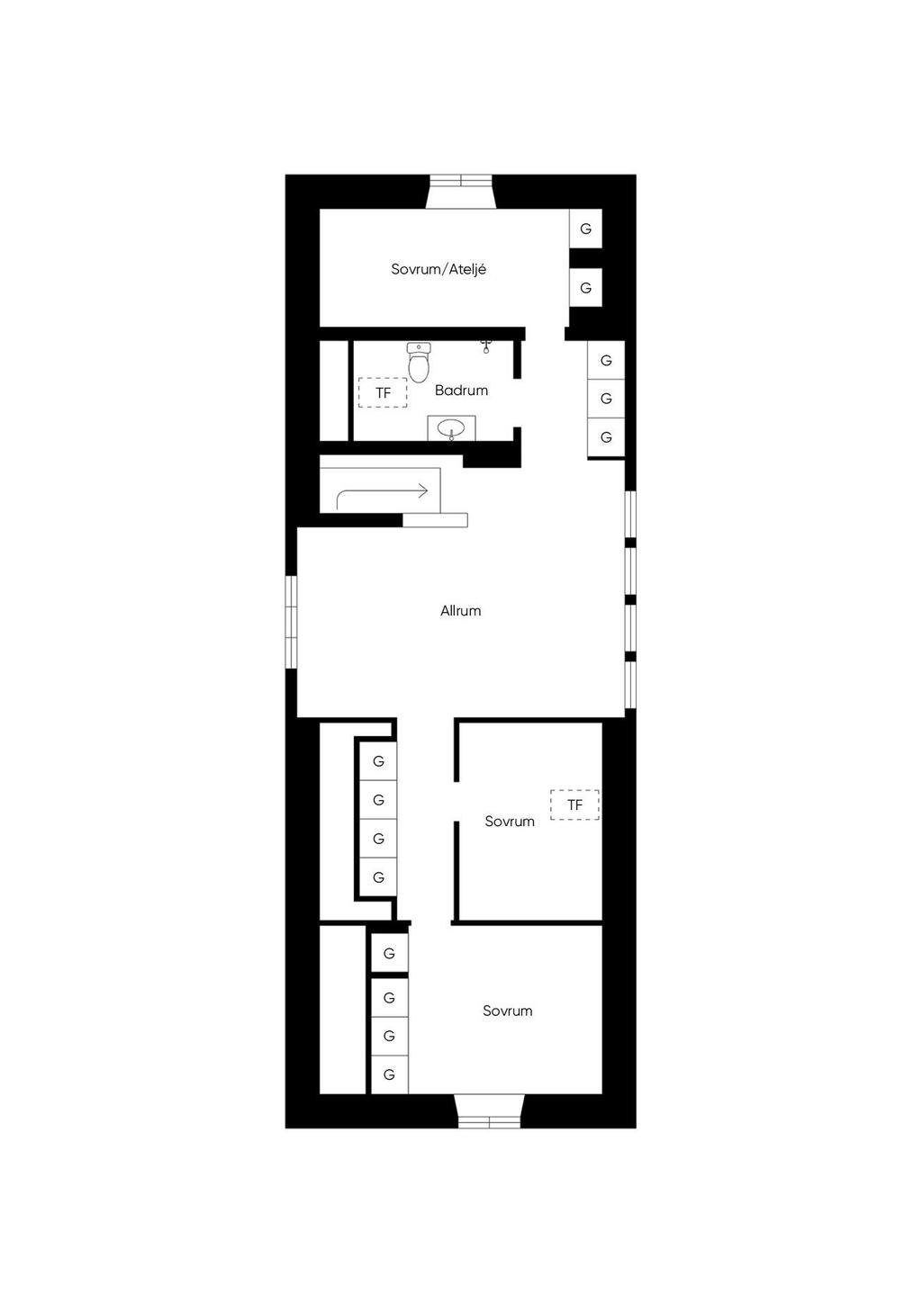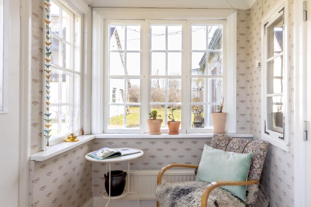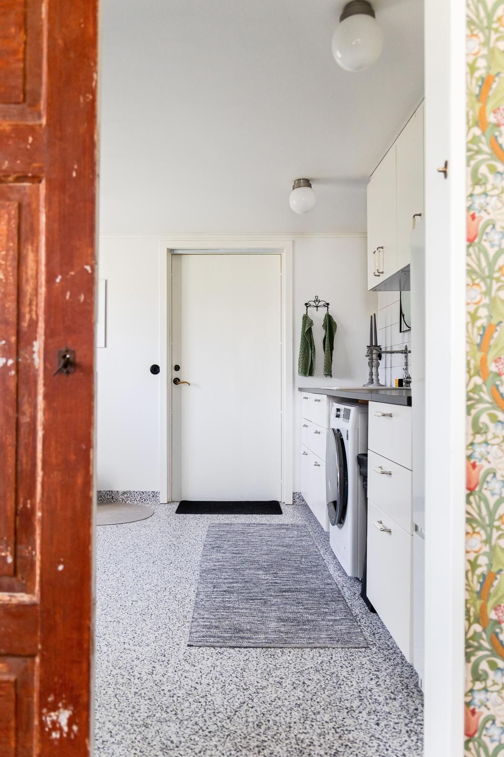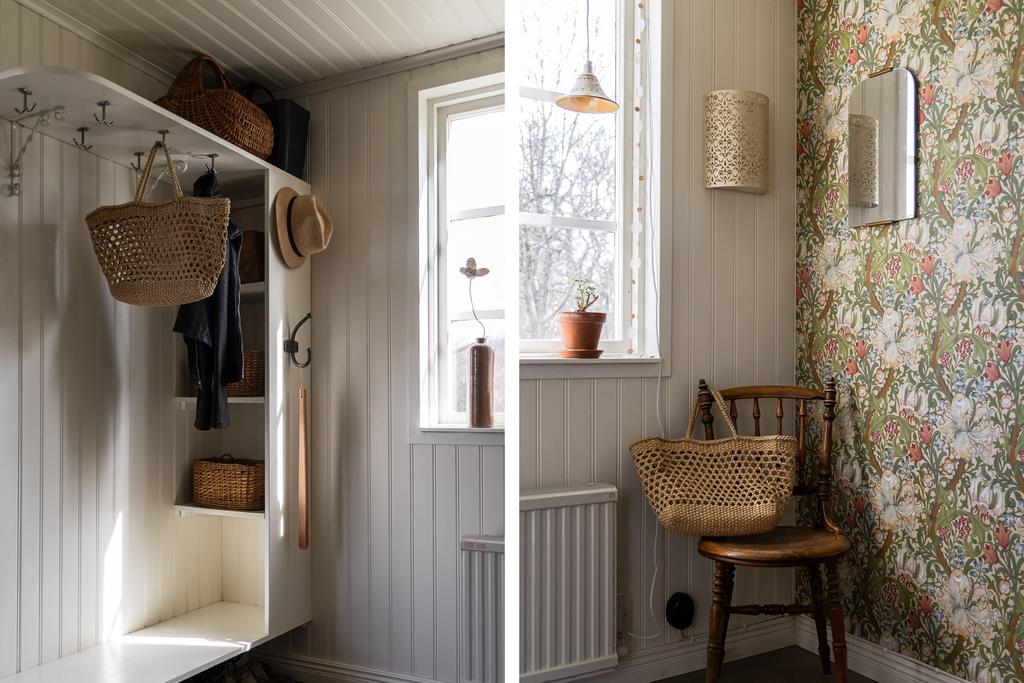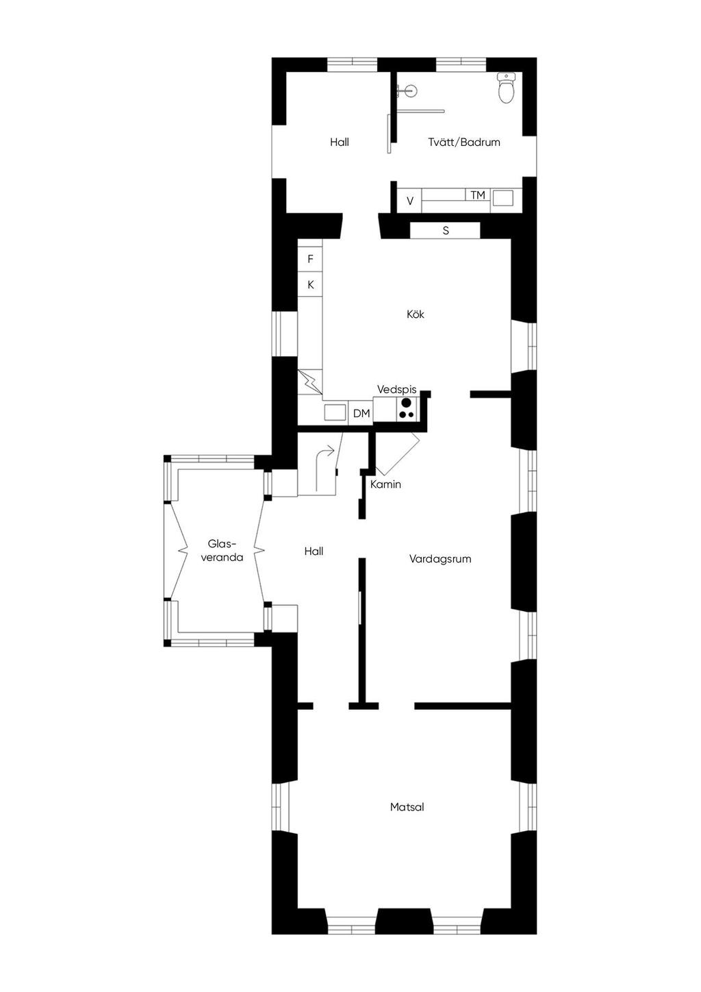 På entréplanet finns kök, vardagsrum och matsal i fil samt glasveranda mot gårdssidan. Övre plan rymmer allrum, sovrum och badrum.