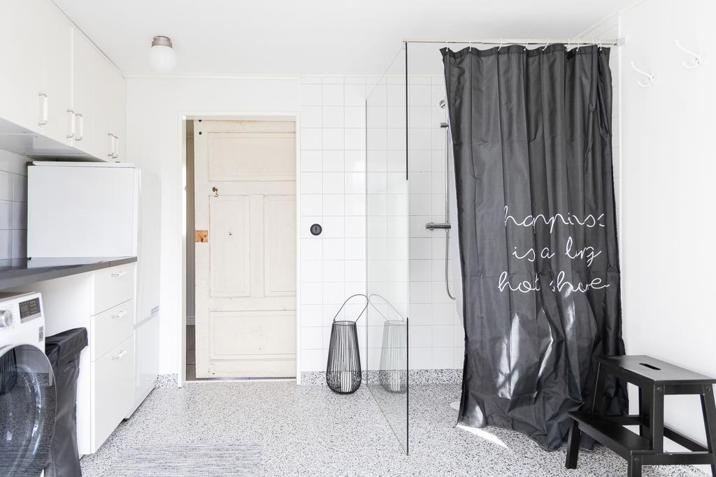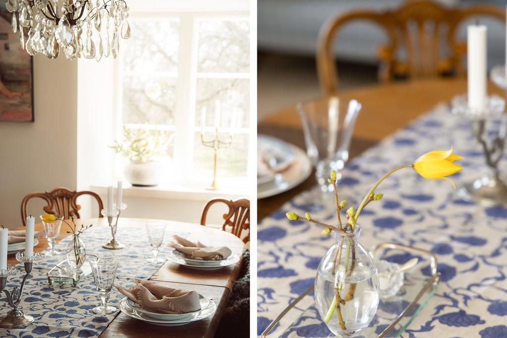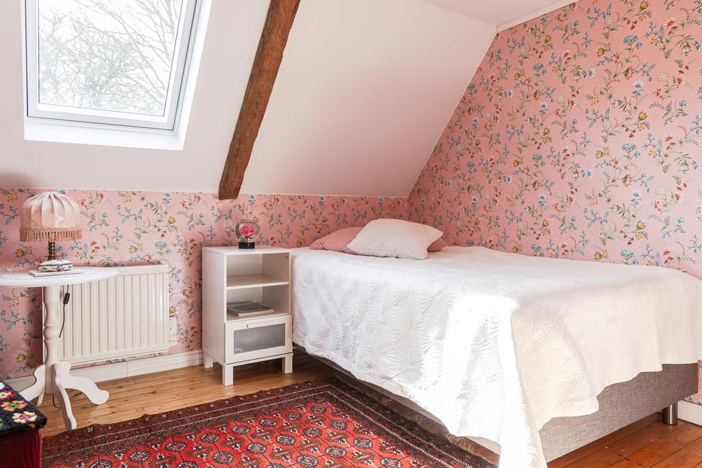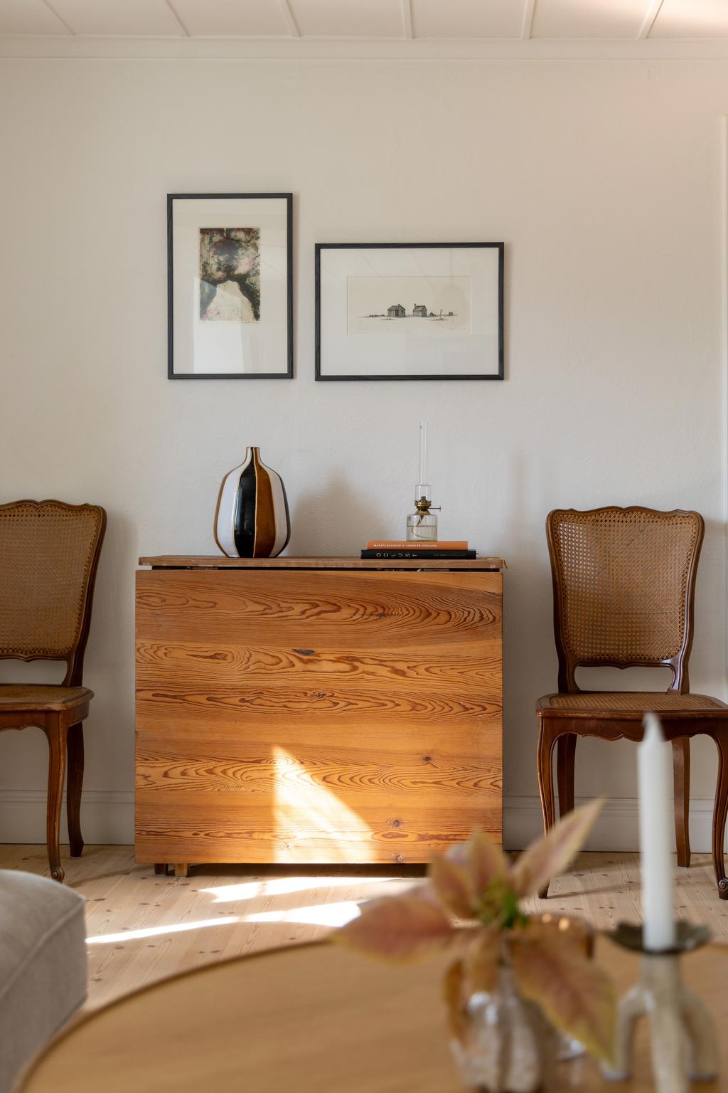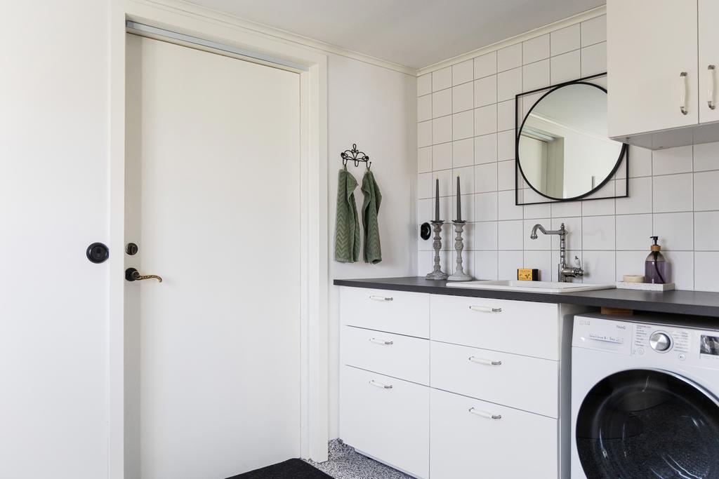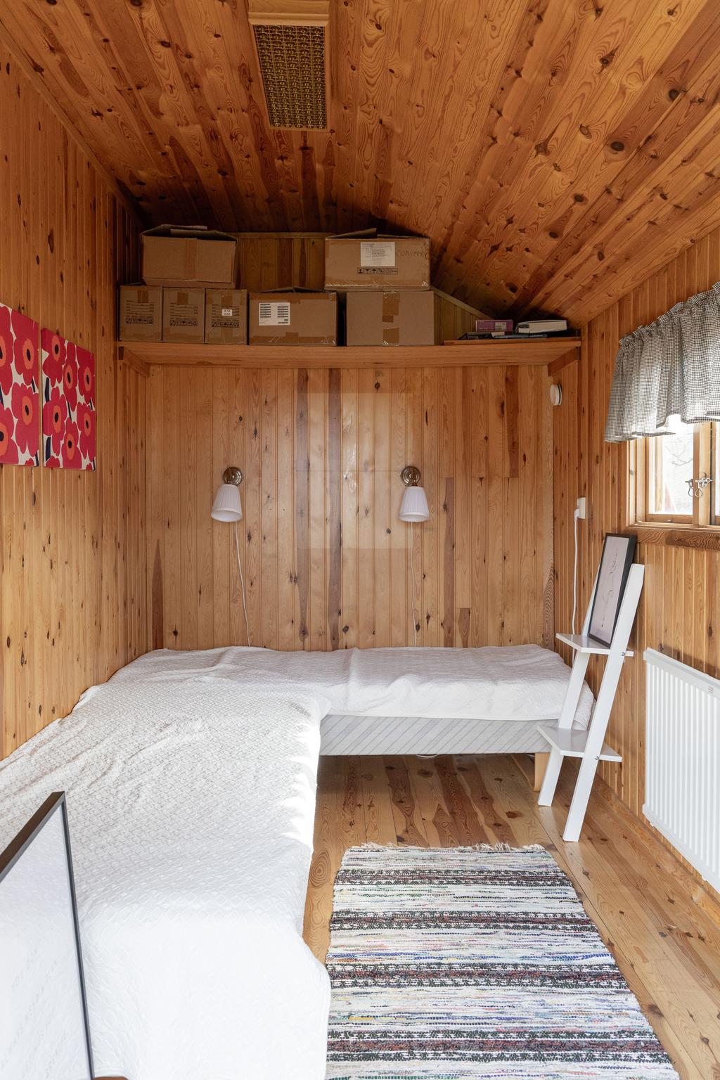 På entréplanet finns kök, vardagsrum och matsal i fil samt glasveranda mot gårdssidan. Övre plan rymmer allrum, sovrum och badrum.