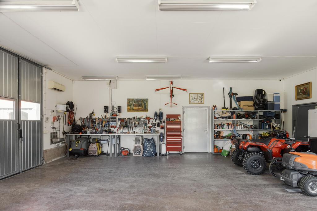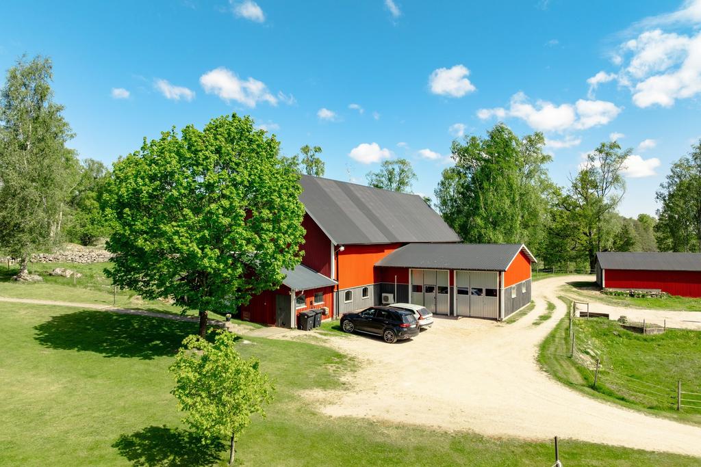 Den nybyggda verkstaden om cirka 100 kvm erbjuder välplanerade och funktionella arbetsytor, perfekt för såväl hobbyverksamhet som professionellt arbete. Ladugården är utrustad med 4 hästboxar samt ytterligare ytor för förvaring och arbete, vilket gör gården mycket väl anpassad för hästhållning, även med belyst paddock. Därtill finns ett rymligt traktorgarage om cirka 130 kvm som effektivt fyller sitt syfte för maskin- och fordonsförvaring.
