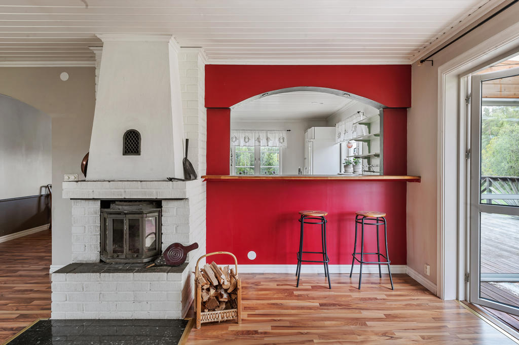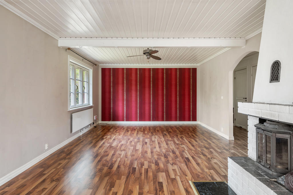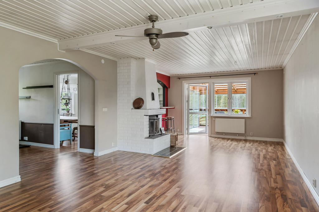 Vardagsrummet är rymligt då det var ett sovrum till här tidigare, har en braskamin och utgång till uterummet som sedan tar dig vidare till uteplatsen som ligger högt och i bästa söderläge.